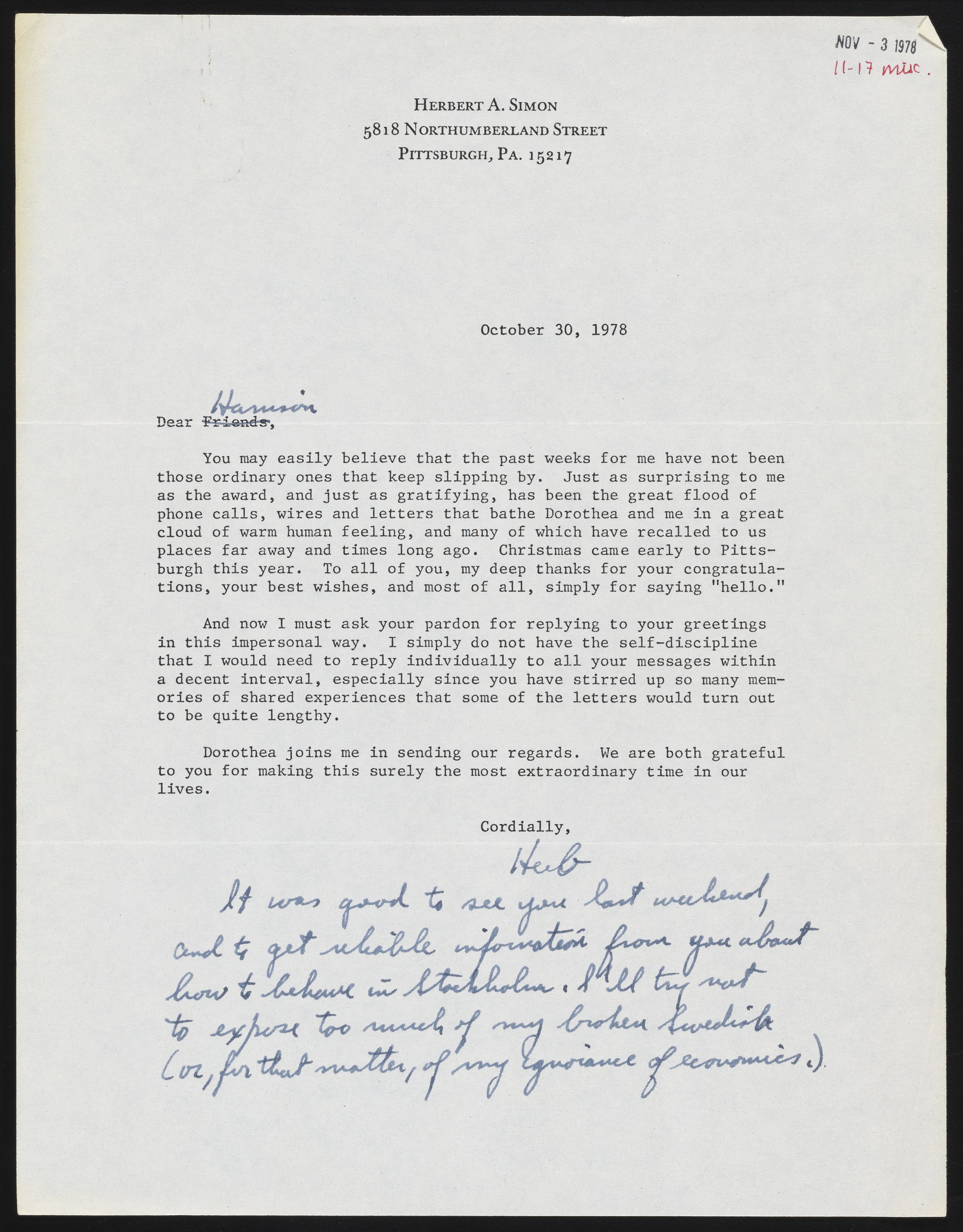 Acknowledgement of congratulatory note on the occasion of Simon being awarded the 1978 Nobel Prize in Economics.