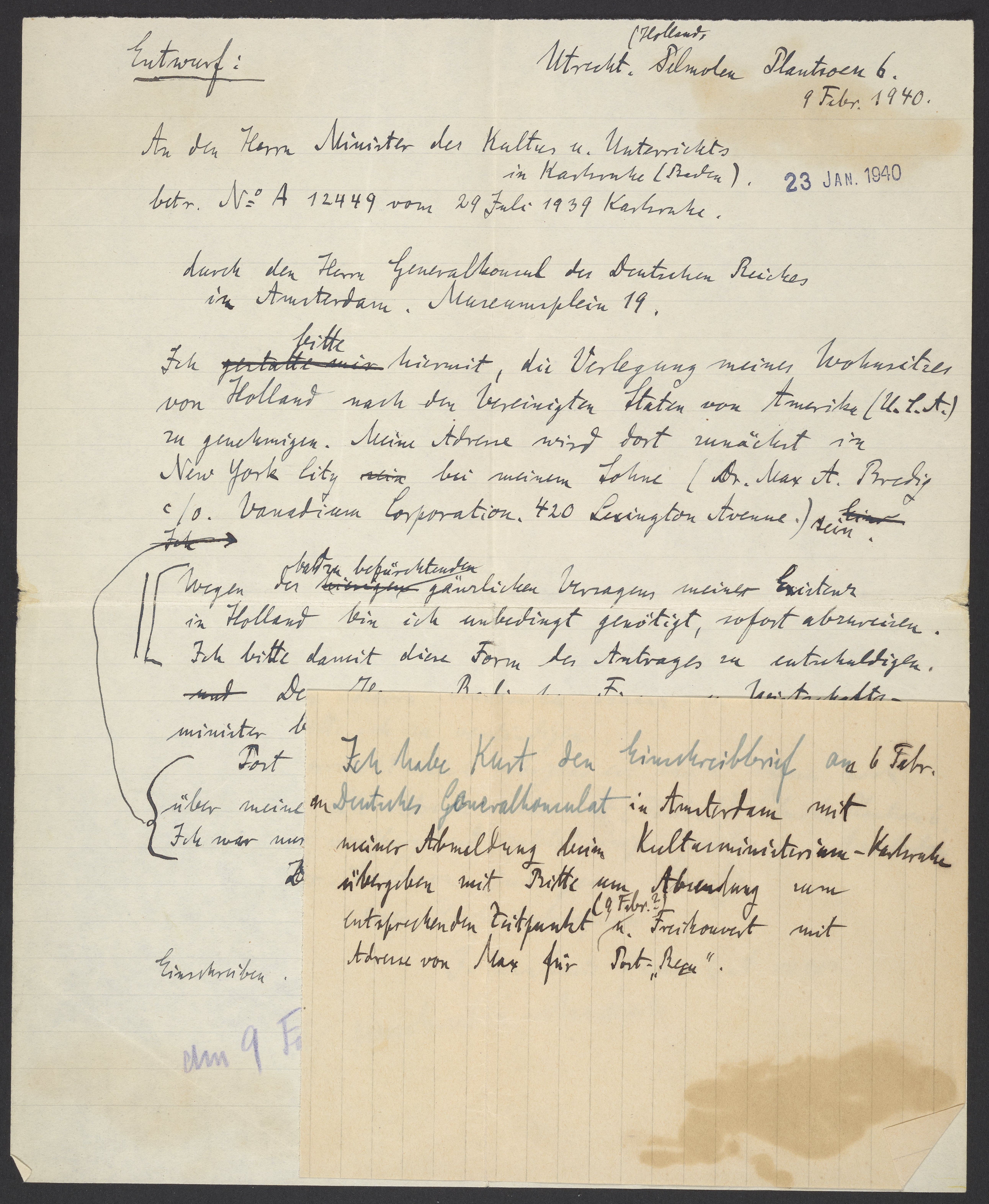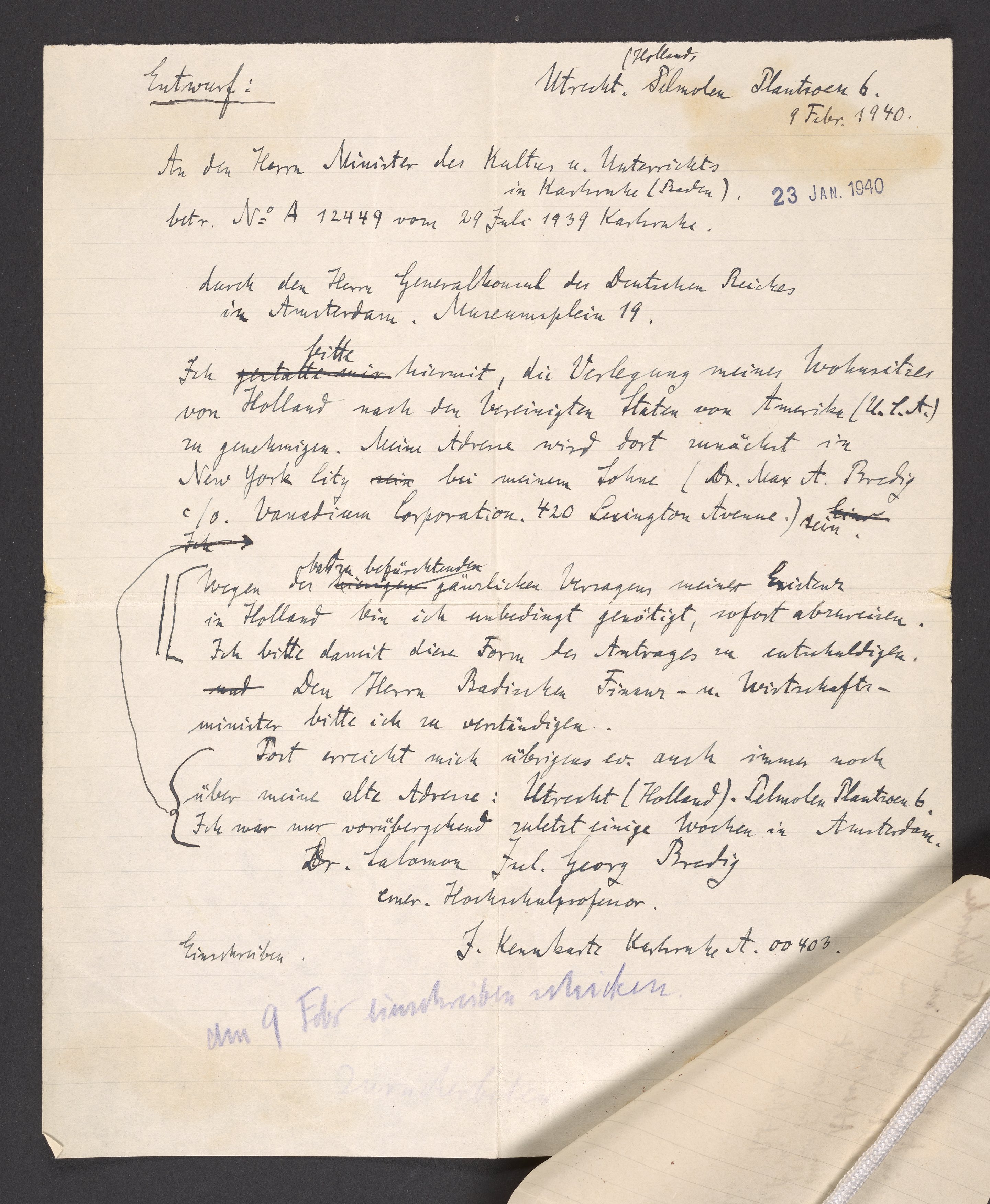 Letter written by Georg Bredig to Minister of Culture and Education, February 1940