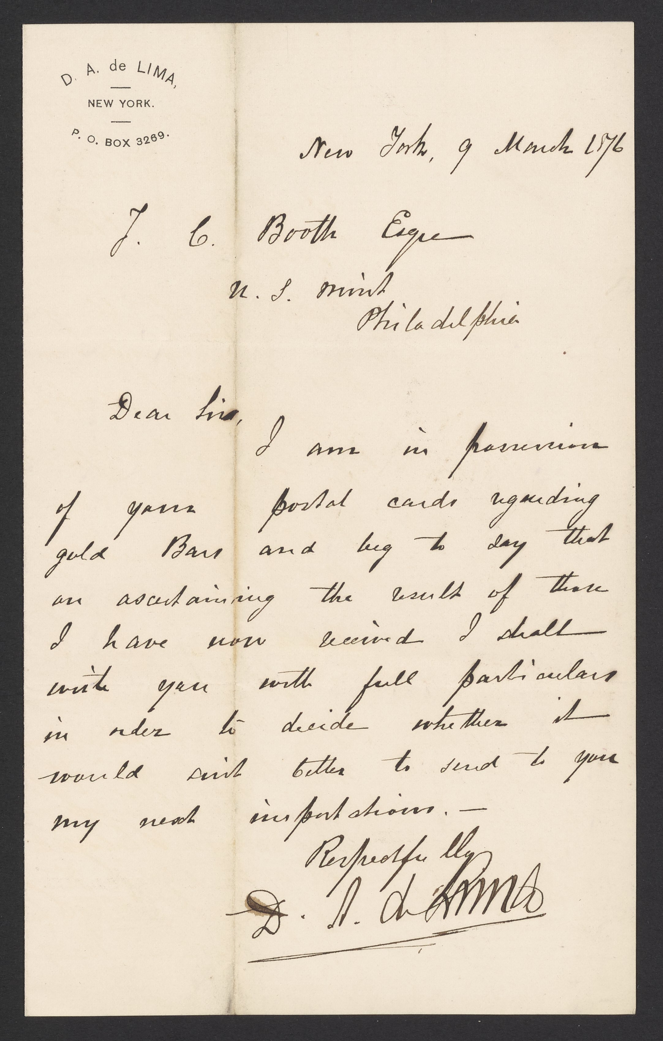 D. A. de Lima writes to James Curtis Booth (1810-1888) concerning gold bars.