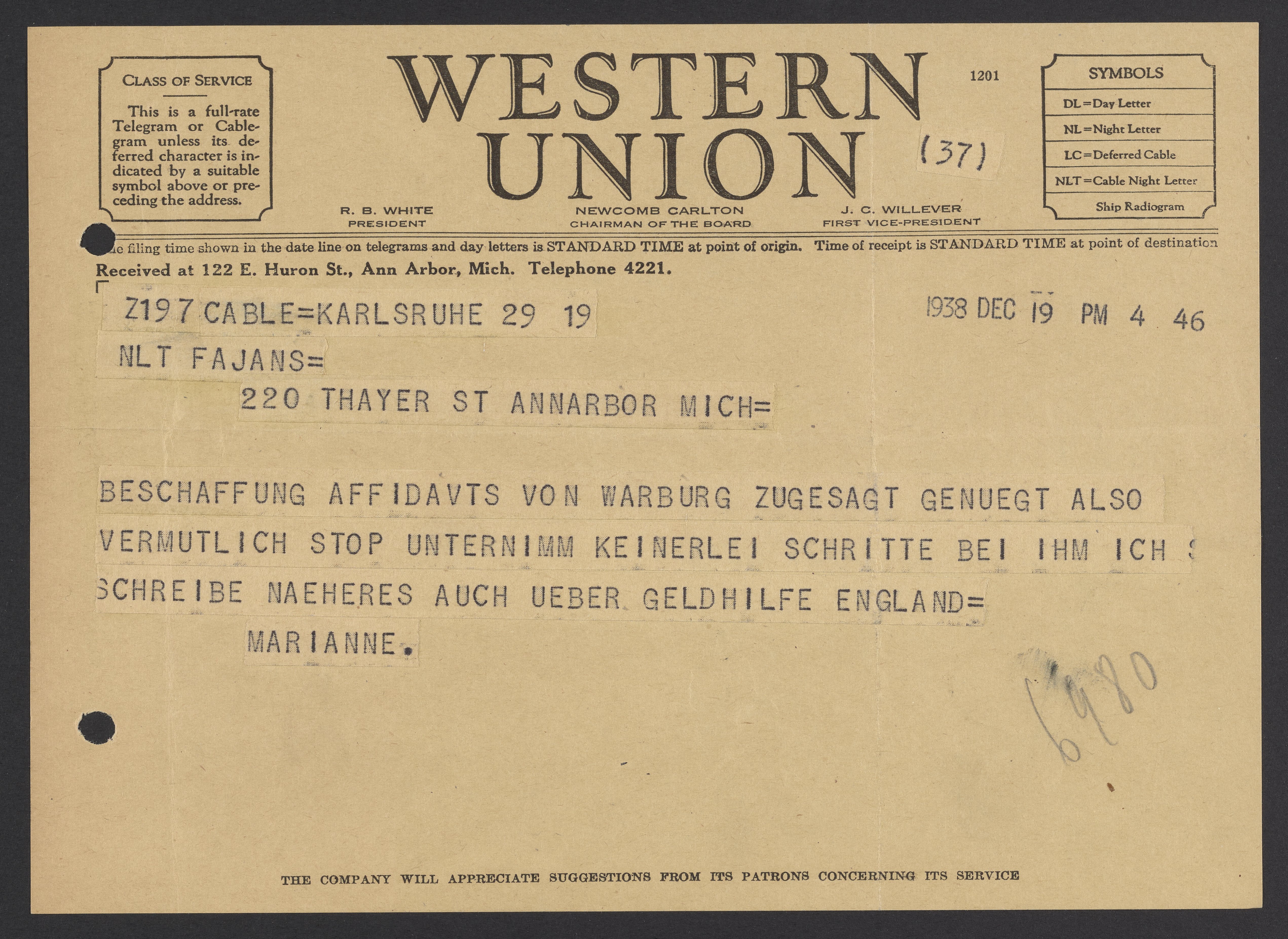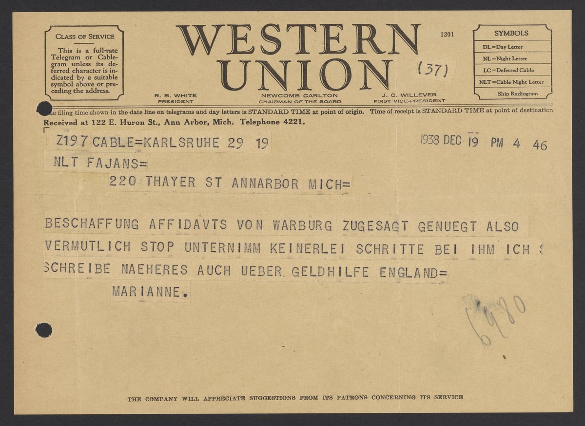 Telegram from Marianne Homburger to Max Bredig, December 19, 1938