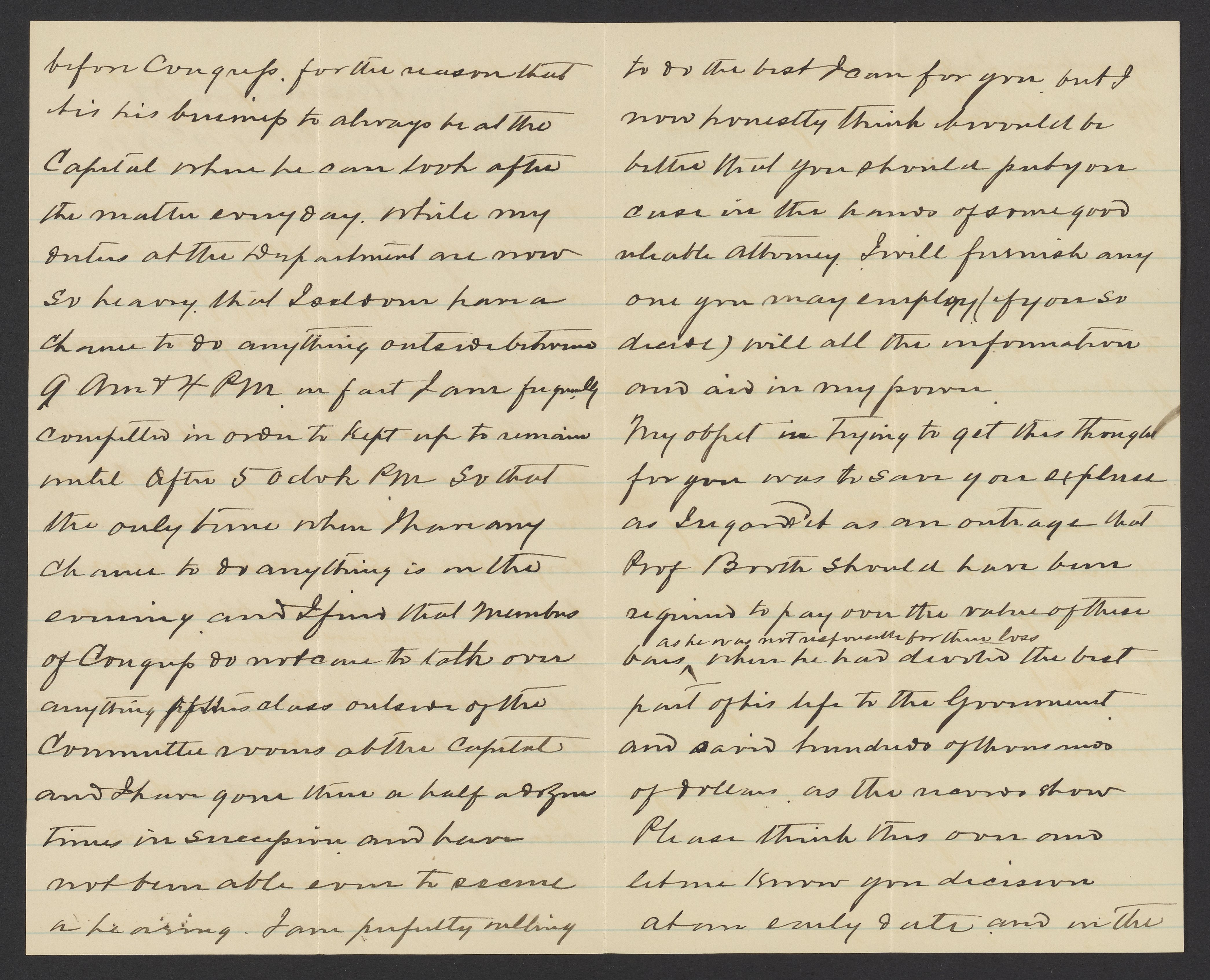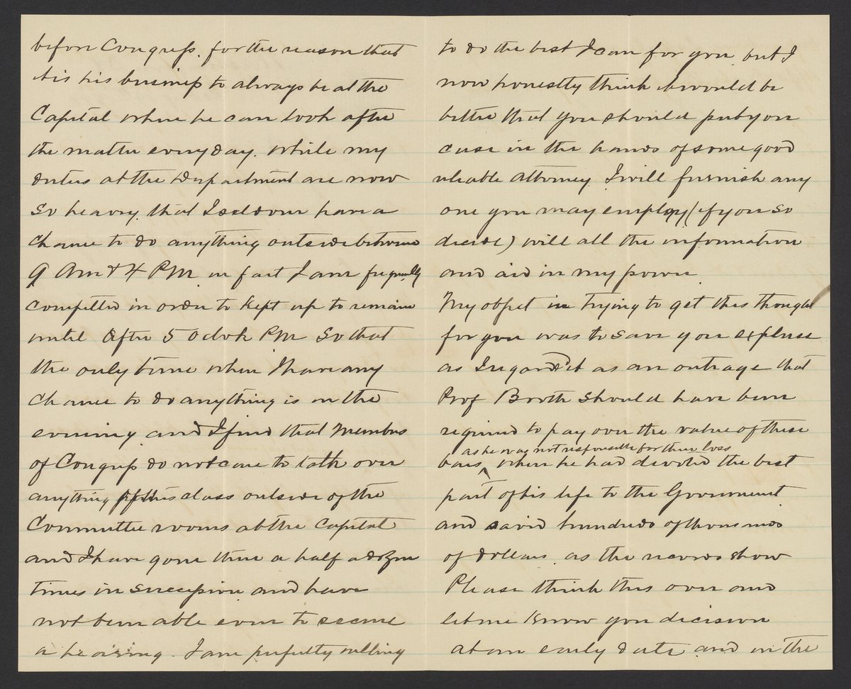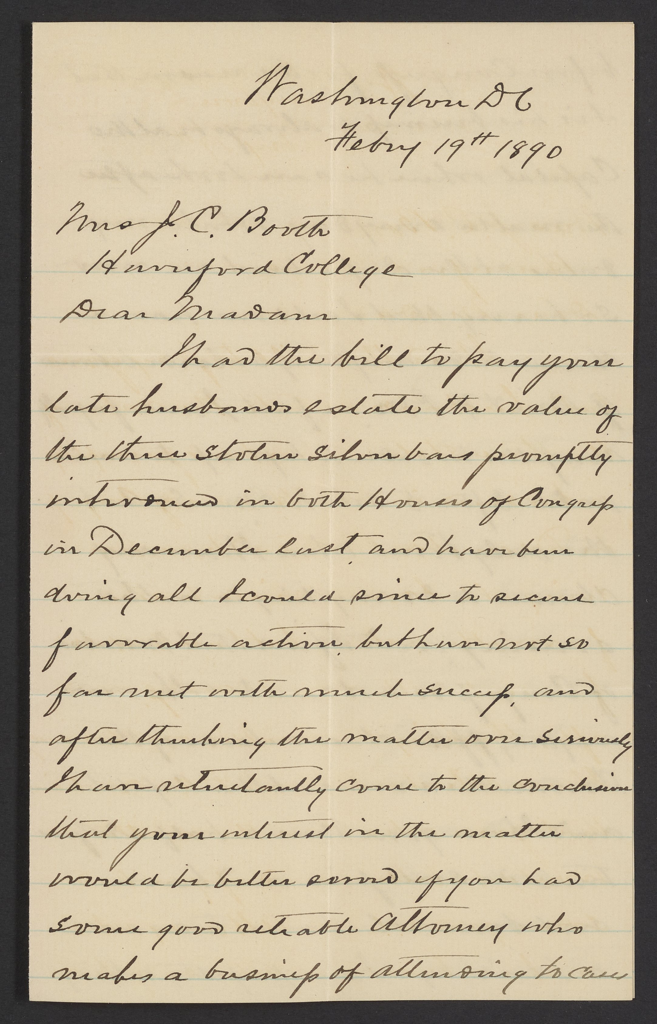 Small JPG1200 x 1870px — 326 KBFull-sized JPG2165 x 3374px — 944 KBOriginal fileTIFF — 2165 x 3374px — 21.0 MBLetter from Robert E. Preston (1836-1911), of the United States Mint Bureau, to Margaret M. Booth née Cardeza informing her that he is not having success getting a bill to relieve her husband's estate introduced through Congress. Preston describes the hectic activity in Congress and concludes by suggesting that Margaret consider hiring an attorney to represent her in the courts.