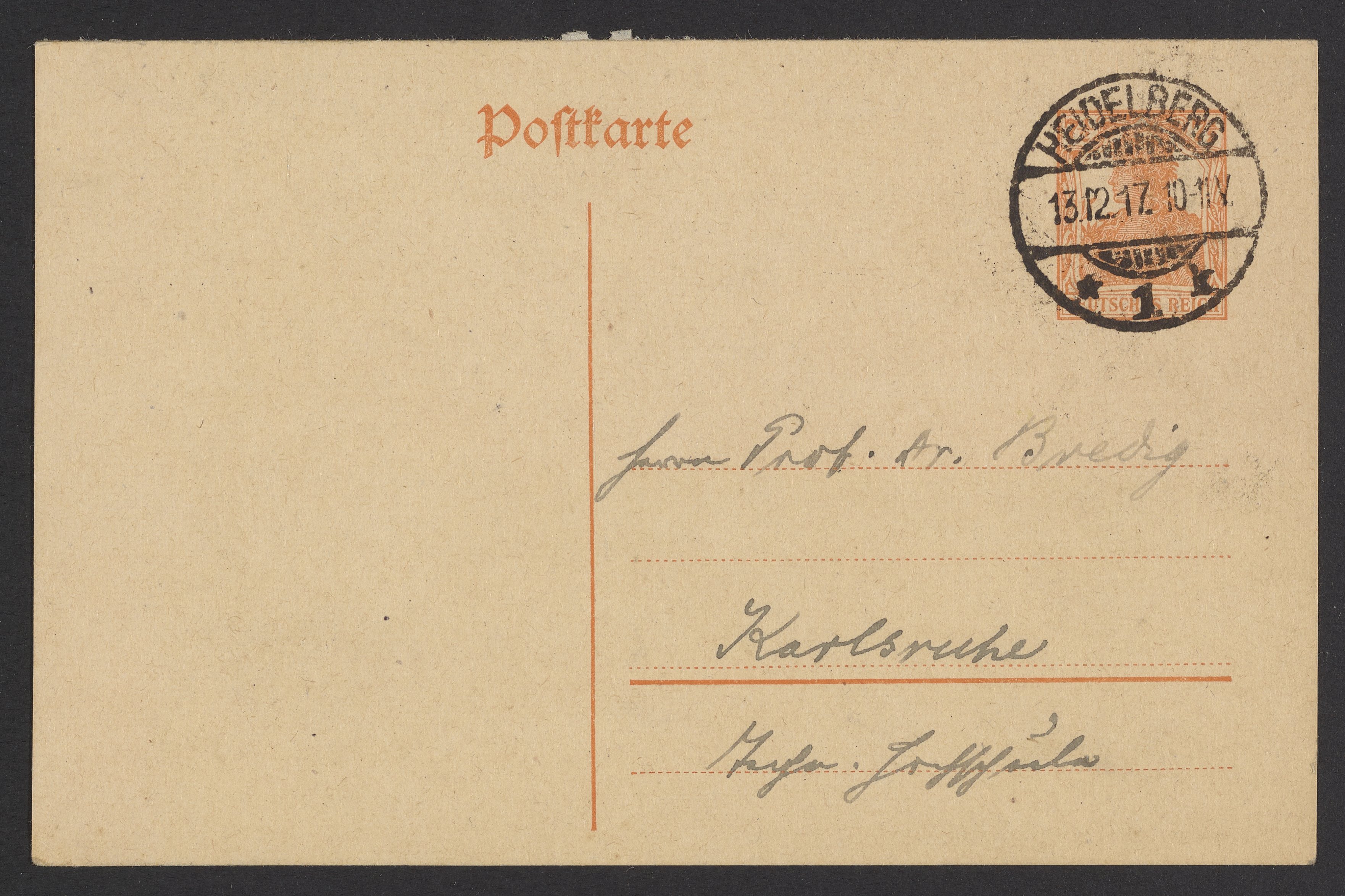 Postcard from Otto Bütschli to Georg Bredig, December 1917