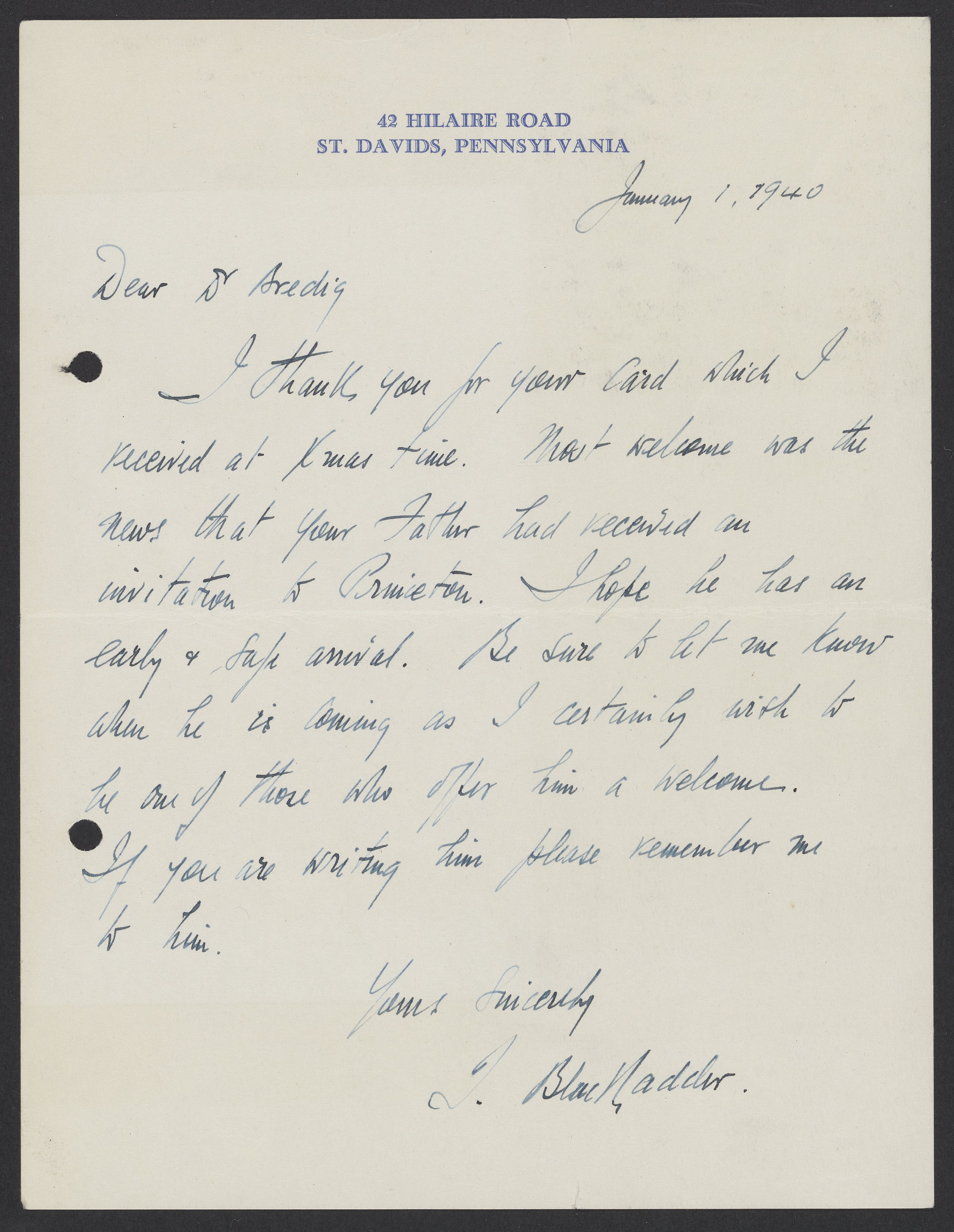 Letter from Thomas Blackadder to Max Bredig, January 1940