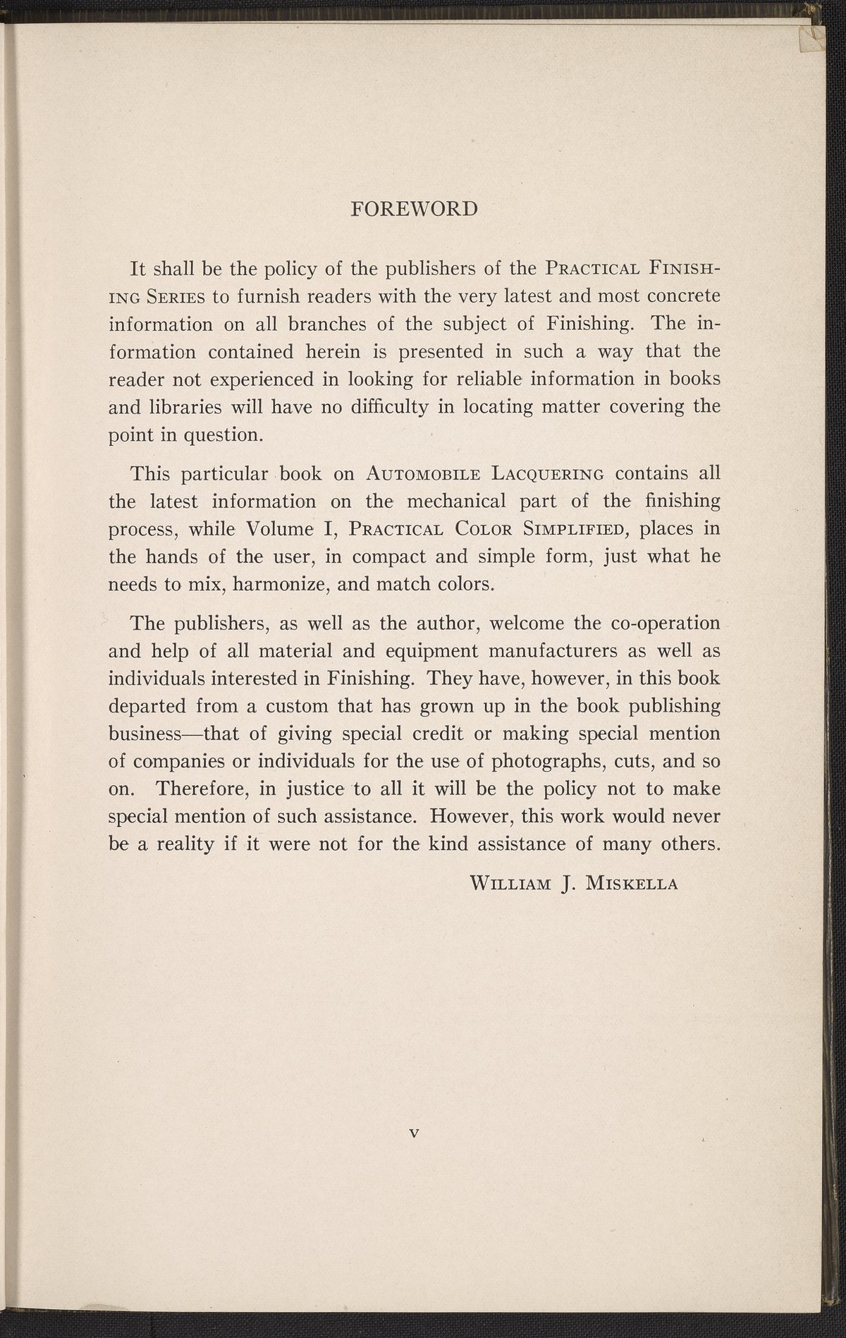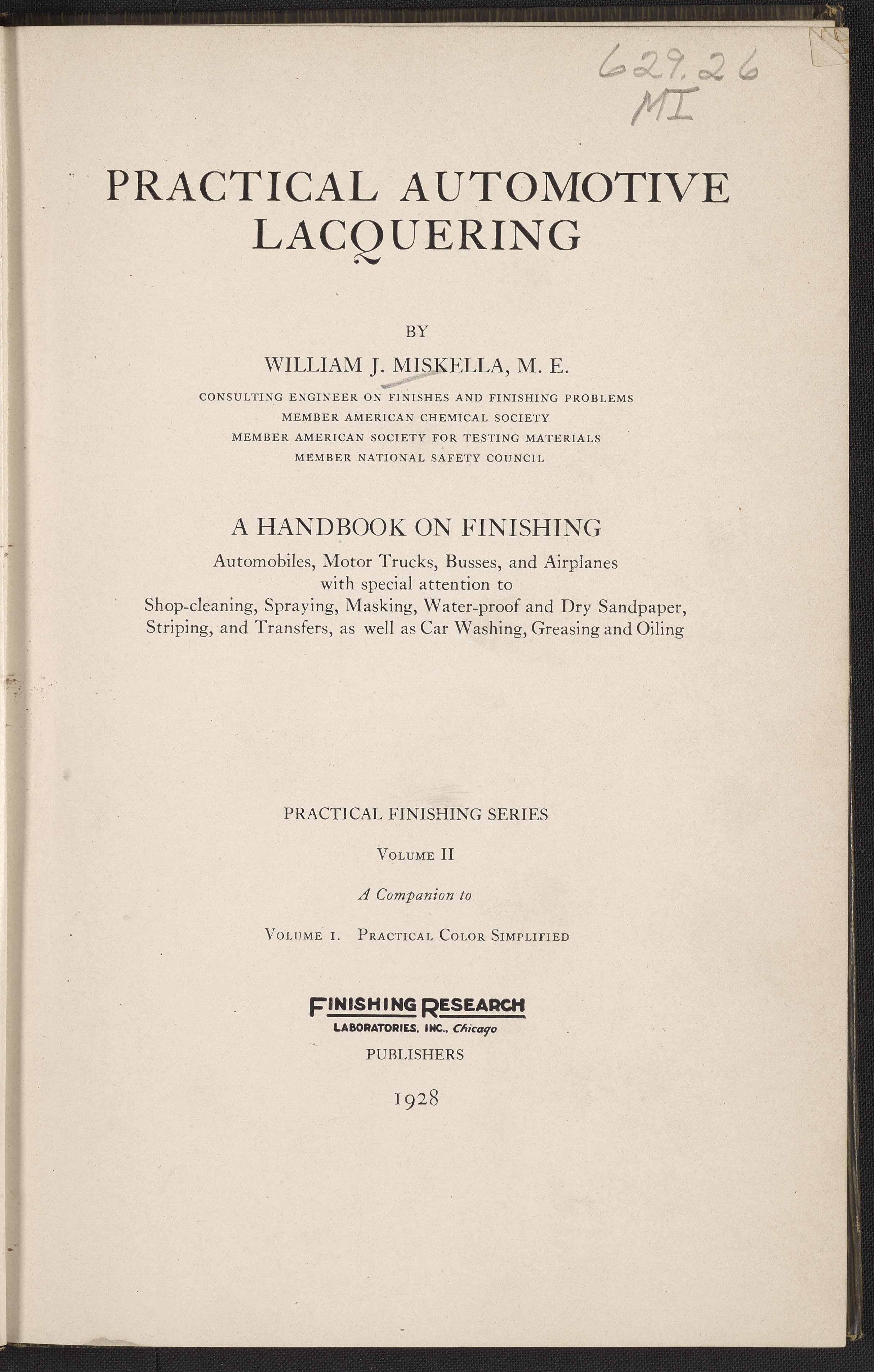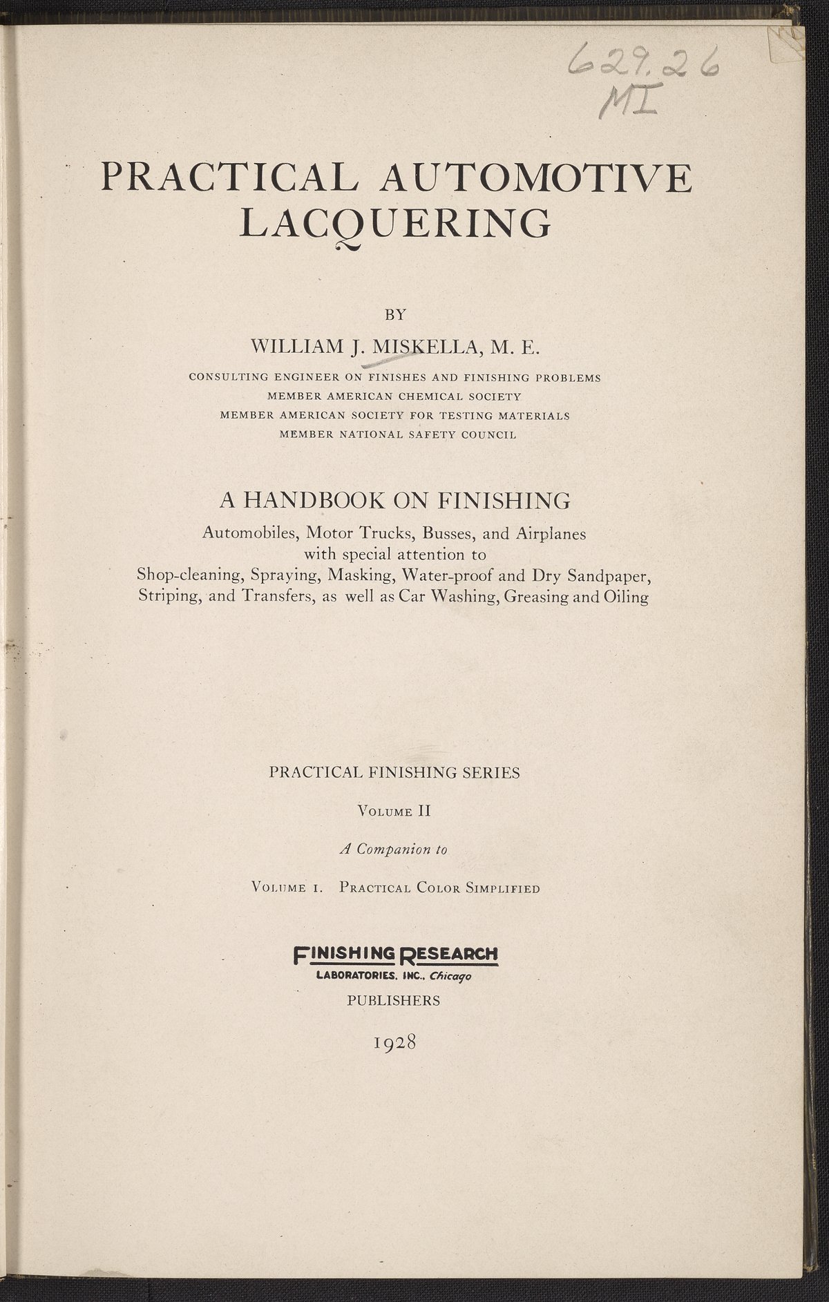Miskella, William J. (William James). “Practical Automotive Lacquering.” Chicago, Illinois: Inc. Finishing Research Laboratories, 1928. TL154 .M57 1928. Science History Institute. Philadelphia. https://digital.sciencehistory.org/works/e65vrfq.
