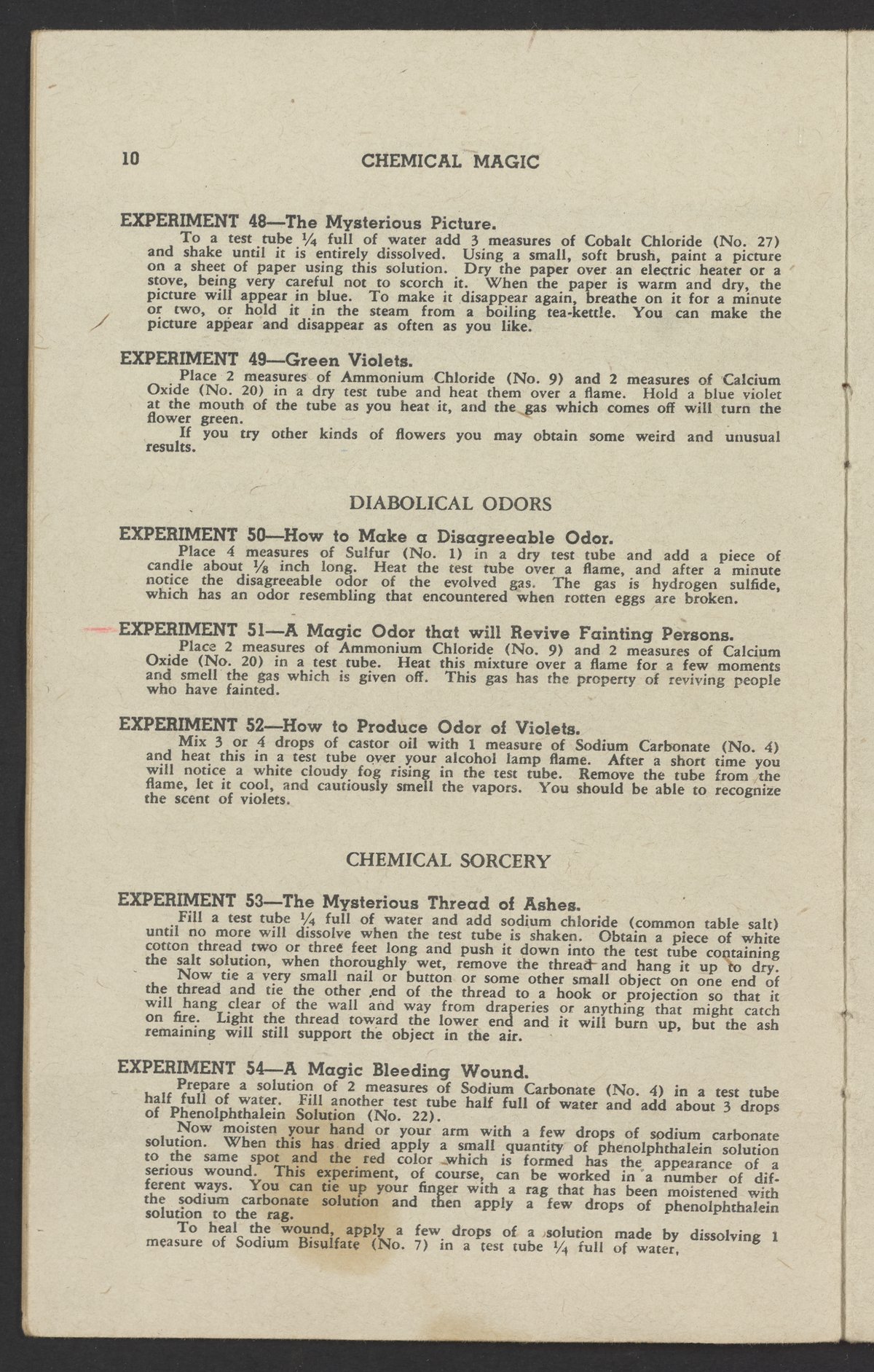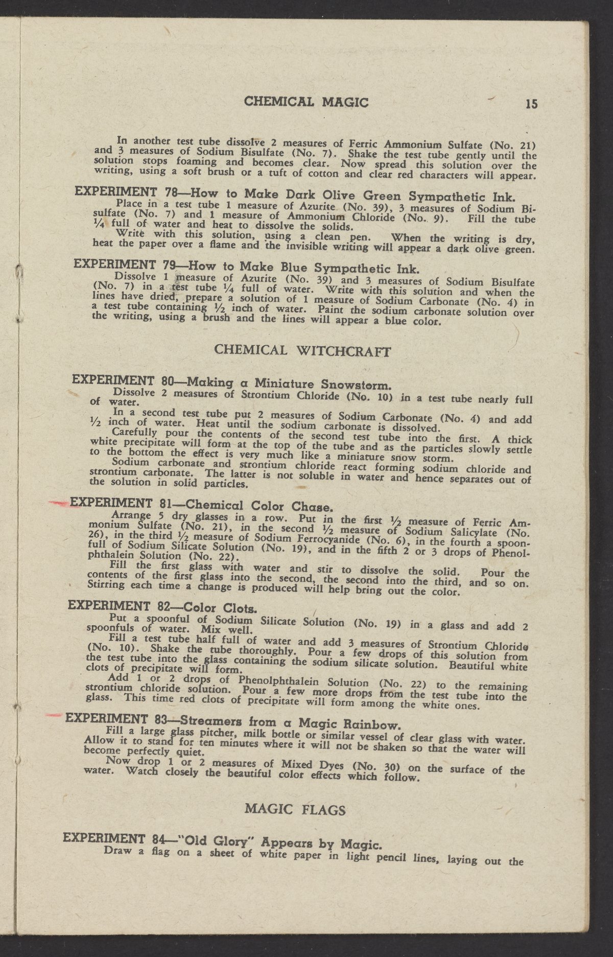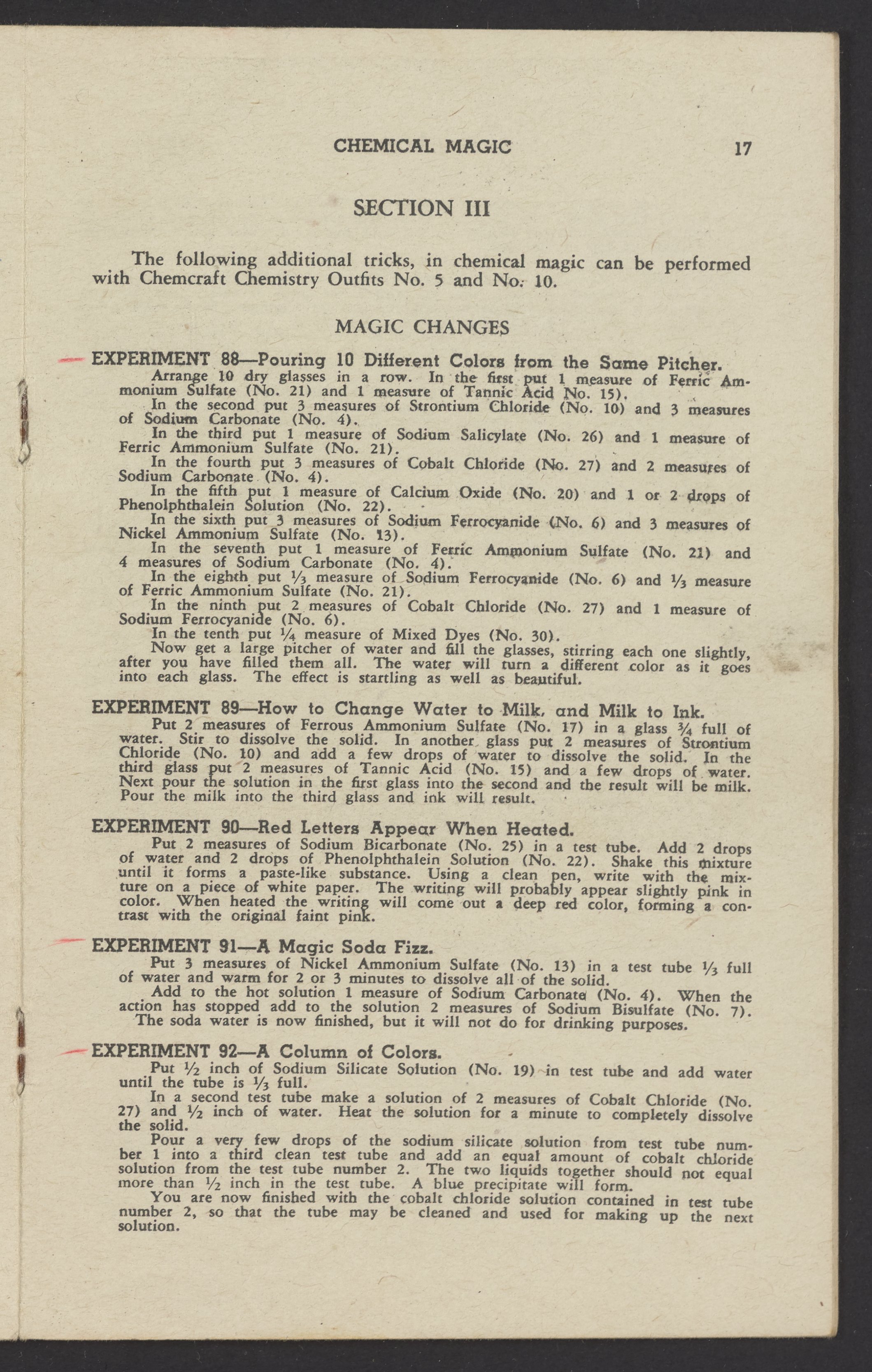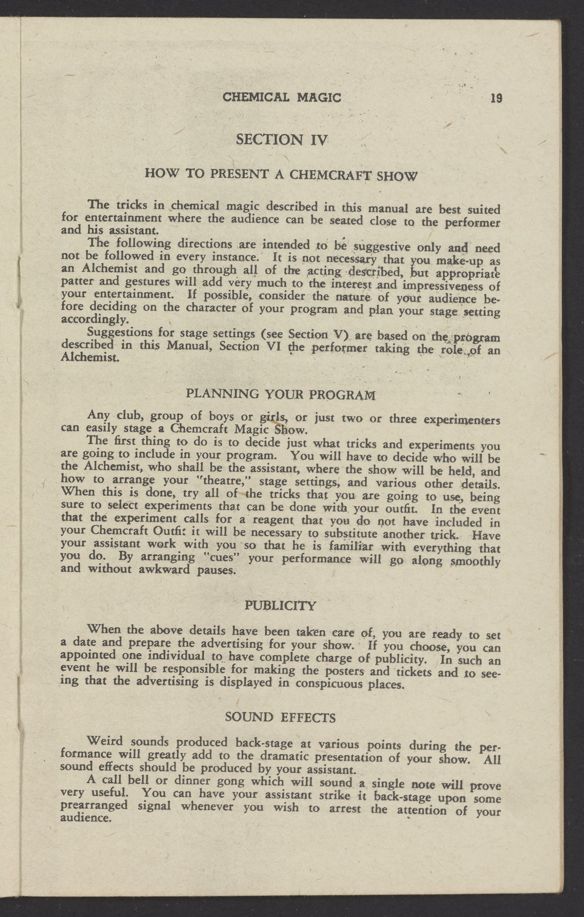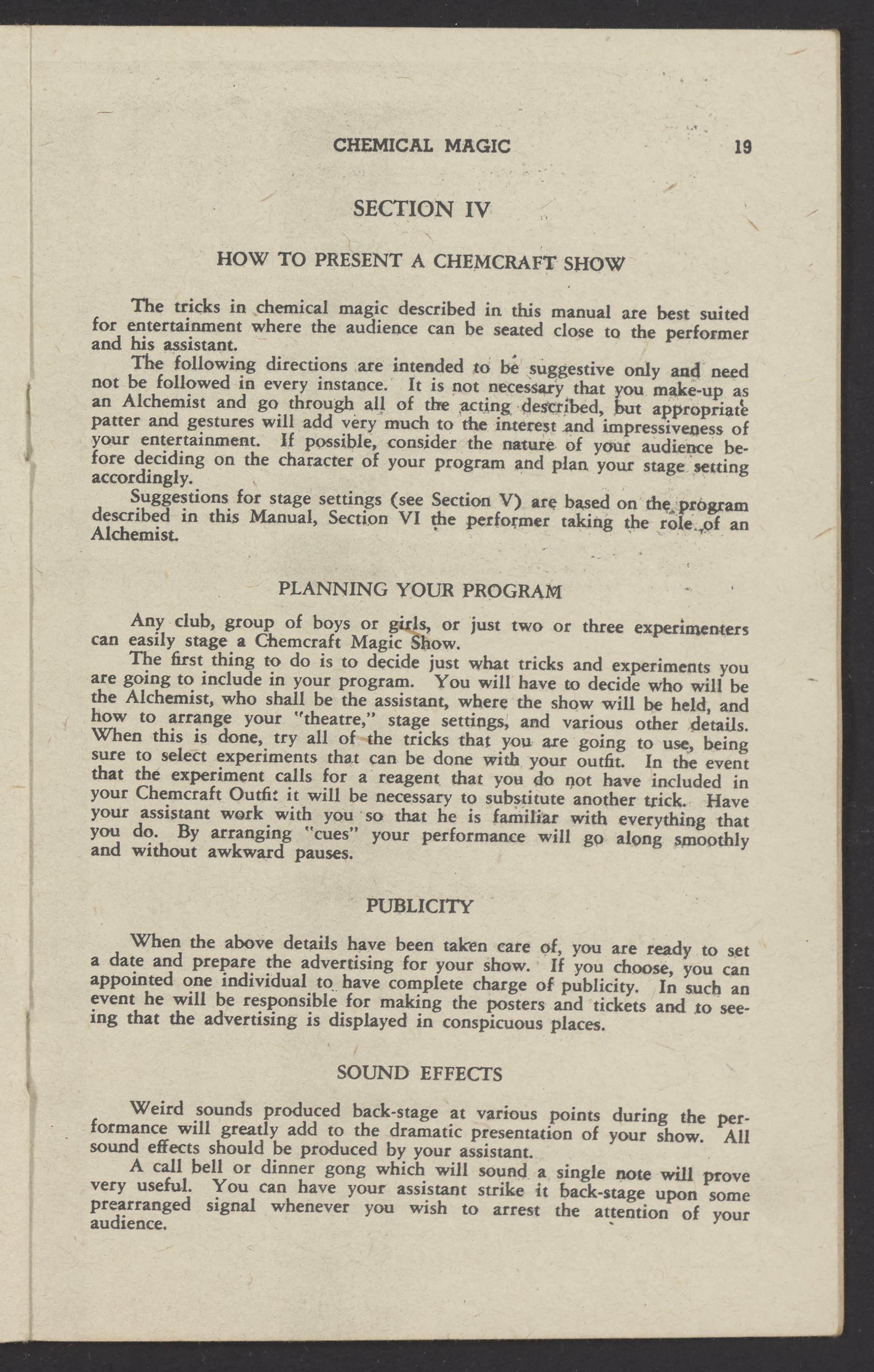 Small JPG1200 x 1870px — 433 KBFull-sized JPG2145 x 3342px — 1.1 MBOriginal fileTIFF — 2145 x 3342px — 20.6 MBA manual written for middle to high school-age students to accompany the Chemcraft Chemical Magic Set. Includes 58 magic-themed experiments for the user to "amaze [their] friends by producing odors, invisible inks, and scores of other tricks which are equally mysterious. Complete directions are given for presenting a Chemcraft Magic Show including suggestions for stage settings, costumes, suitable 'patter' and publicity."