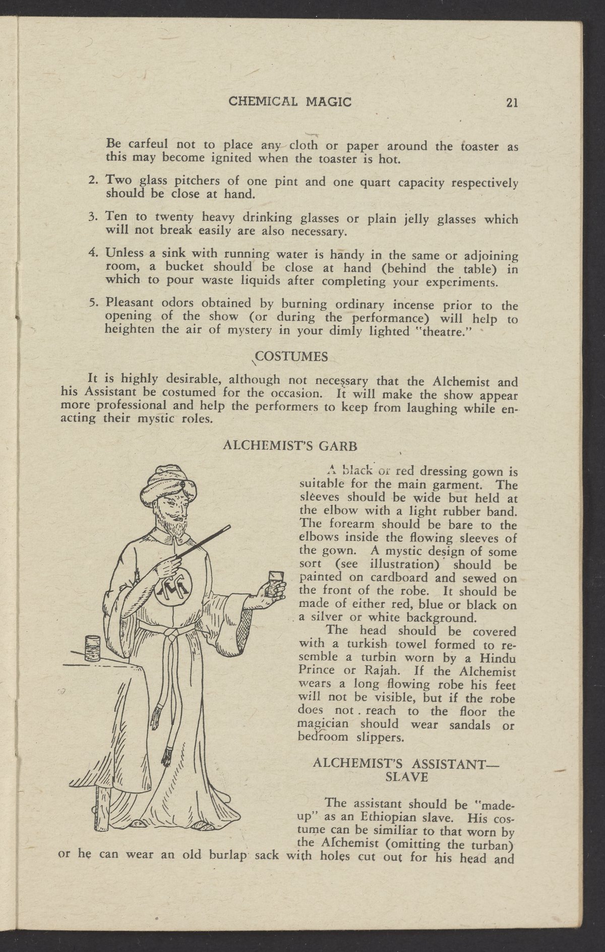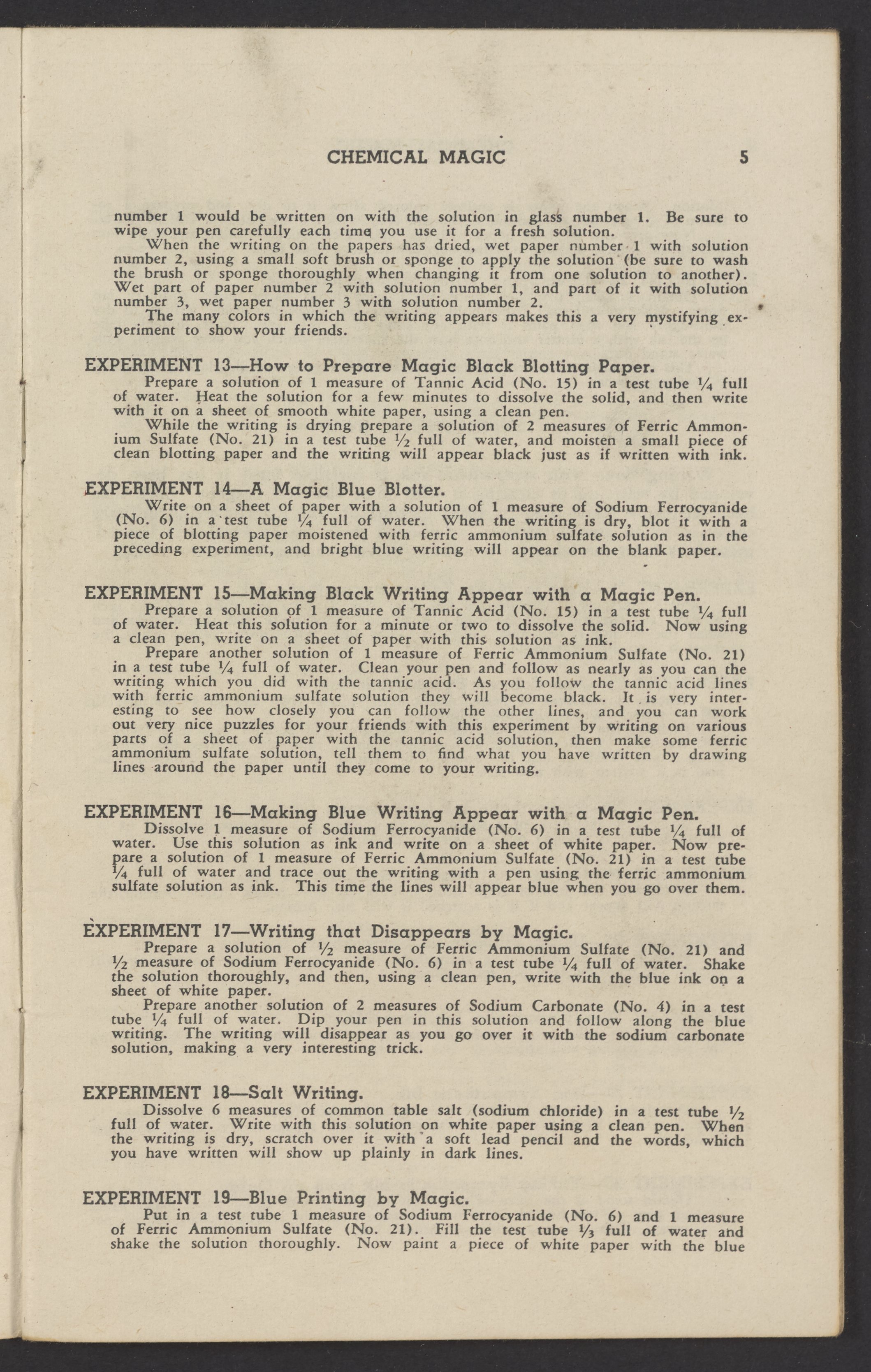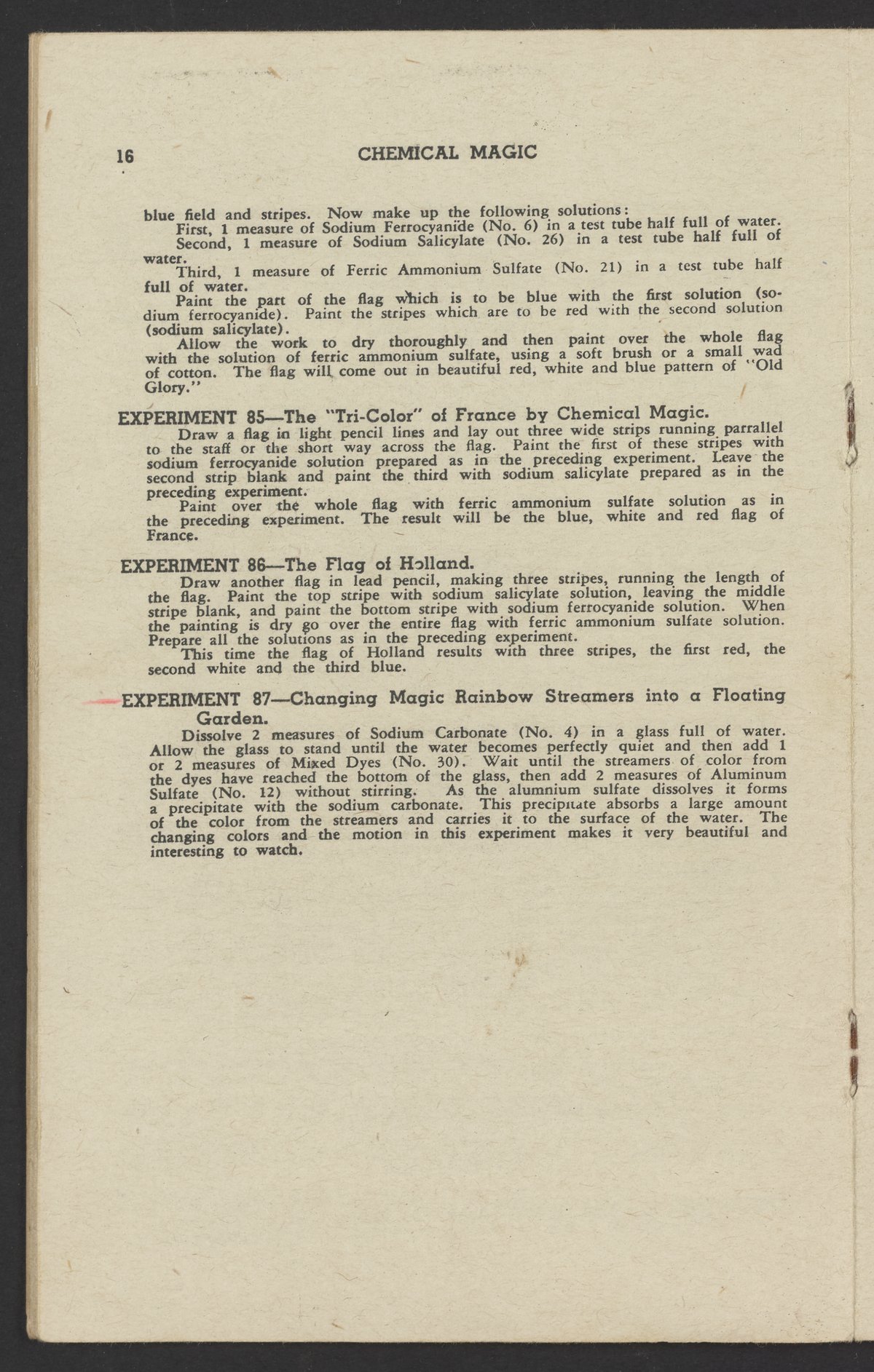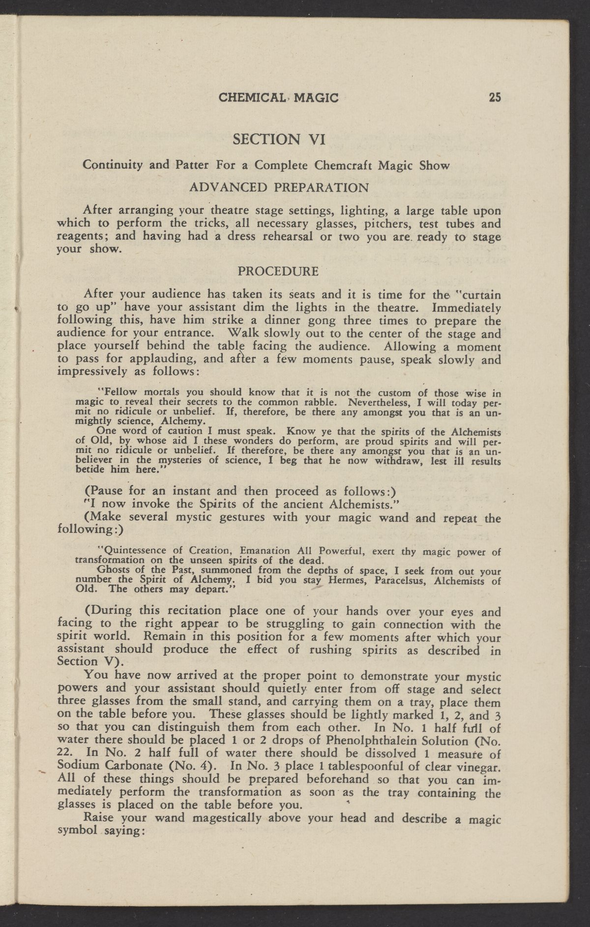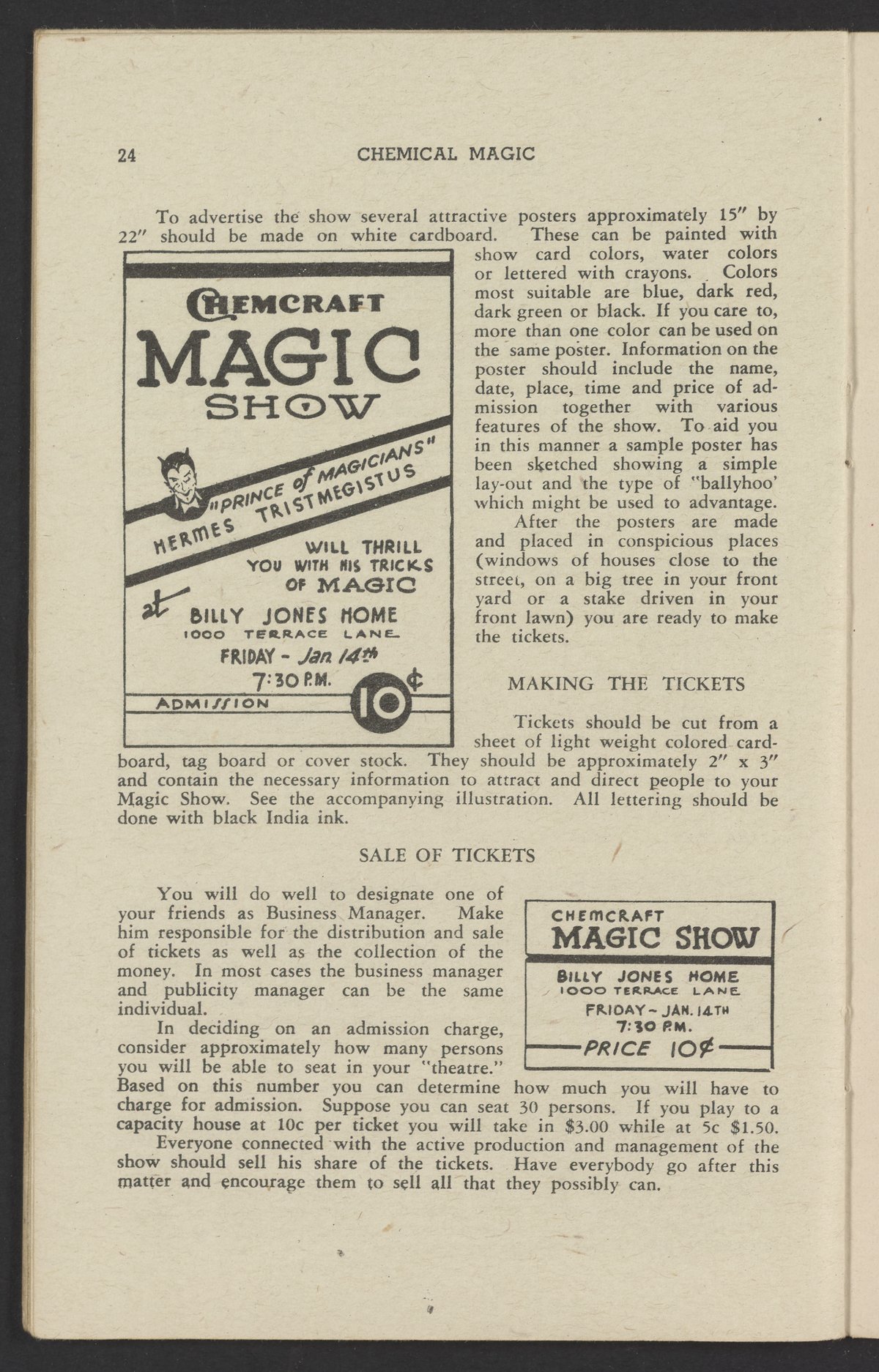 Small JPG1200 x 1870px — 433 KBFull-sized JPG2145 x 3342px — 1.1 MBOriginal fileTIFF — 2145 x 3342px — 20.6 MBA manual written for middle to high school-age students to accompany the Chemcraft Chemical Magic Set. Includes 58 magic-themed experiments for the user to "amaze [their] friends by producing odors, invisible inks, and scores of other tricks which are equally mysterious. Complete directions are given for presenting a Chemcraft Magic Show including suggestions for stage settings, costumes, suitable 'patter' and publicity."