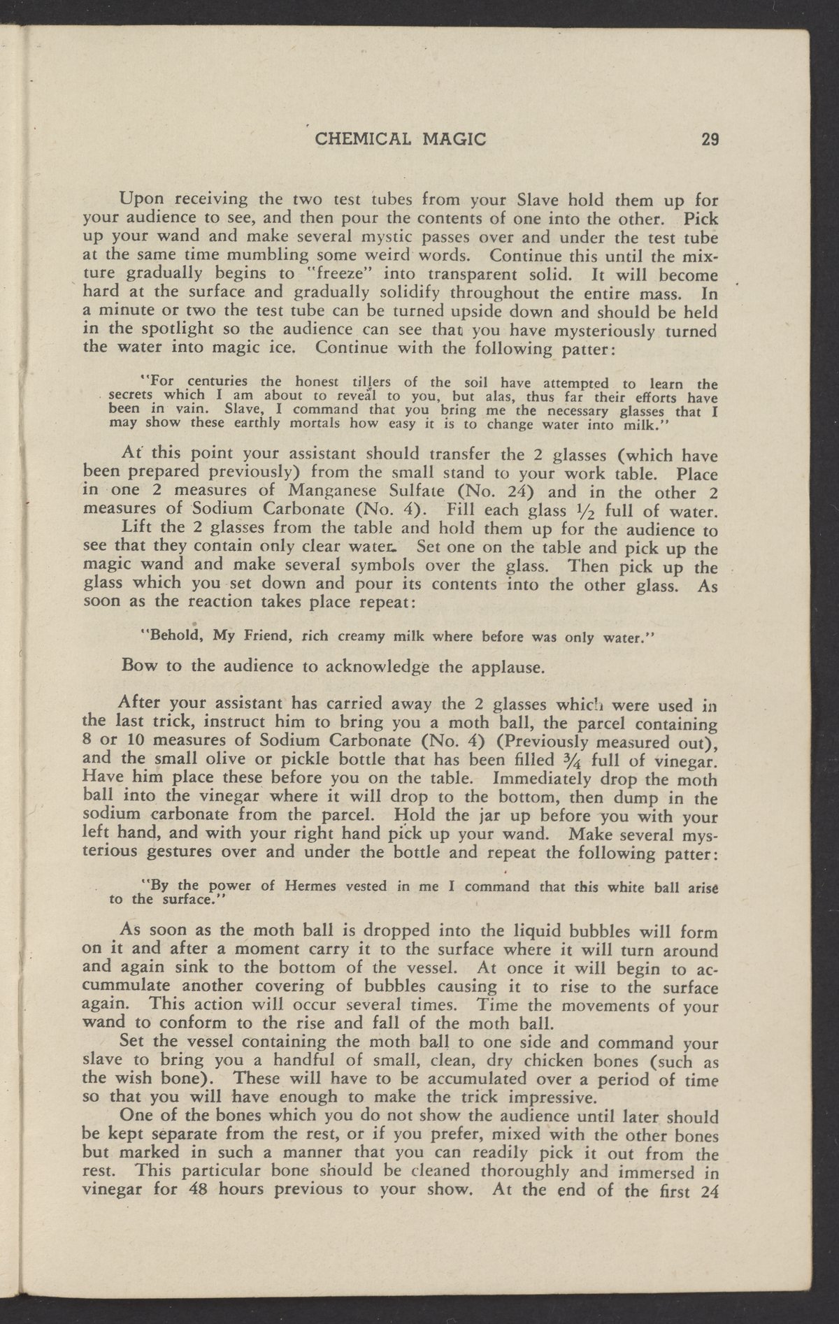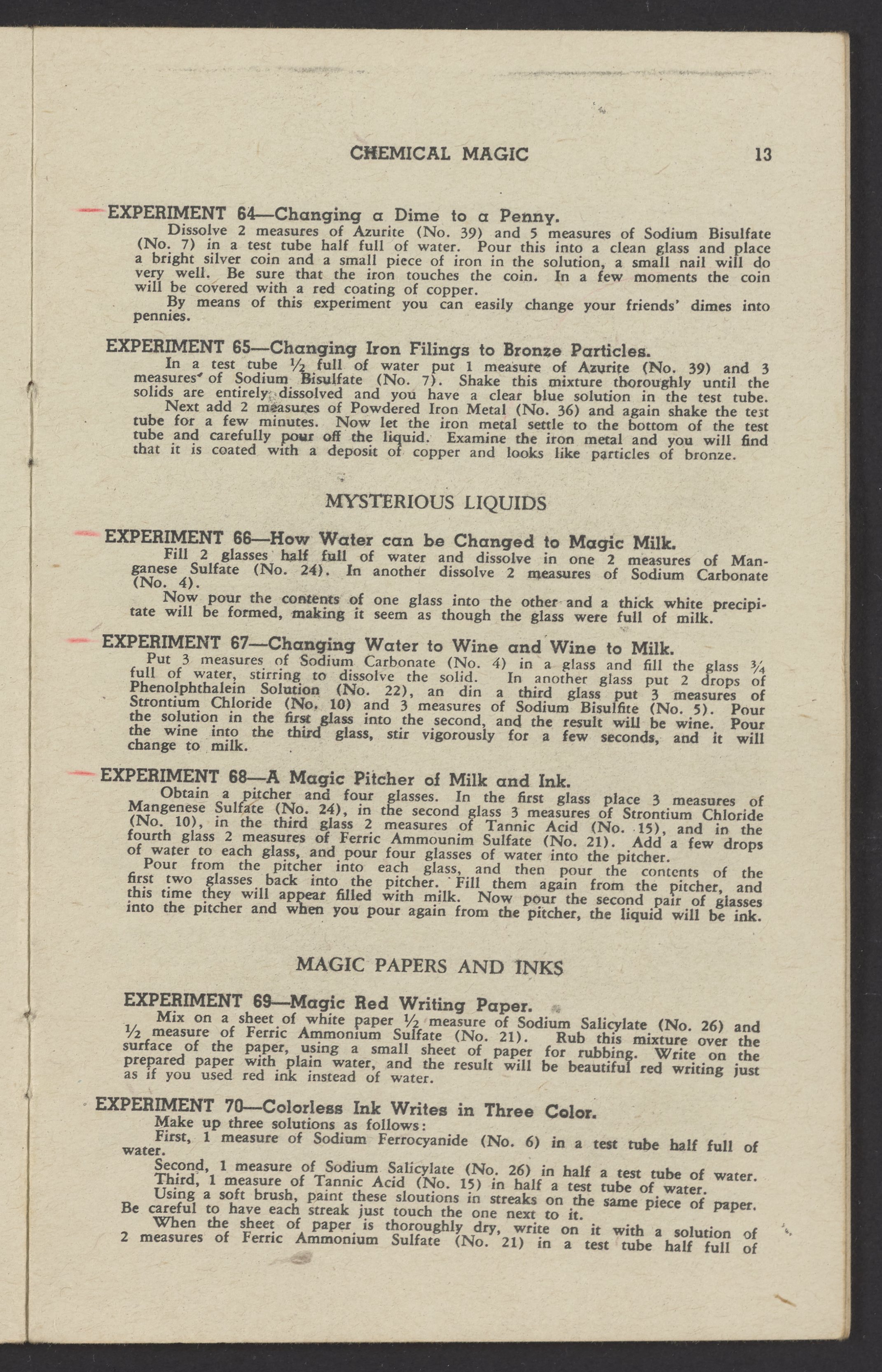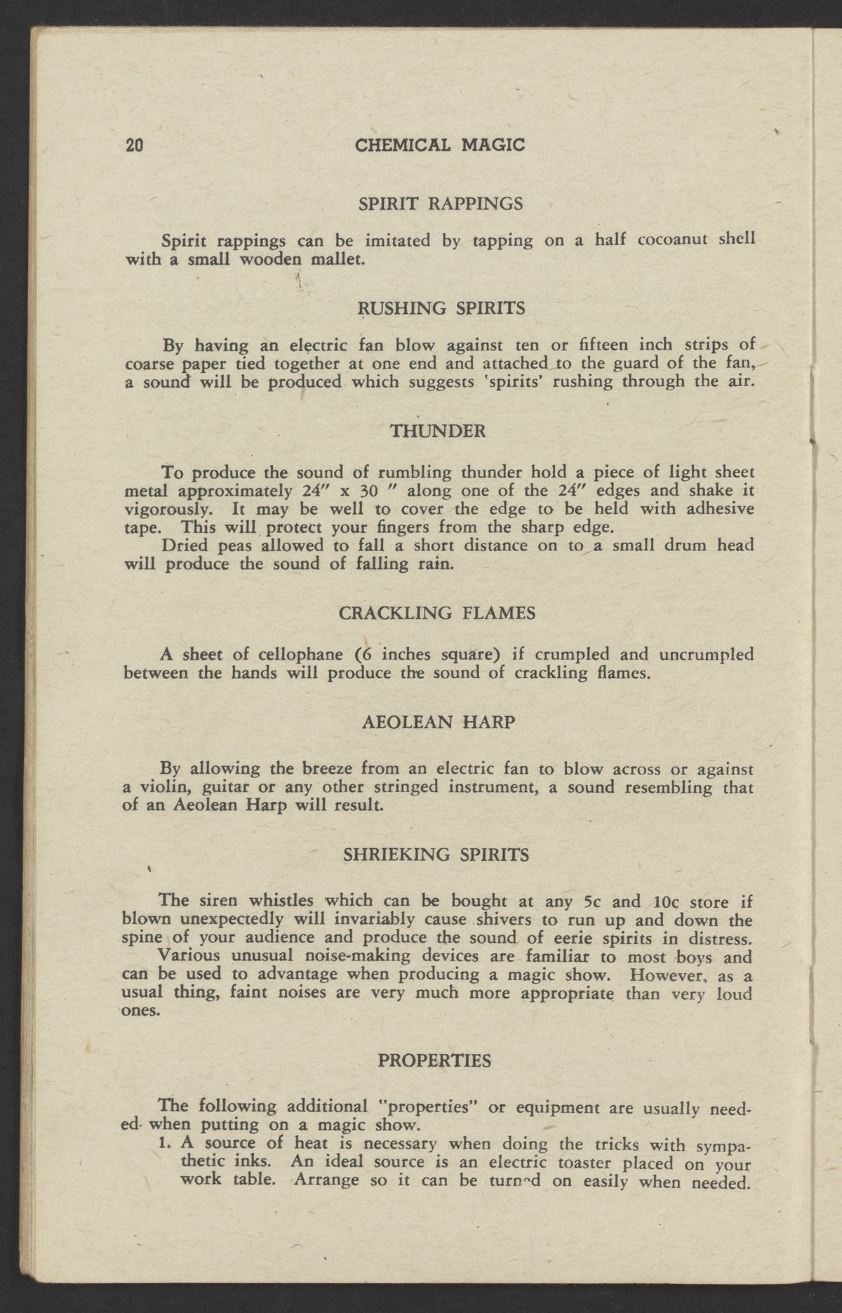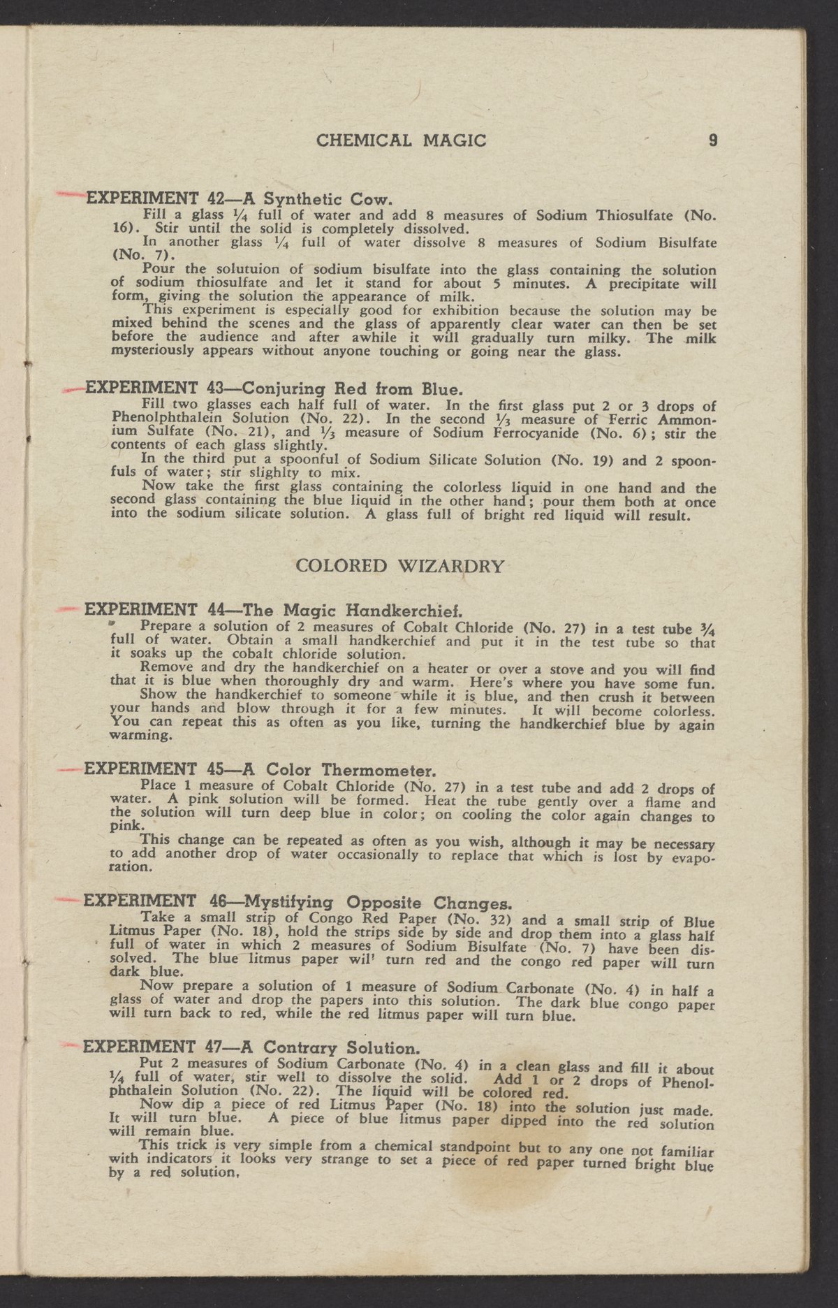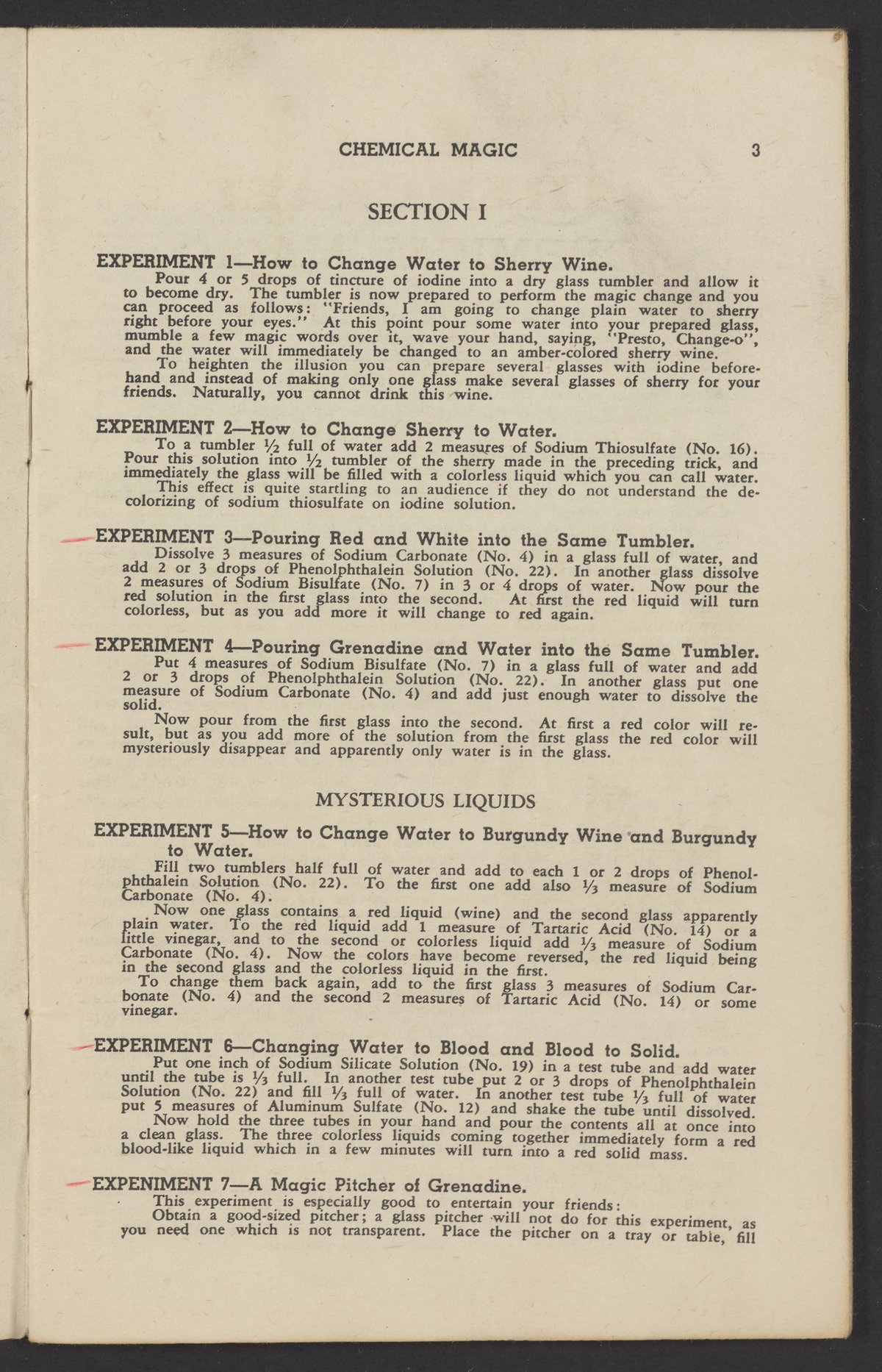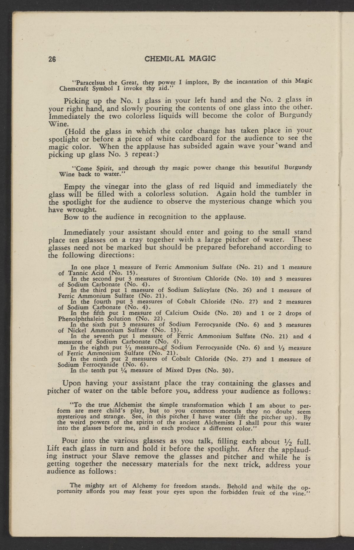Small JPG1200 x 1870px — 433 KBFull-sized JPG2145 x 3342px — 1.1 MBOriginal fileTIFF — 2145 x 3342px — 20.6 MBA manual written for middle to high school-age students to accompany the Chemcraft Chemical Magic Set. Includes 58 magic-themed experiments for the user to "amaze [their] friends by producing odors, invisible inks, and scores of other tricks which are equally mysterious. Complete directions are given for presenting a Chemcraft Magic Show including suggestions for stage settings, costumes, suitable 'patter' and publicity."