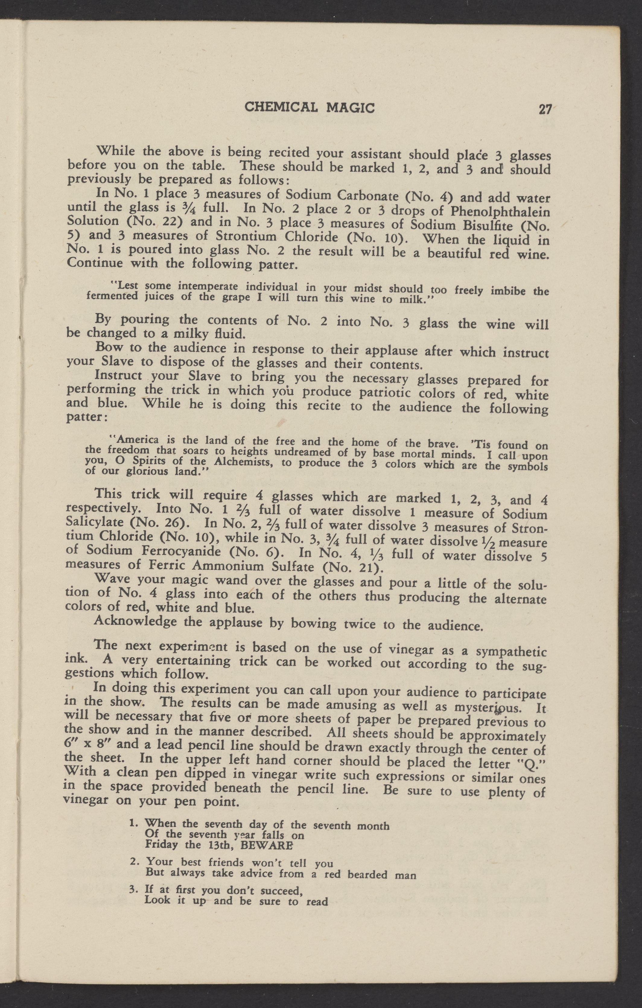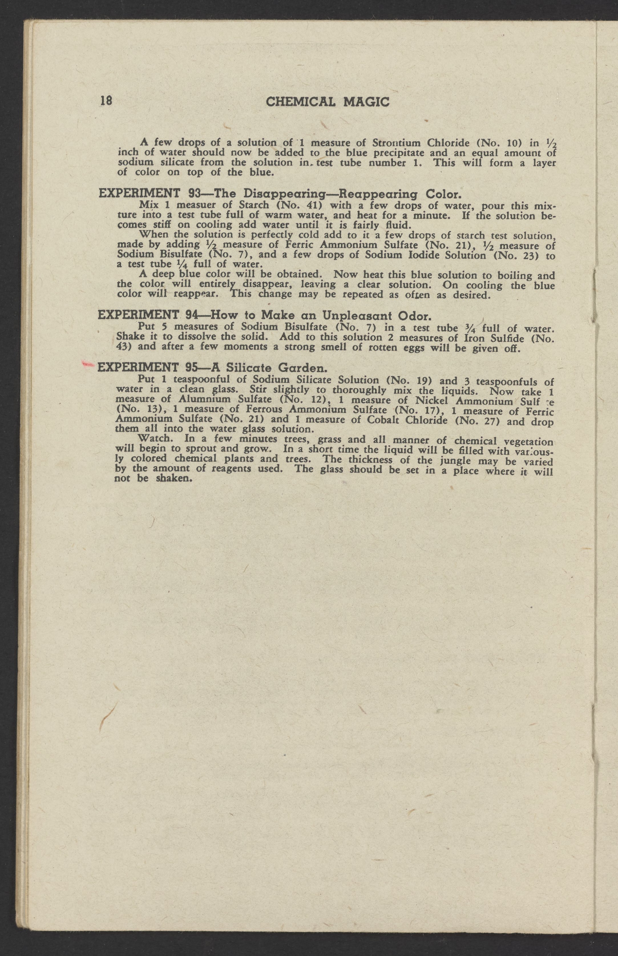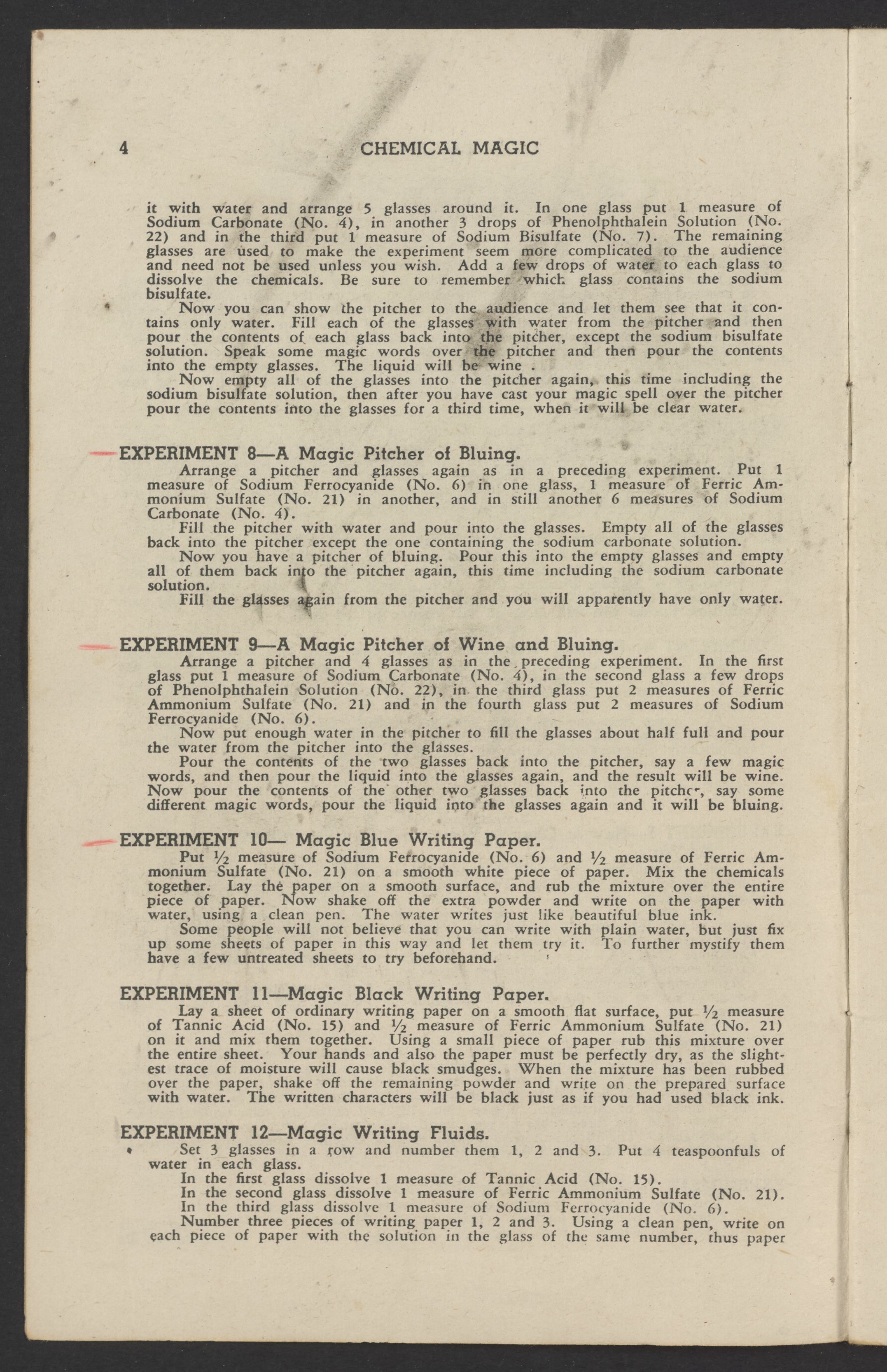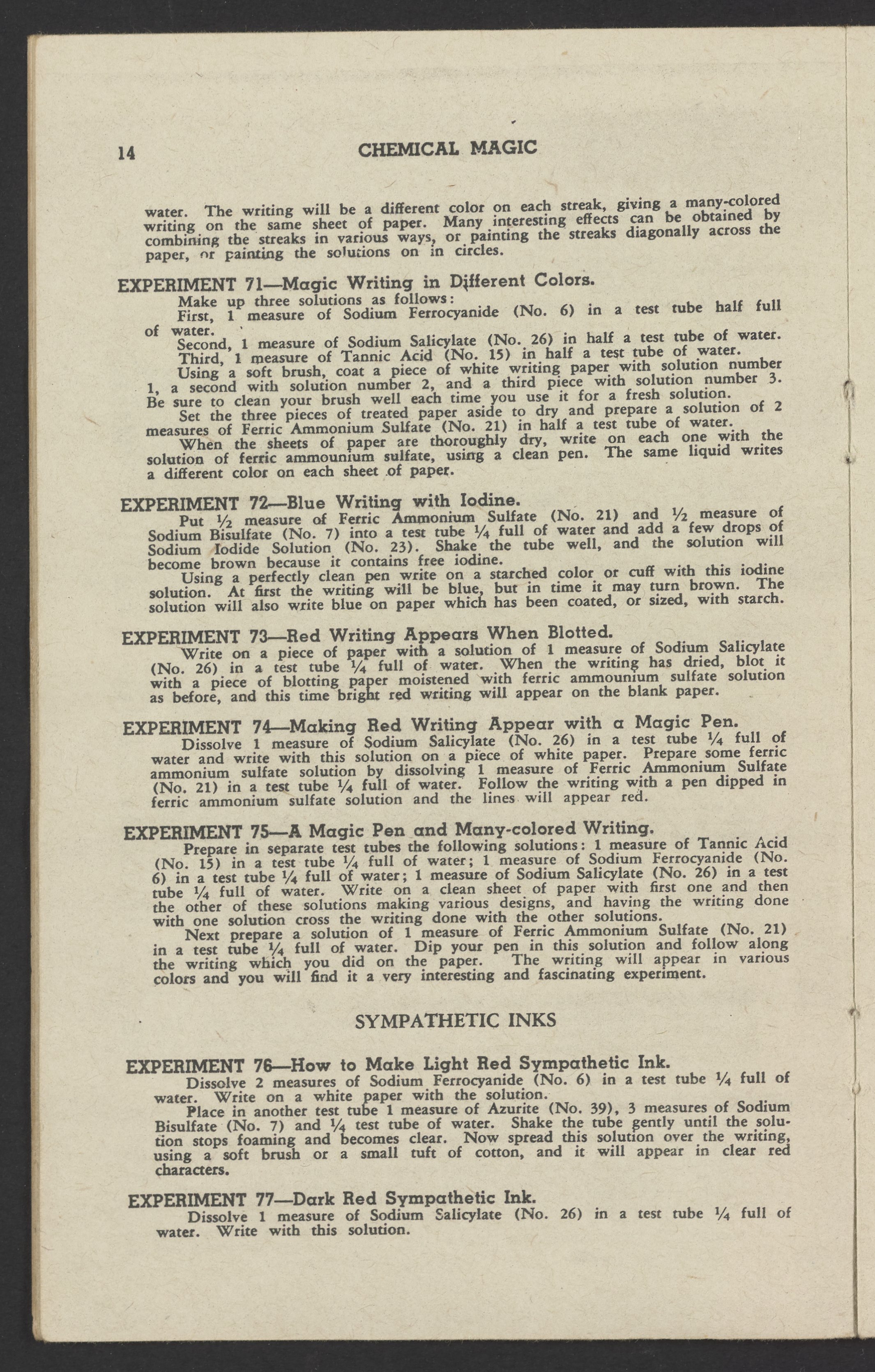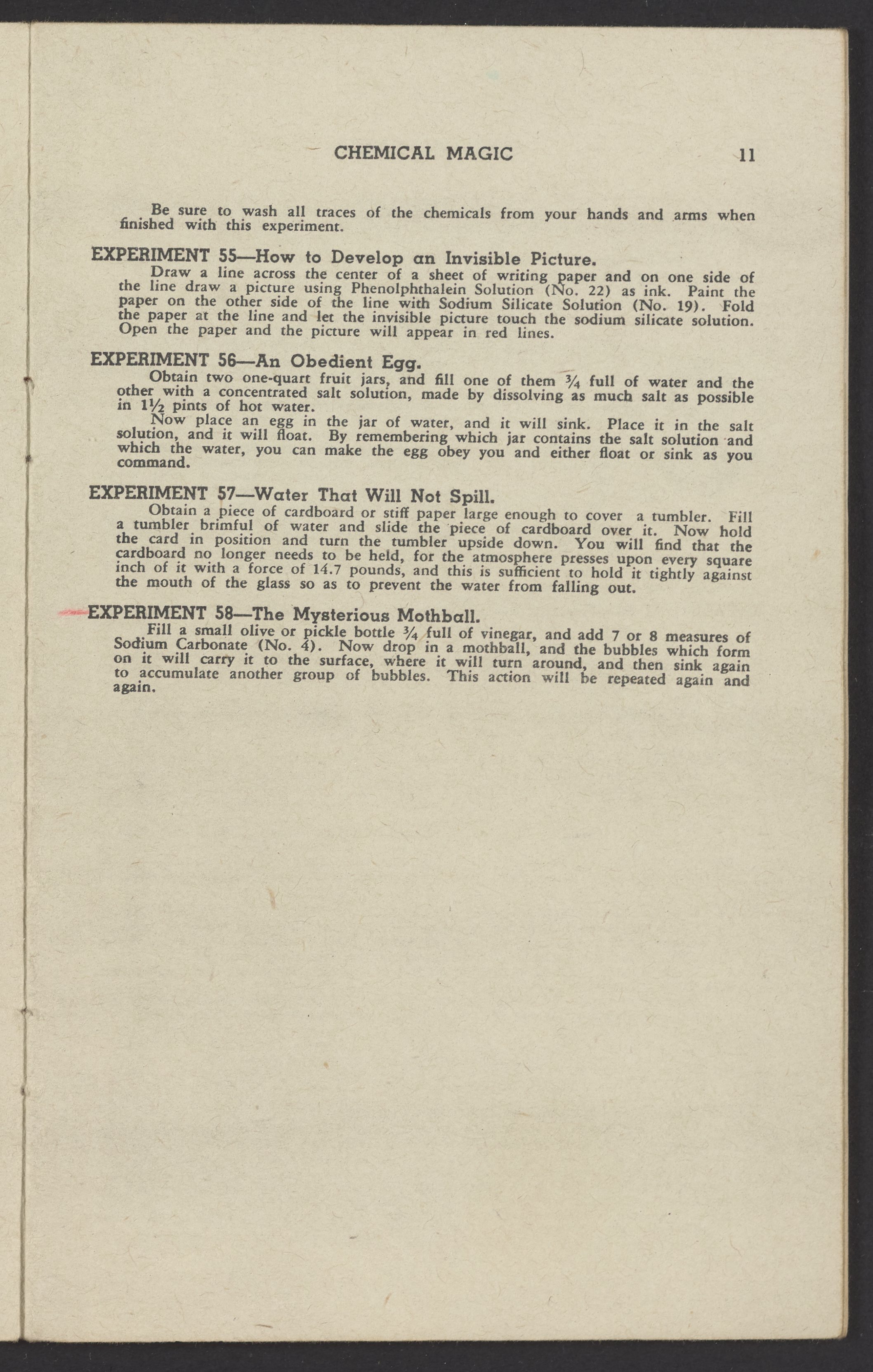 Small JPG1200 x 1870px — 433 KBFull-sized JPG2145 x 3342px — 1.1 MBOriginal fileTIFF — 2145 x 3342px — 20.6 MBA manual written for middle to high school-age students to accompany the Chemcraft Chemical Magic Set. Includes 58 magic-themed experiments for the user to "amaze [their] friends by producing odors, invisible inks, and scores of other tricks which are equally mysterious. Complete directions are given for presenting a Chemcraft Magic Show including suggestions for stage settings, costumes, suitable 'patter' and publicity."