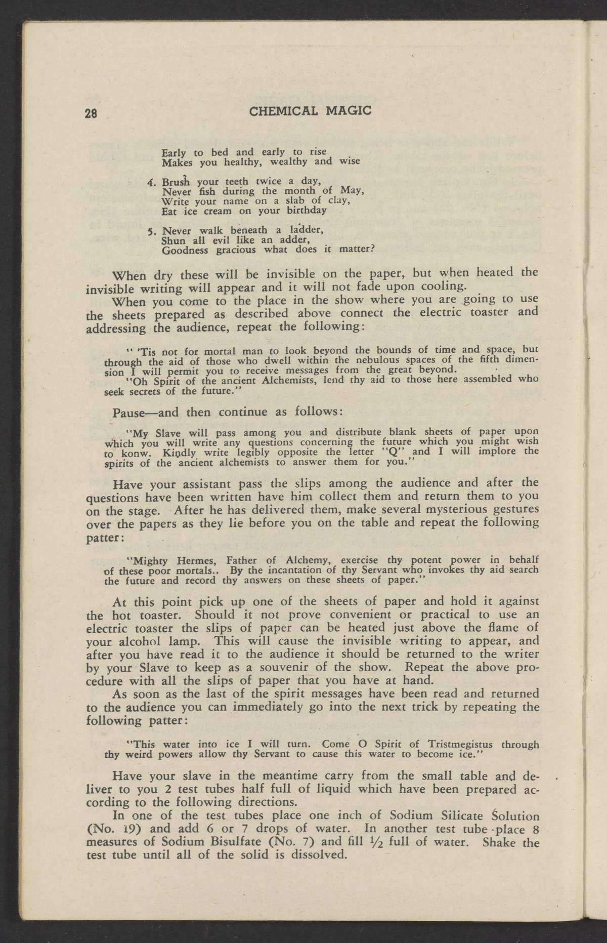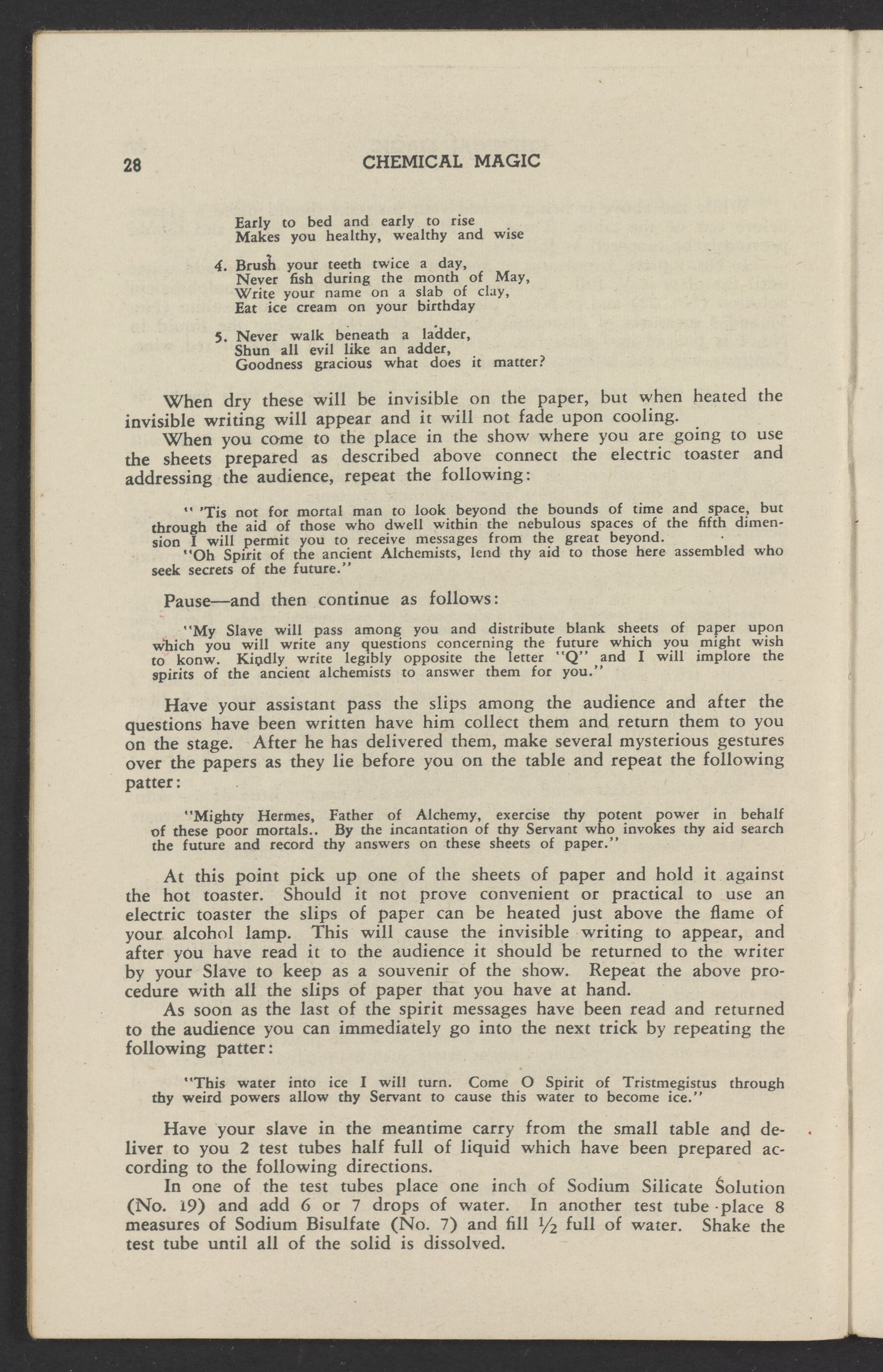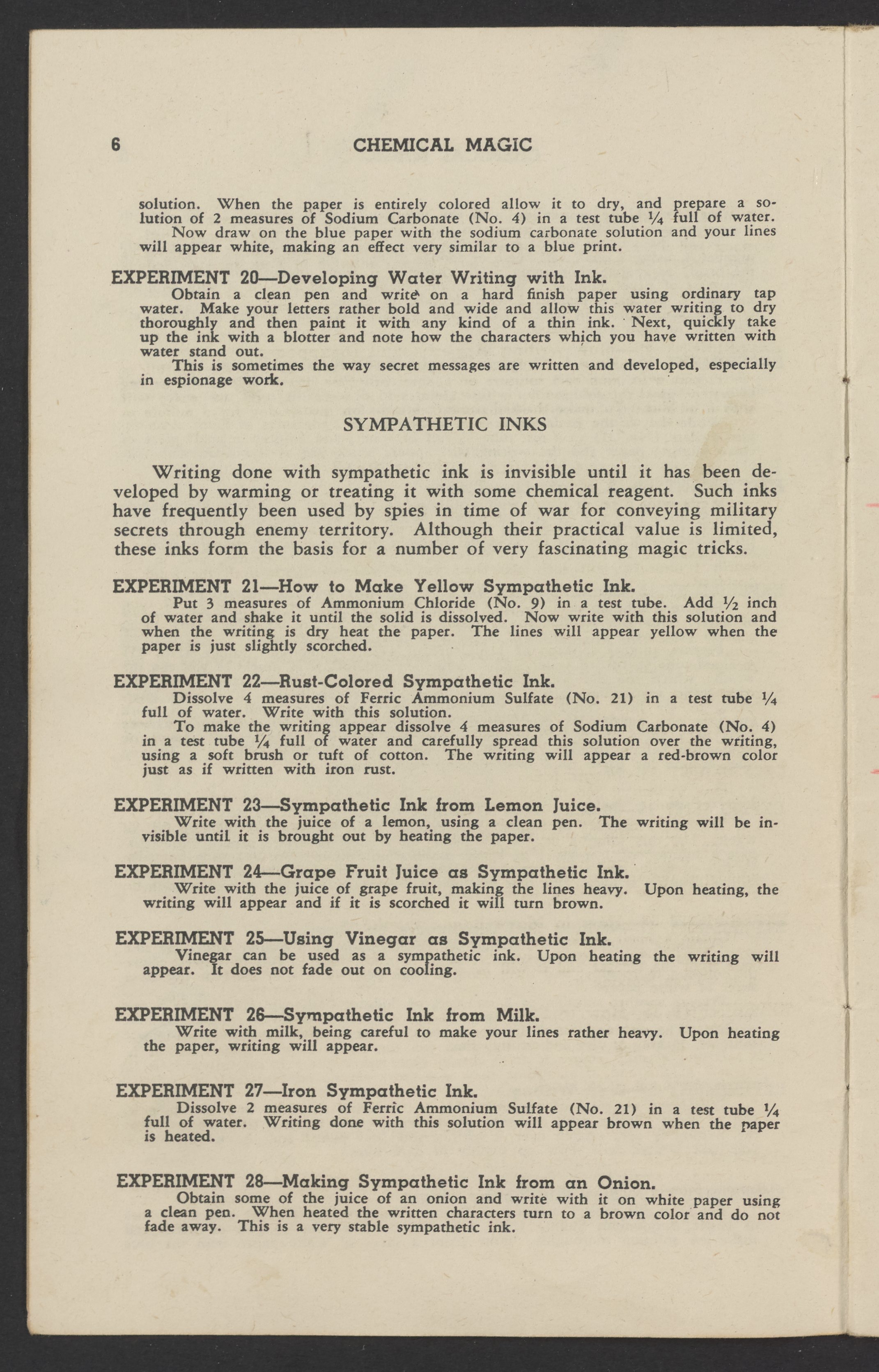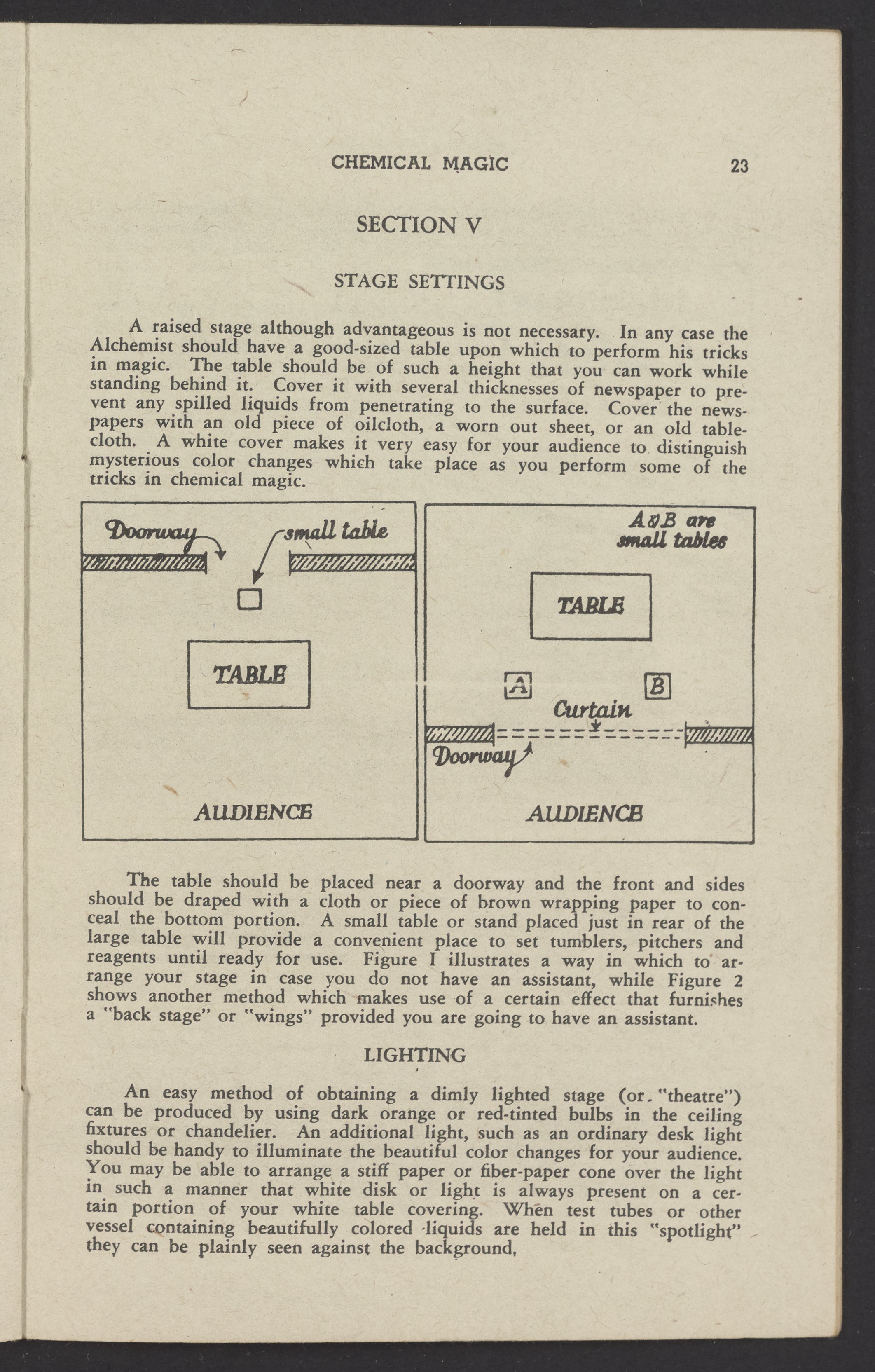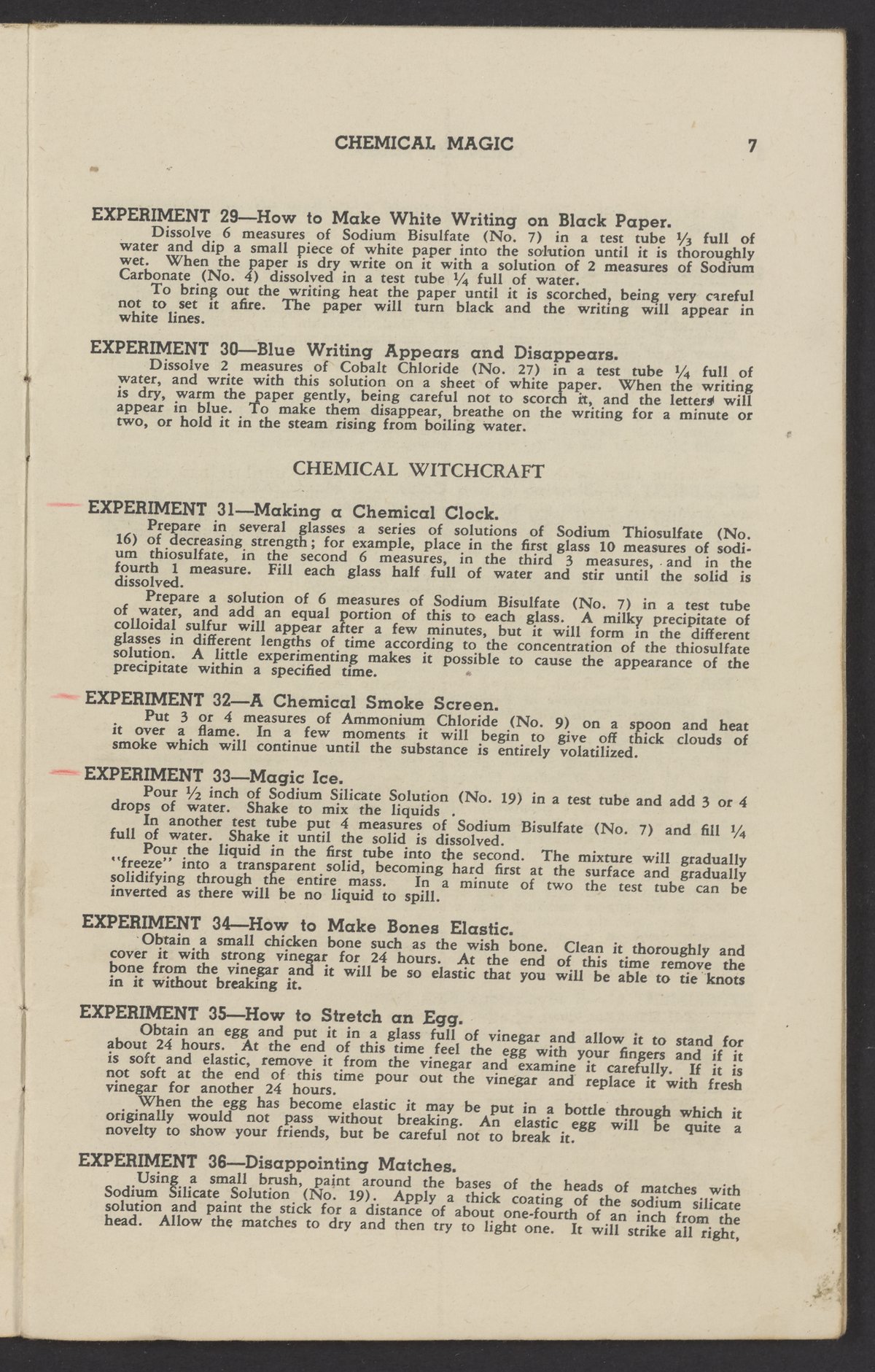 Small JPG1200 x 1870px — 433 KBFull-sized JPG2145 x 3342px — 1.1 MBOriginal fileTIFF — 2145 x 3342px — 20.6 MBA manual written for middle to high school-age students to accompany the Chemcraft Chemical Magic Set. Includes 58 magic-themed experiments for the user to "amaze [their] friends by producing odors, invisible inks, and scores of other tricks which are equally mysterious. Complete directions are given for presenting a Chemcraft Magic Show including suggestions for stage settings, costumes, suitable 'patter' and publicity."