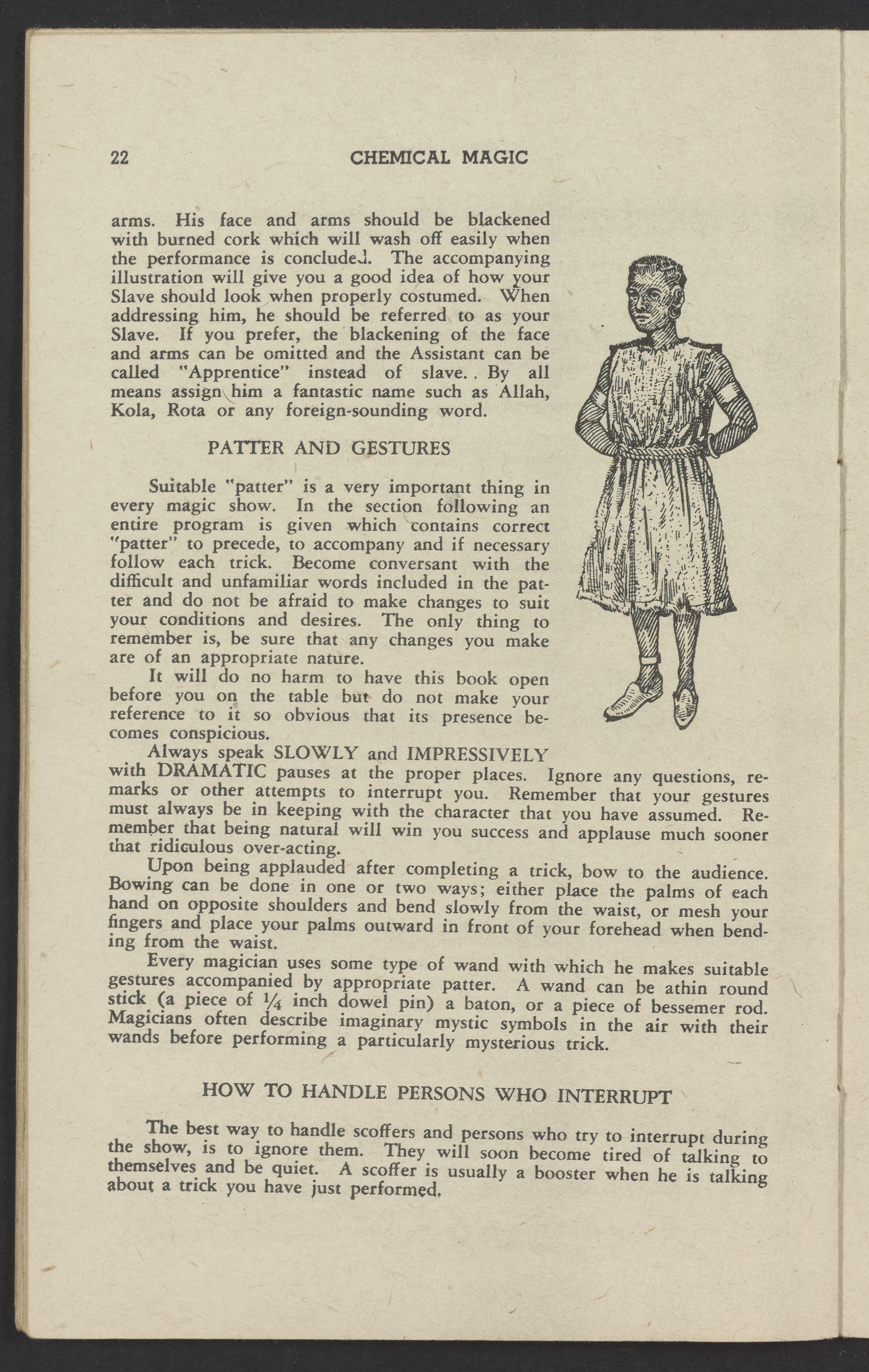 The instructions for performing a Chemcraft Magic Show direct the users to enact roles characterized by racist stereotypes, cultural appropriation, and blackface. The manual also uncritically suggests that users role-play enslavement. The work's illustrations include racist caricatures as well as a depiction of blackface.