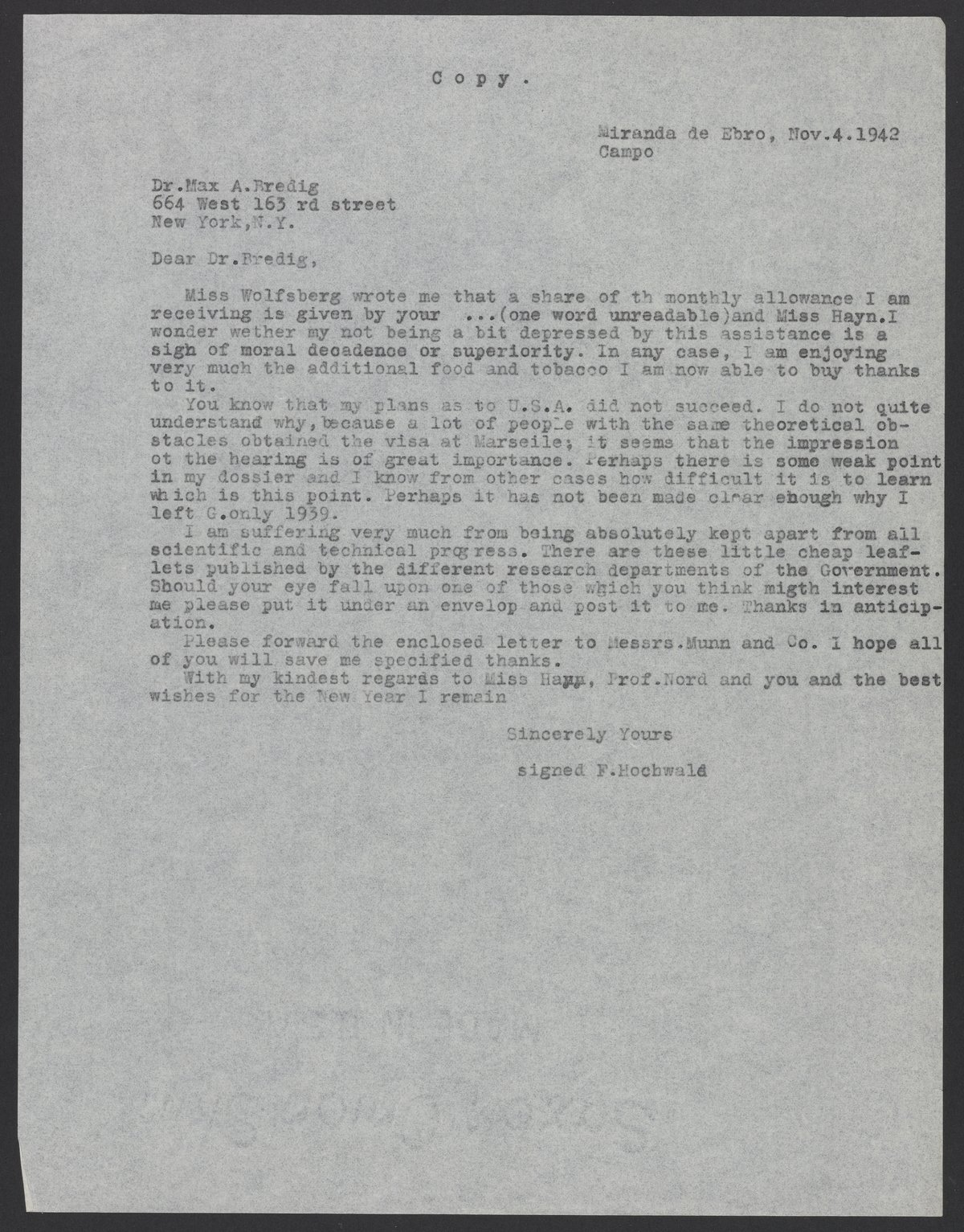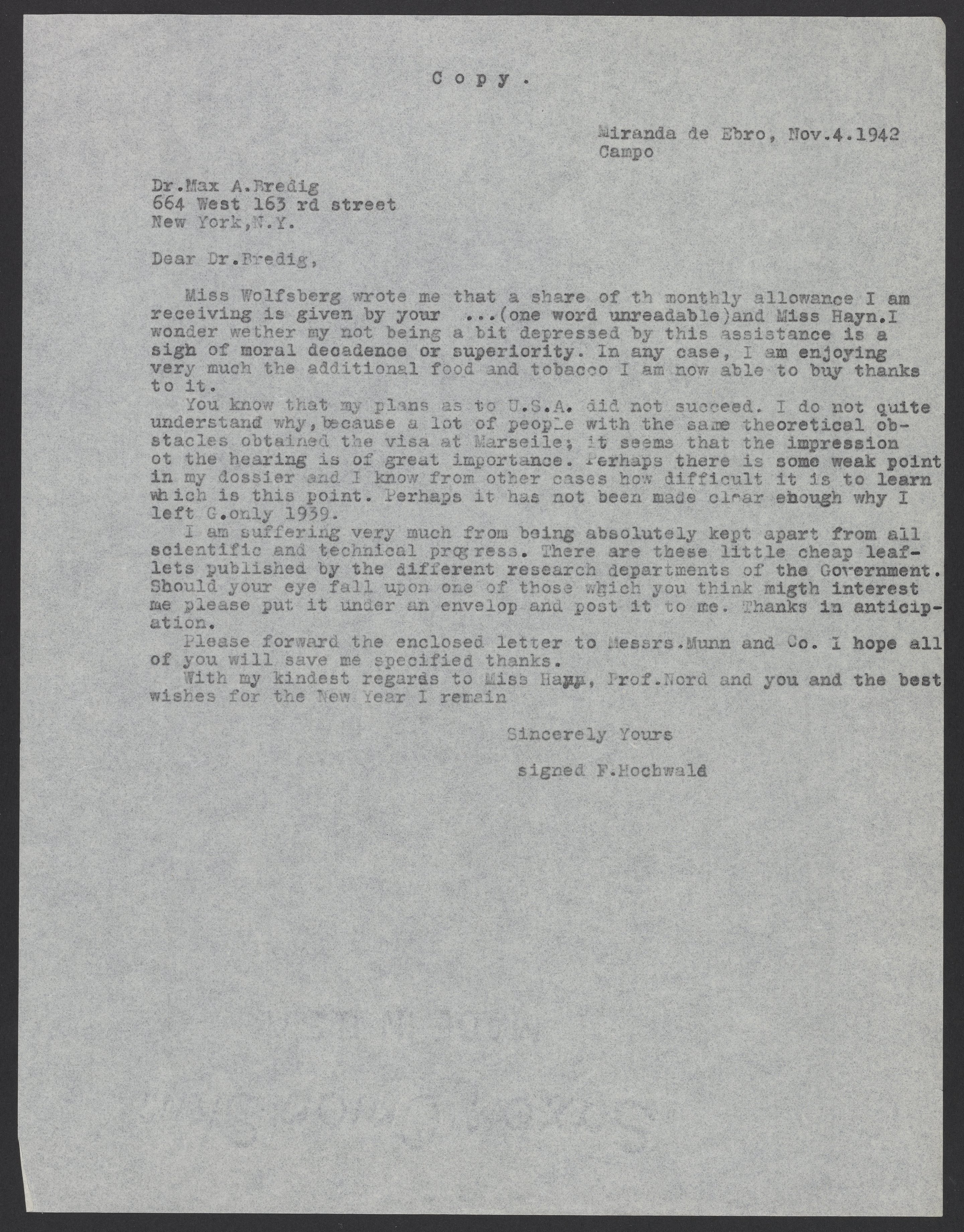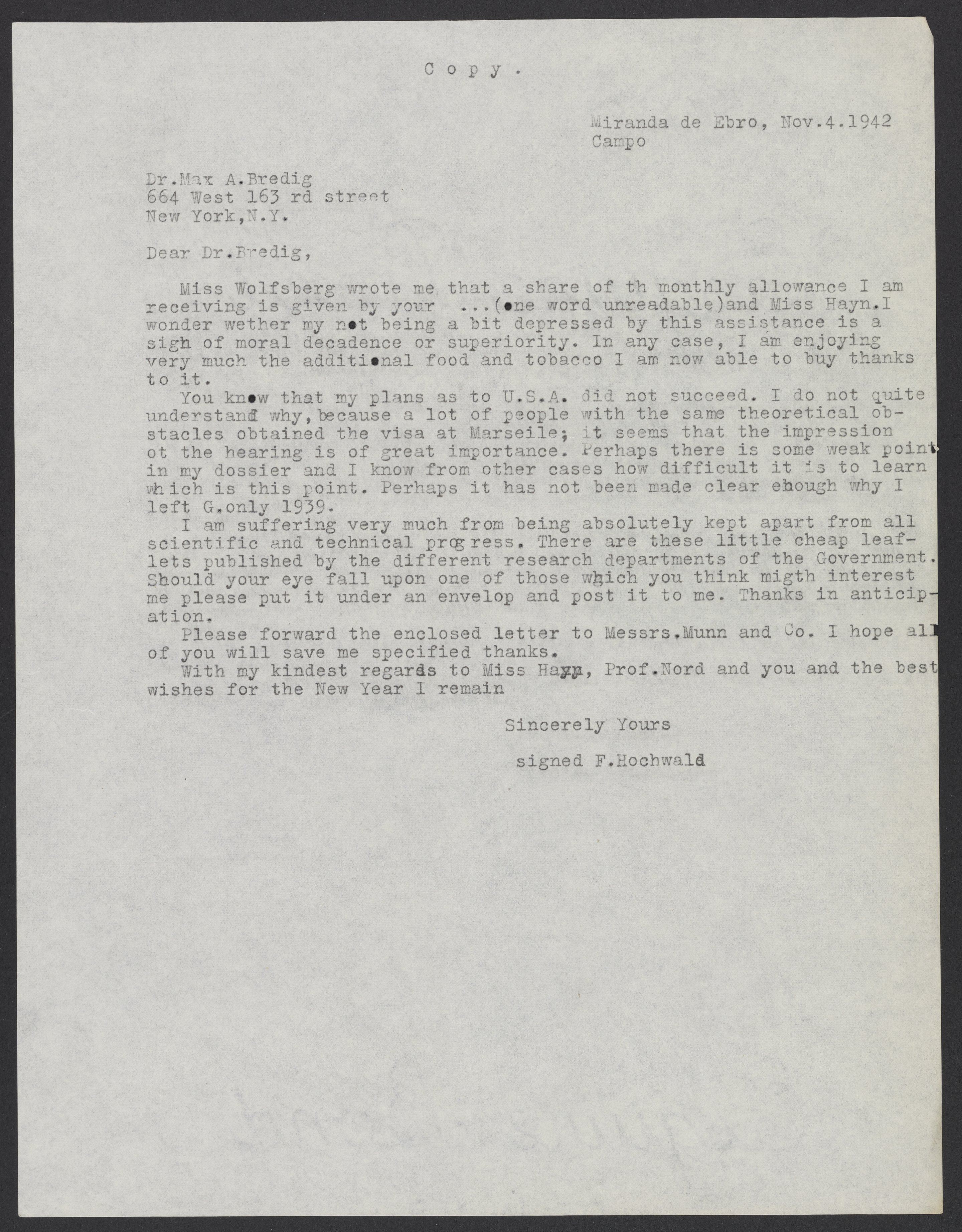 Letter from Fritz Hochwald to Max Bredig, November 4, 1942