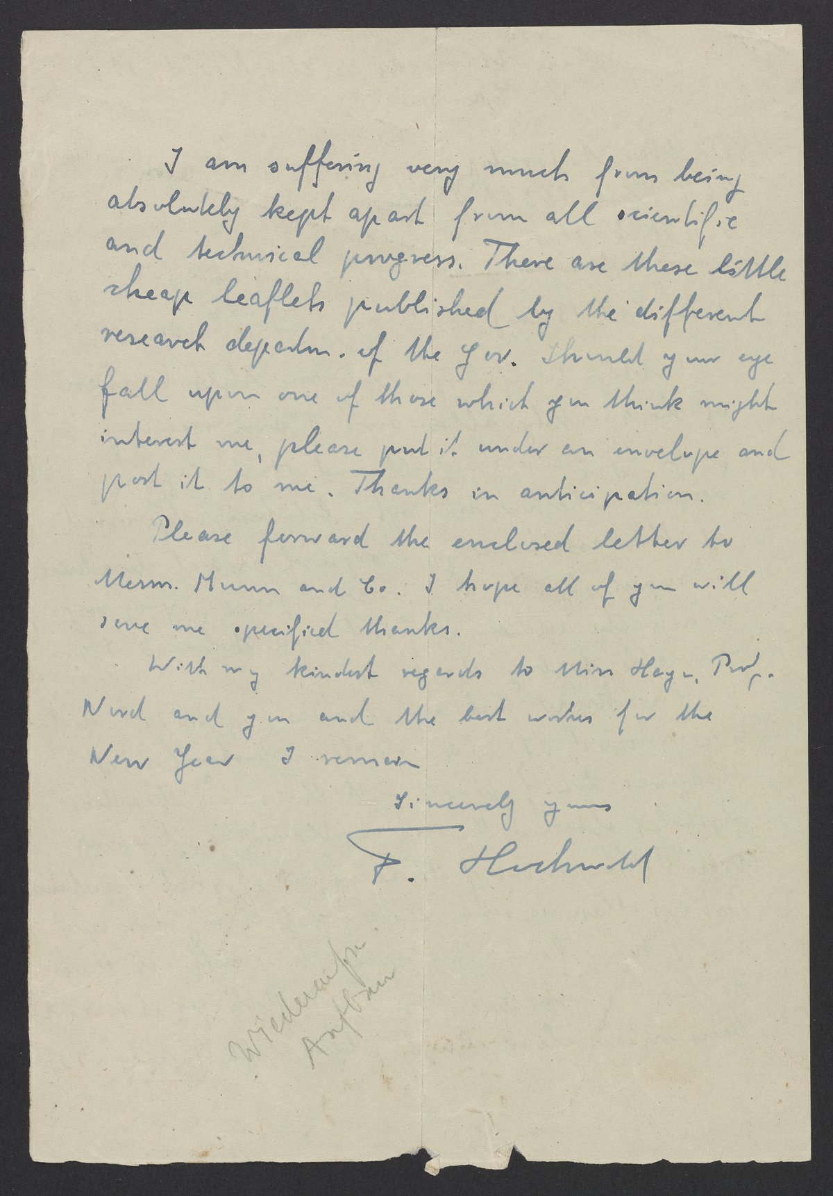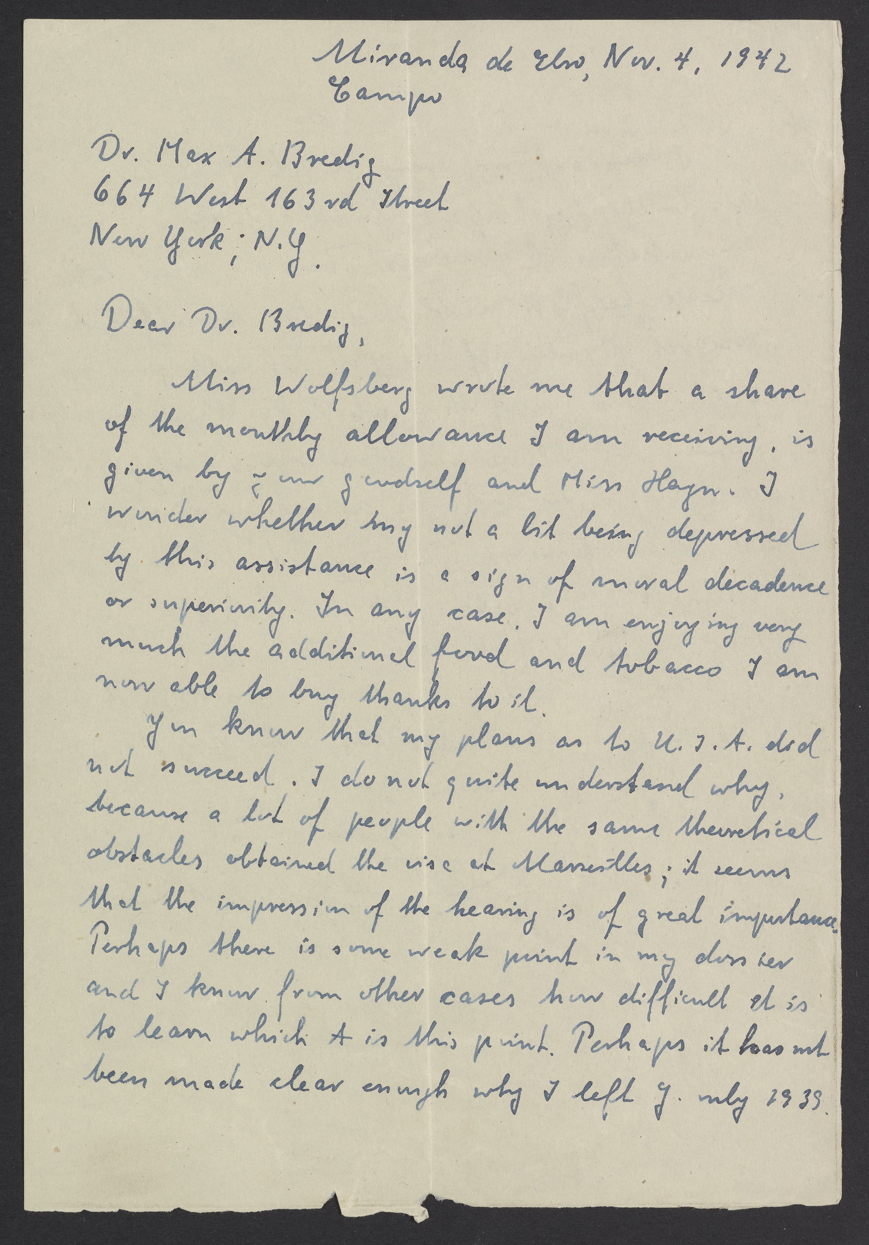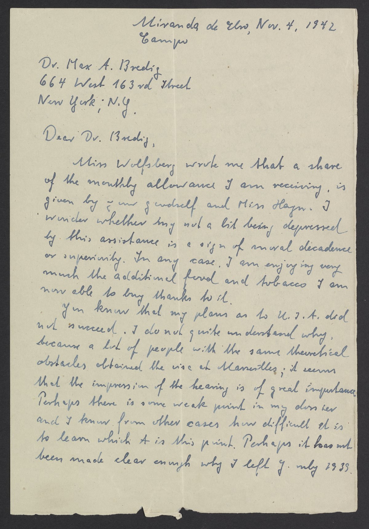 Letter from Fritz Hochwald to Max Bredig, November 4, 1942