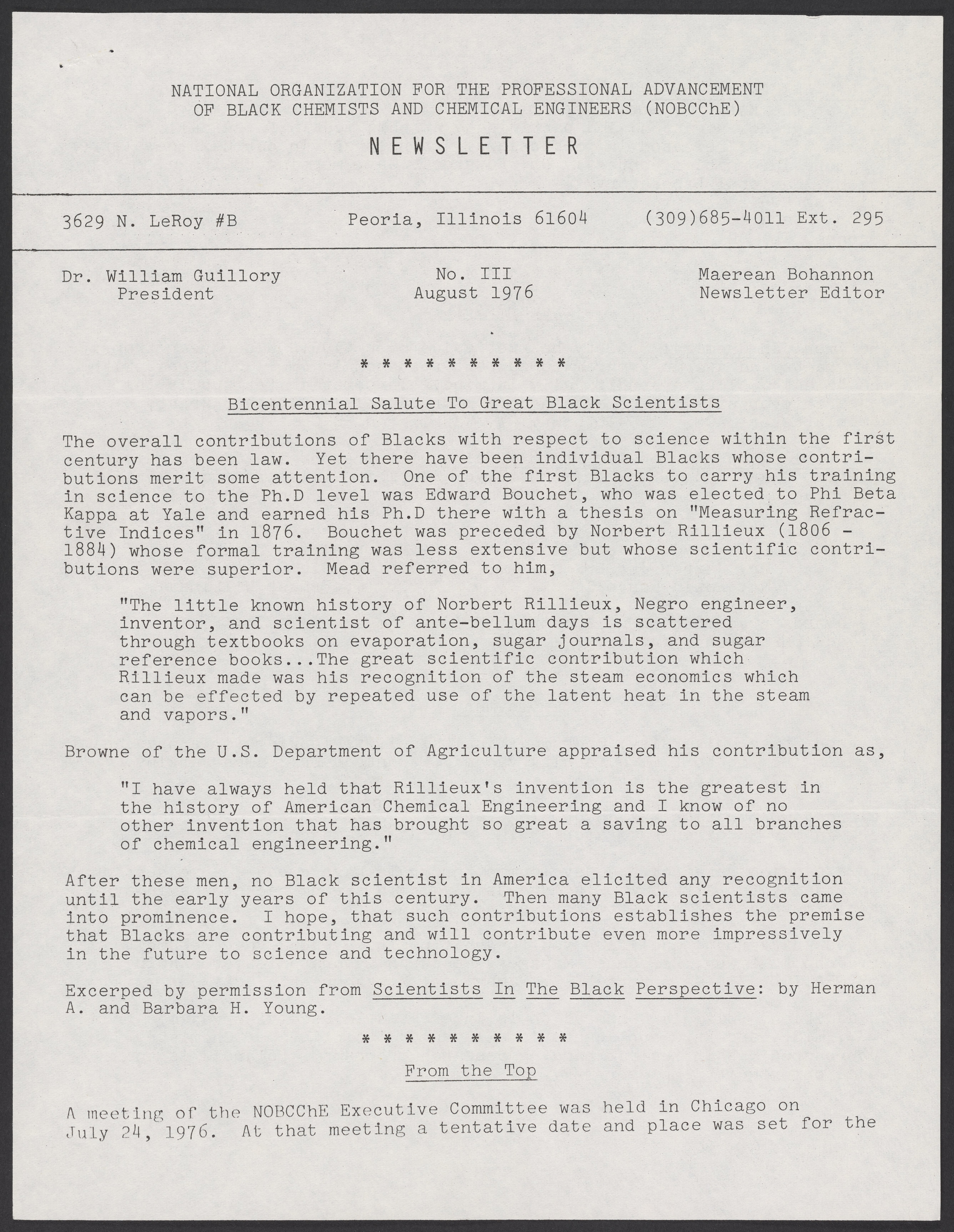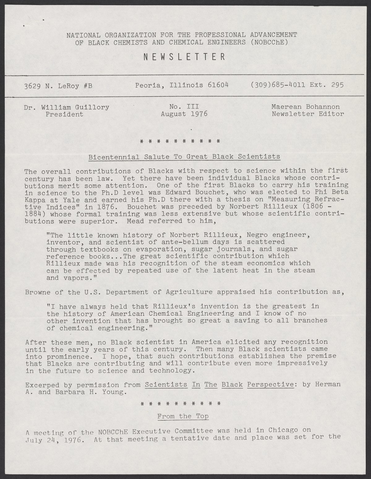 Small JPG1200 x 1549px — 349 KBLarge JPG2880 x 3717px — 1.8 MBFull-sized JPG5342 x 6894px — 5.8 MBOriginal fileTIFF — 5342 x 6894px — 105 MBIssue number 3 of the National Organization for the Professional Advancement of Black Chemists and Chemical Engineers (NOBCChE) newsletter, published August 1976.