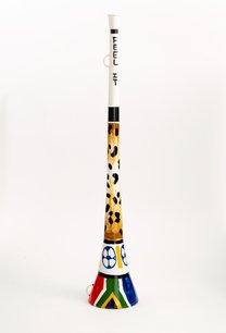 Small JPG1200 x 762px — 55.0 KBLarge JPG2880 x 1829px — 166 KBFull-sized JPG9214 x 5852px — 1.6 MBOriginal fileTIFF — 9214 x 5852px — 154 MBWhite plastic horn-shaped noise maker used by cheering fans at the 2010 Fifa World Cup held in South Africa. The vuvuzela is handpainted in multiple colors with acrylic paint. The horn's bell is decorated with the South African flag and the body is decorated with animal print.