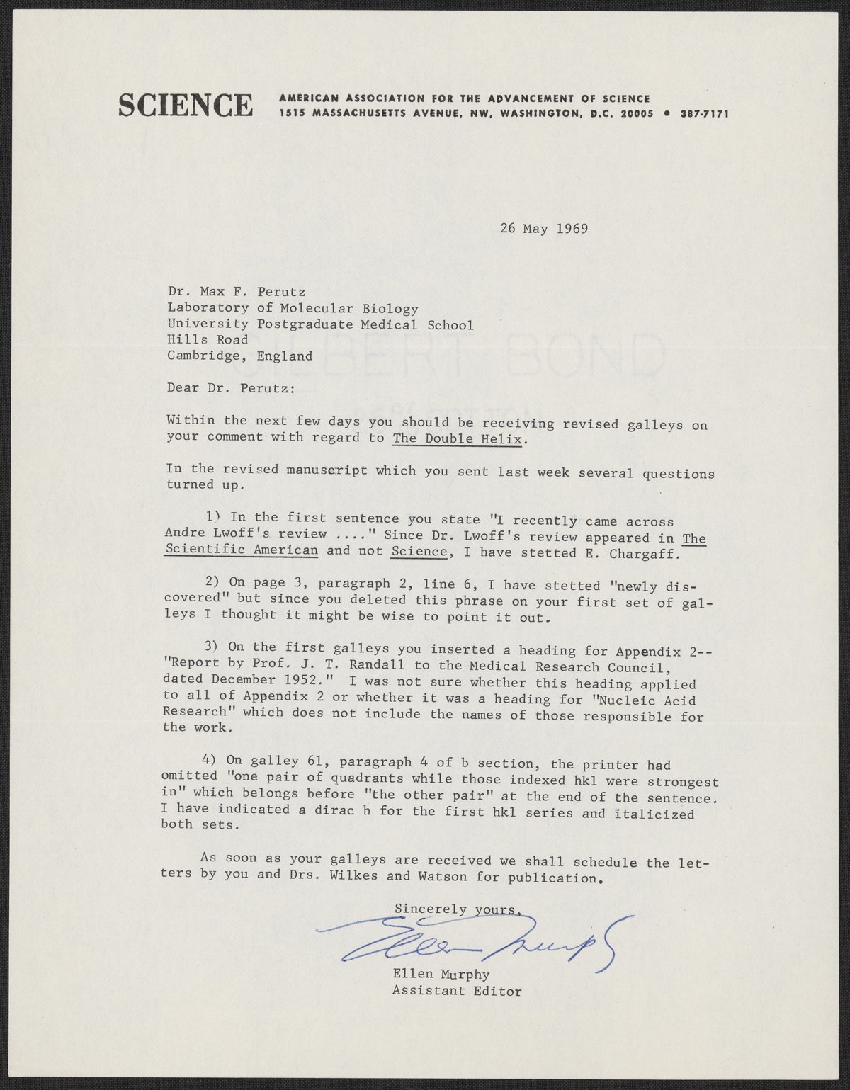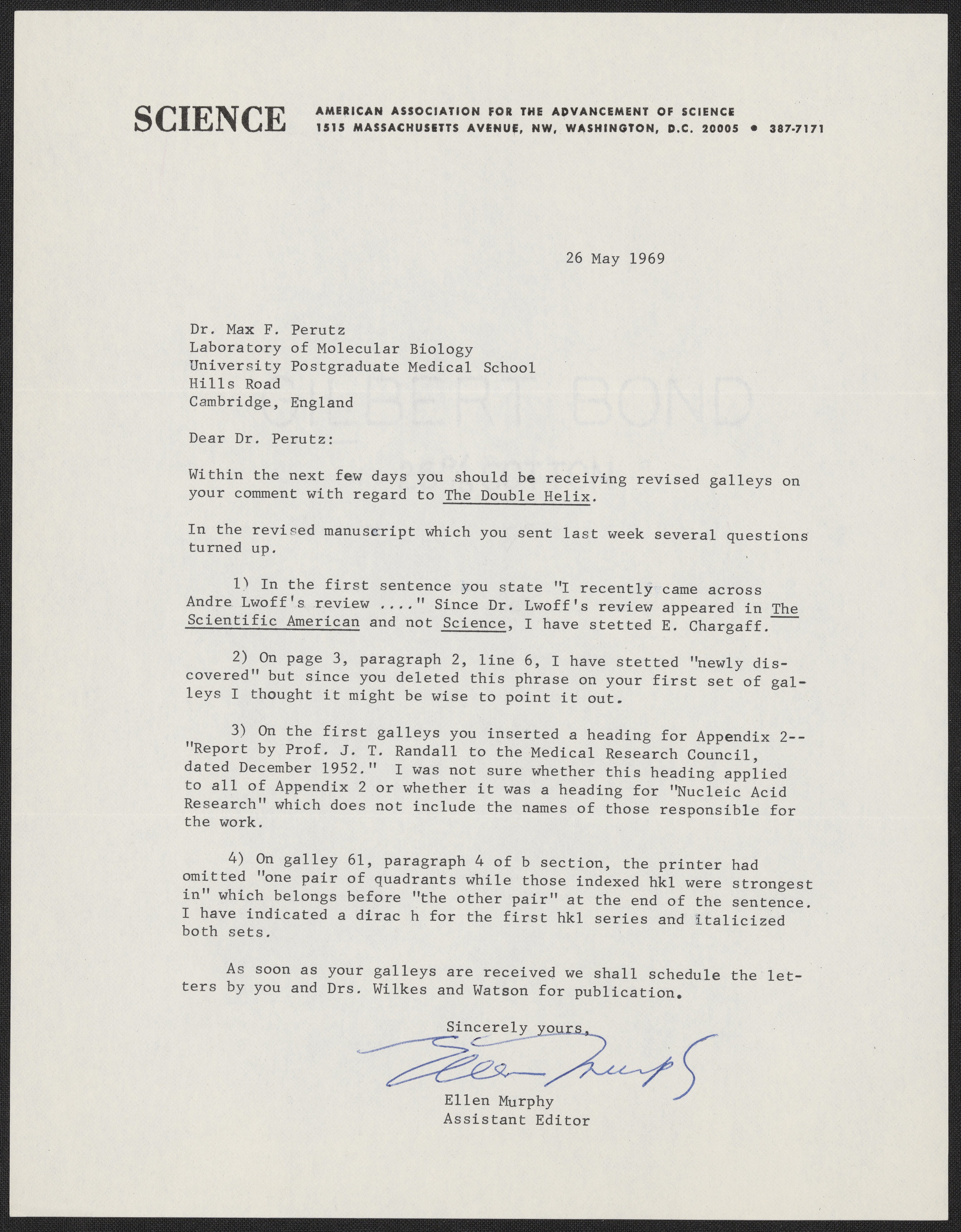 “Letter from Ellen Murphy to Max Perutz, May 26, 1969,” May 26, 1969. History of Molecular Biology Collection, Box 88, Folder 3. Science History Institute. Philadelphia. https://digital.sciencehistory.org/works/ebo8vry.