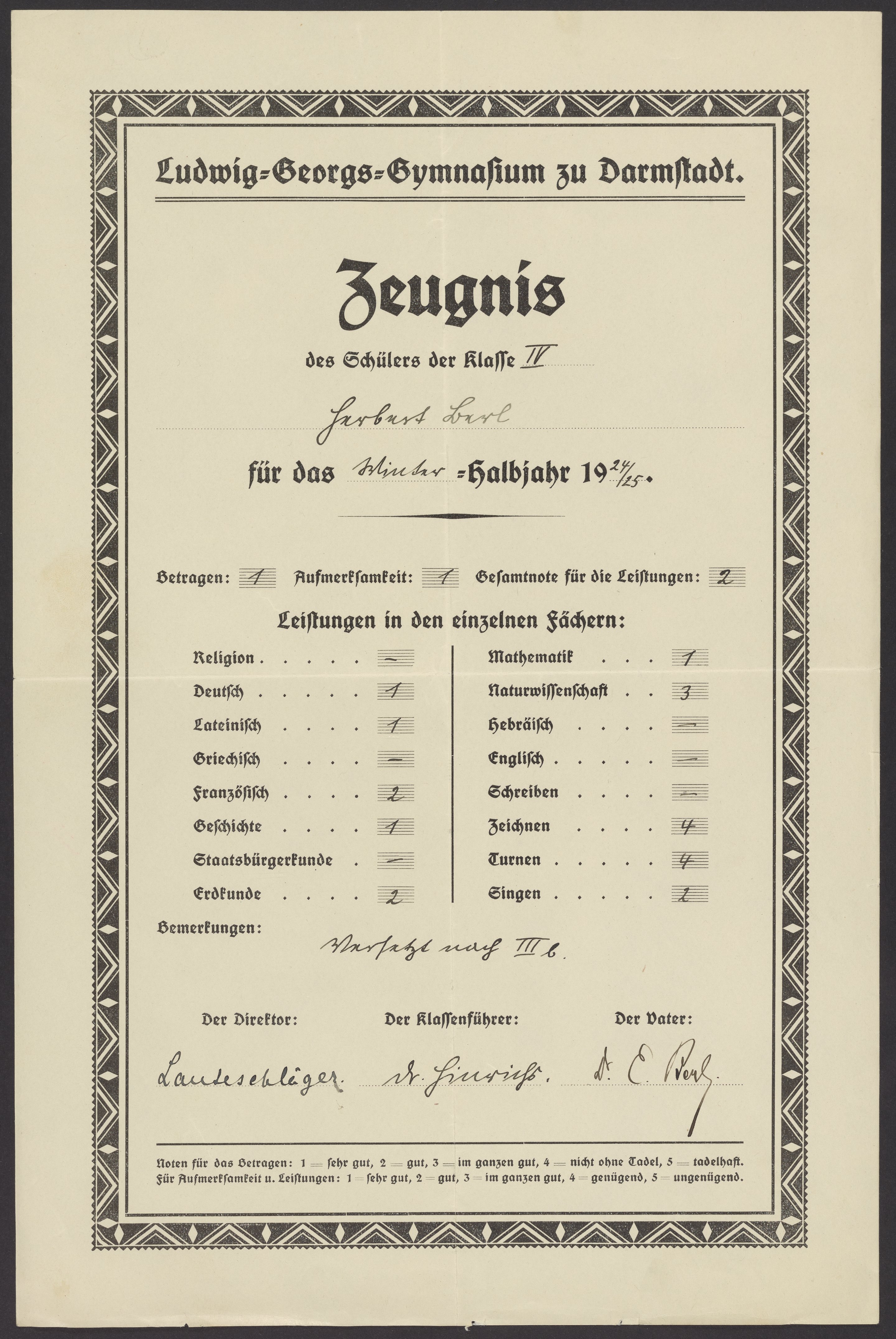 Ludwig-Georgs-Gymnasium (Darmstadt, Germany). “Herbert Berl's School Report Card, 1924-1925,” 1924–1925. Ernst Berl Papers, Box 9, Folder 8. Science History Institute. Philadelphia. https://digital.sciencehistory.org/works/ebteo0h.