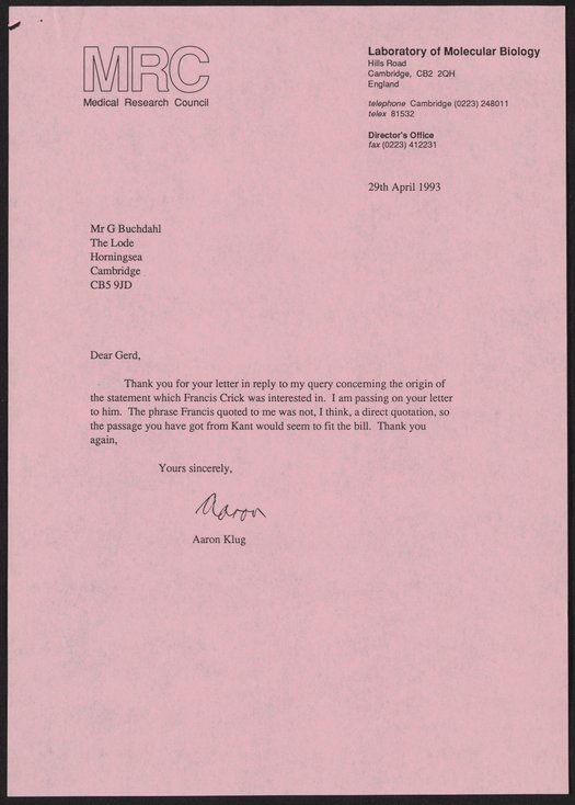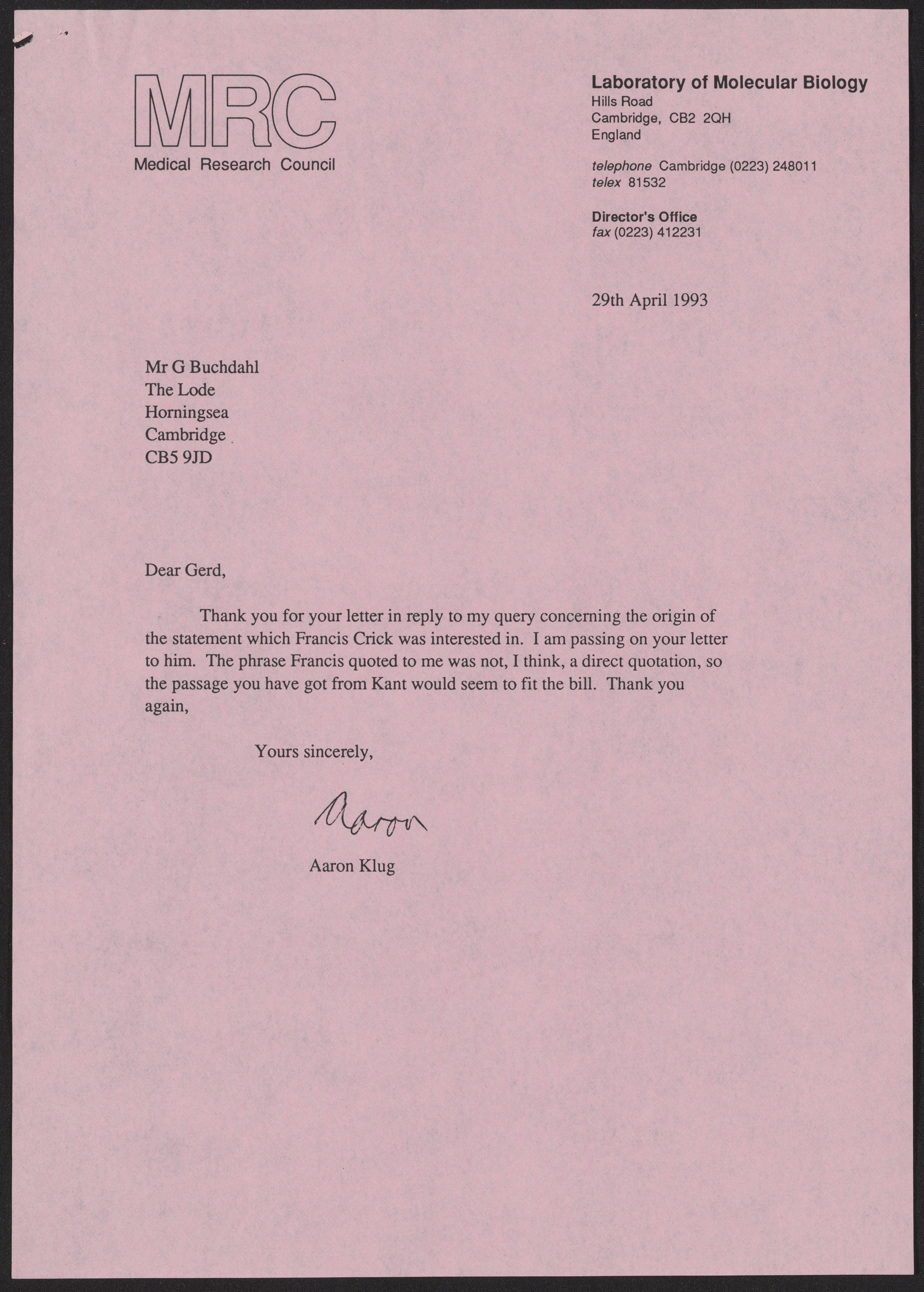 Klug, A. (Aaron), Sir. “Letter from Aaron Klug to Gerd Buchdahl, April 29, 1993,” April 29, 1993. History of Molecular Biology Collection, Box 20, Folder 5. Science History Institute. Philadelphia. https://digital.sciencehistory.org/works/ed5jtgv.