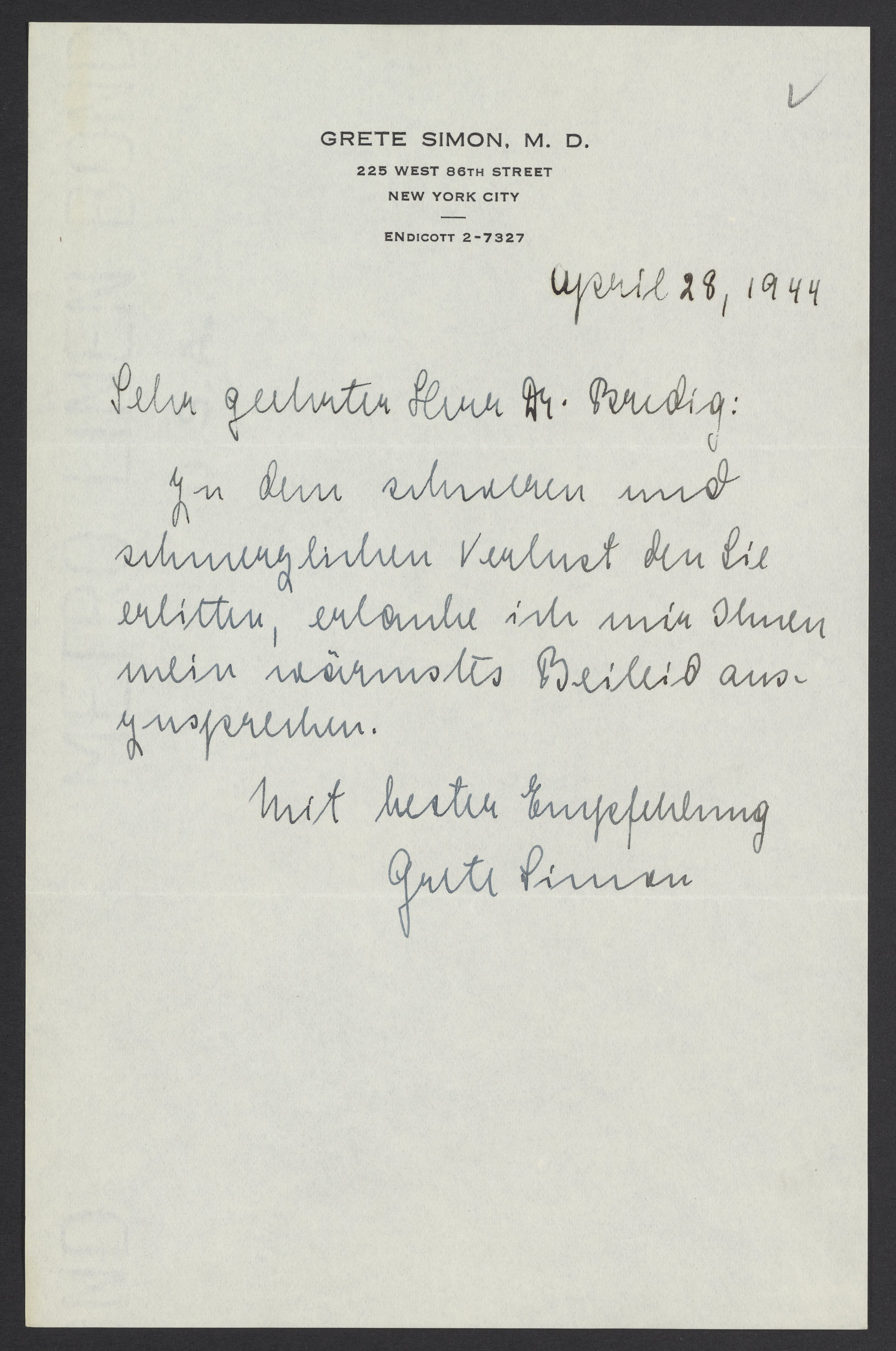 Simon, Grete. “Letter of Condolence from Dr. Grete Simon to Max Bredig,” April 28, 1944. Papers of Georg and Max Bredig, Box 8, Folder 37. Science History Institute. Philadelphia. https://digital.sciencehistory.org/works/eek658w.