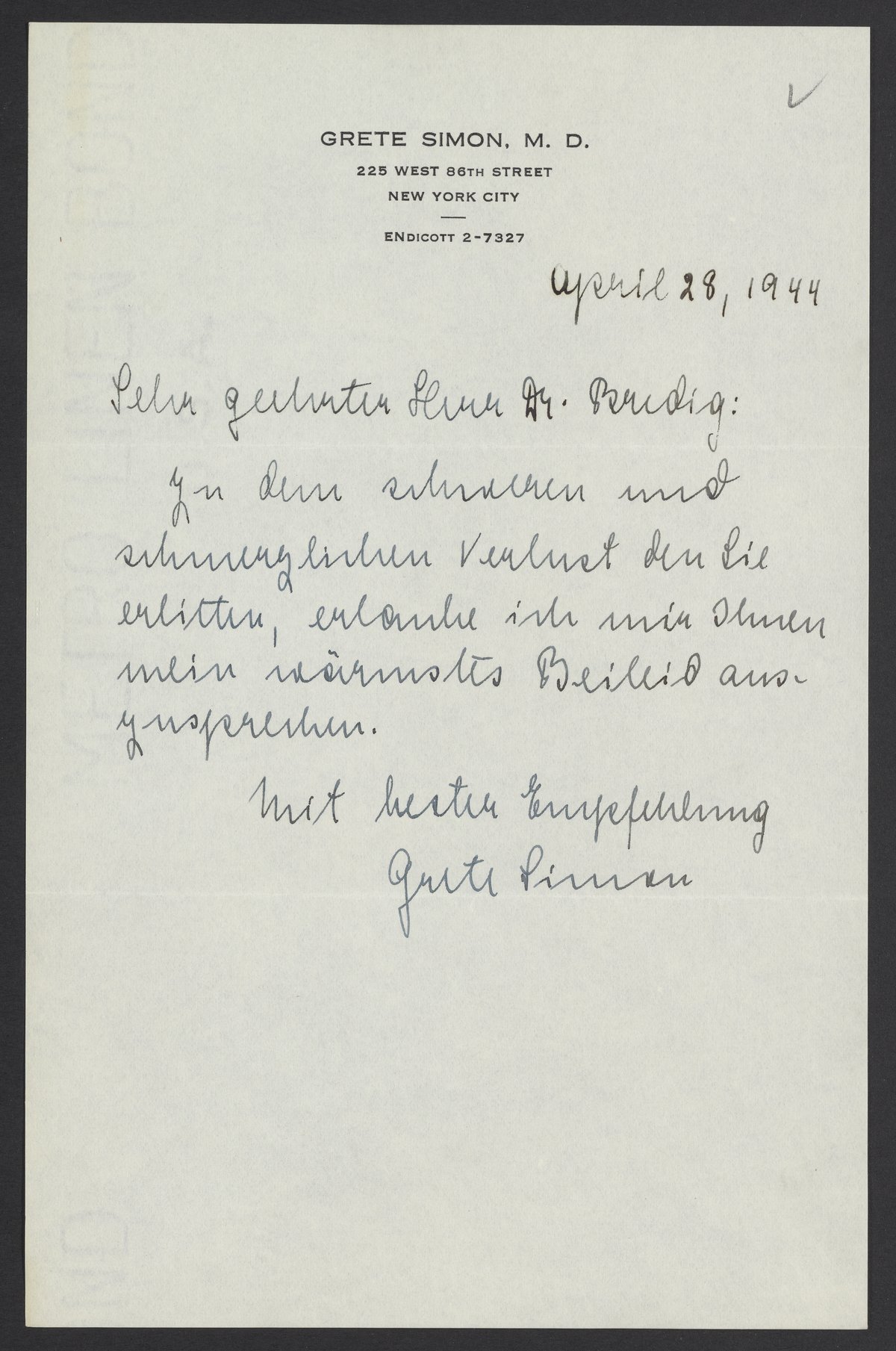 Letter of condolence regarding the death of Georg Bredig (1868-1944) from Grete Simon to Max Albert Bredig (1902-1977).
