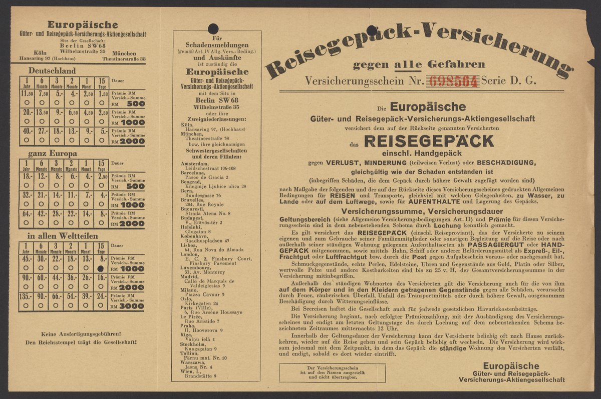 Europäische güter und reisegepäck-versicherungs-aktiengesellschaft. “Reisegepäck-Versicherung,” September 30, 1937. Papers of Georg and Max Bredig, Box 10, Folder 17. Science History Institute. Philadelphia. https://digital.sciencehistory.org/works/ei3coei.