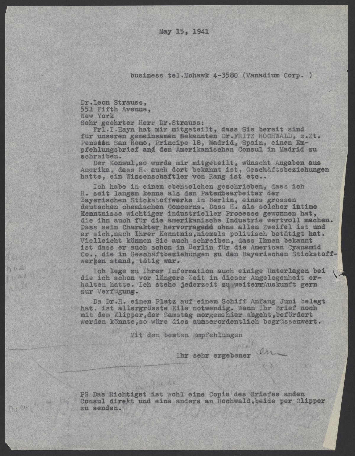 Fr. I. Hayn hat mir mitgeteilt, dass Sie bereit sind für unseren gemeinsamen Bekannten Dr. FRITZ HOCHWALD, z.Zt. Pension San Remo, Principe 18, Madrid, Spain, einen Empfehlungsbrief an den Amerikanischen Consul in Madrid zu schreiben.