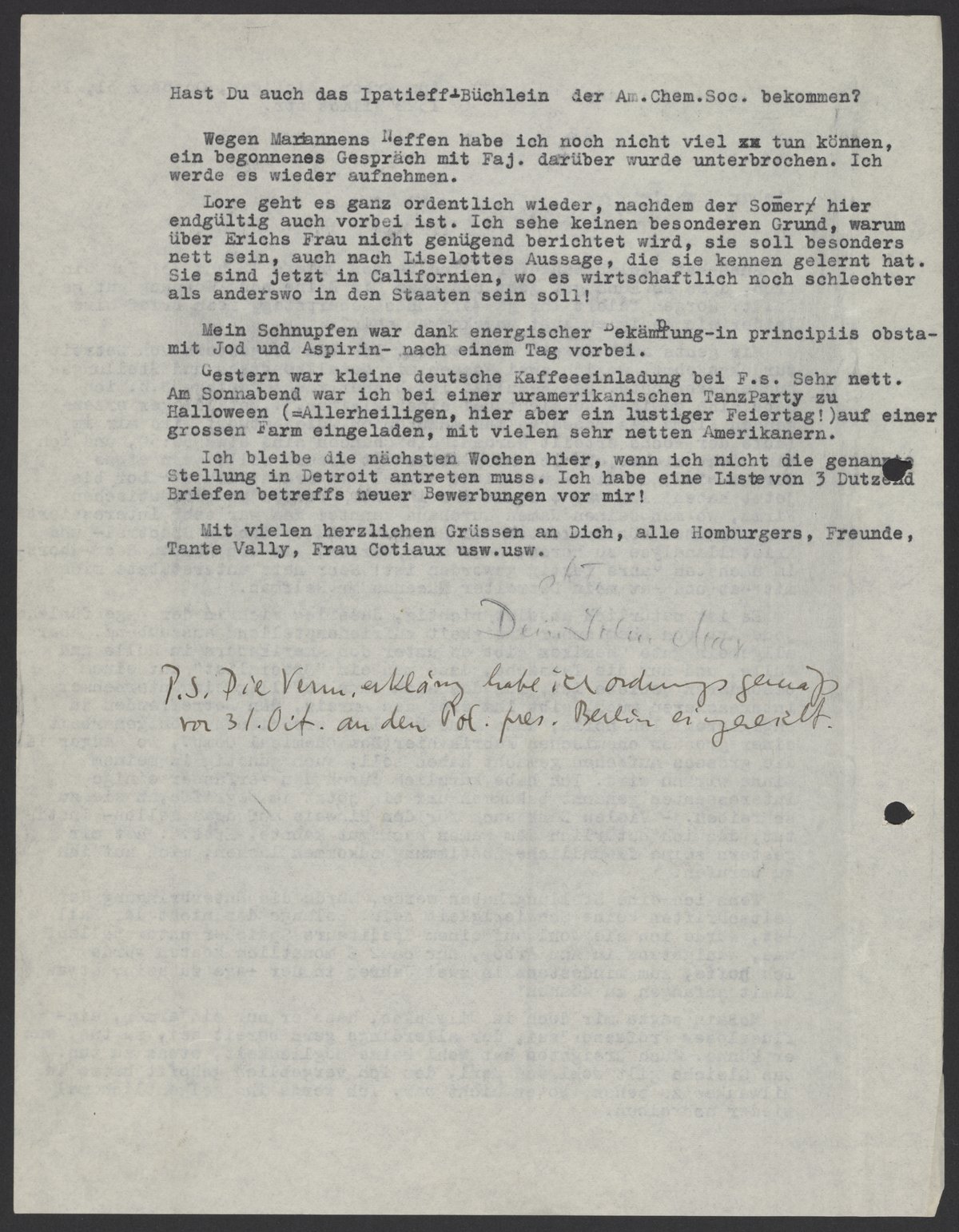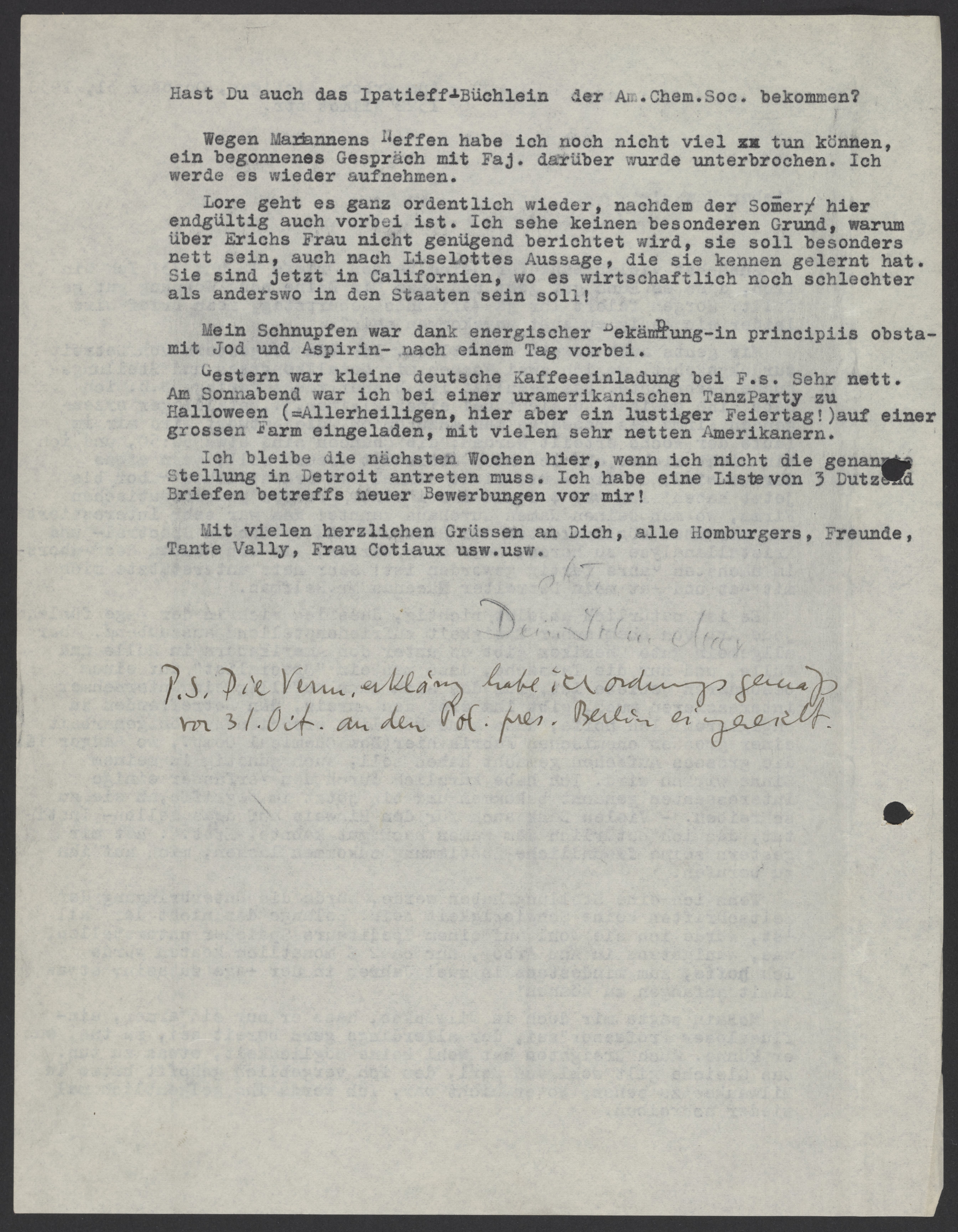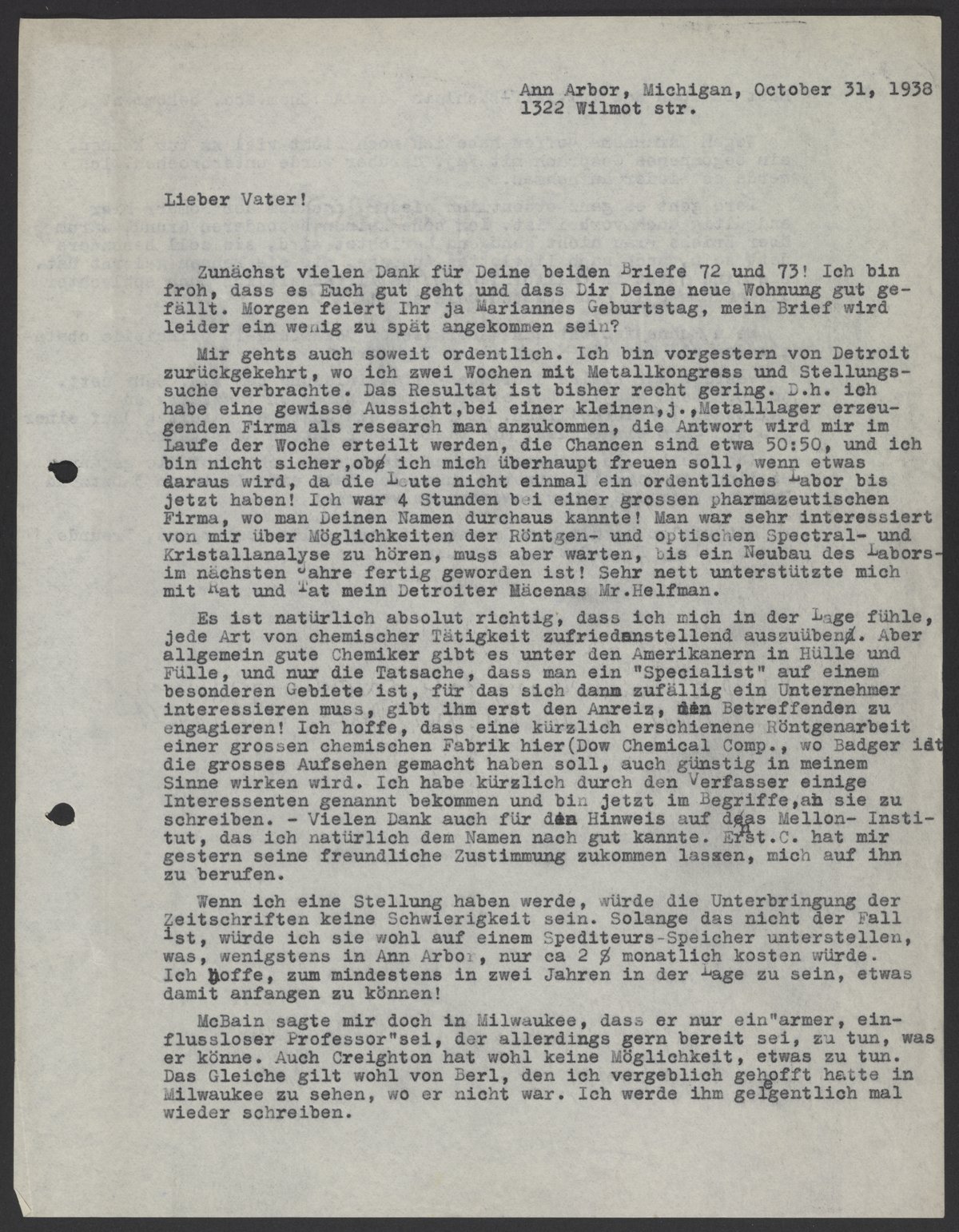 Mir gehts auch soweit ordentlich. Ich bin vorgestern von Detroit zurueckgekehrt, wo ich zwei Wochen mit Metallkongress und Stellungssuche verbrachte. Das Resultat ist bisher recht gering. D.h. ich habe eine gewisse Aussicht, bei einer kleinen, j., Metallager erzeugenden Firma als research man anzukommen, die Antwort wird mir im Laufe der Woche erteilt werden, die Chancen sind etwa 50:50, und ich bin nicht sicher, ob ich mich überhaupt freuen soll, wenn etwas daraus wird, da die Leute nicht einmal ein ordentliches Labor bis jetzt haben! Ich war 4 Stunden bei einer grossen pharmazeutischen Firma, wo man Deinen Namen durchaus kannte! Man war sehr interessiert von mir über Möglichkeiten der Röntgen-und optischen Spectral-und Krisallanalyse zu hören, muss aber warten, bis ein Neubau des Labors im nächsten Jahre fertig geworden ist! Sehr nett unterstützte mich mit Rat und Tat mein Detroiter Mäcenas Mr. Helfman.