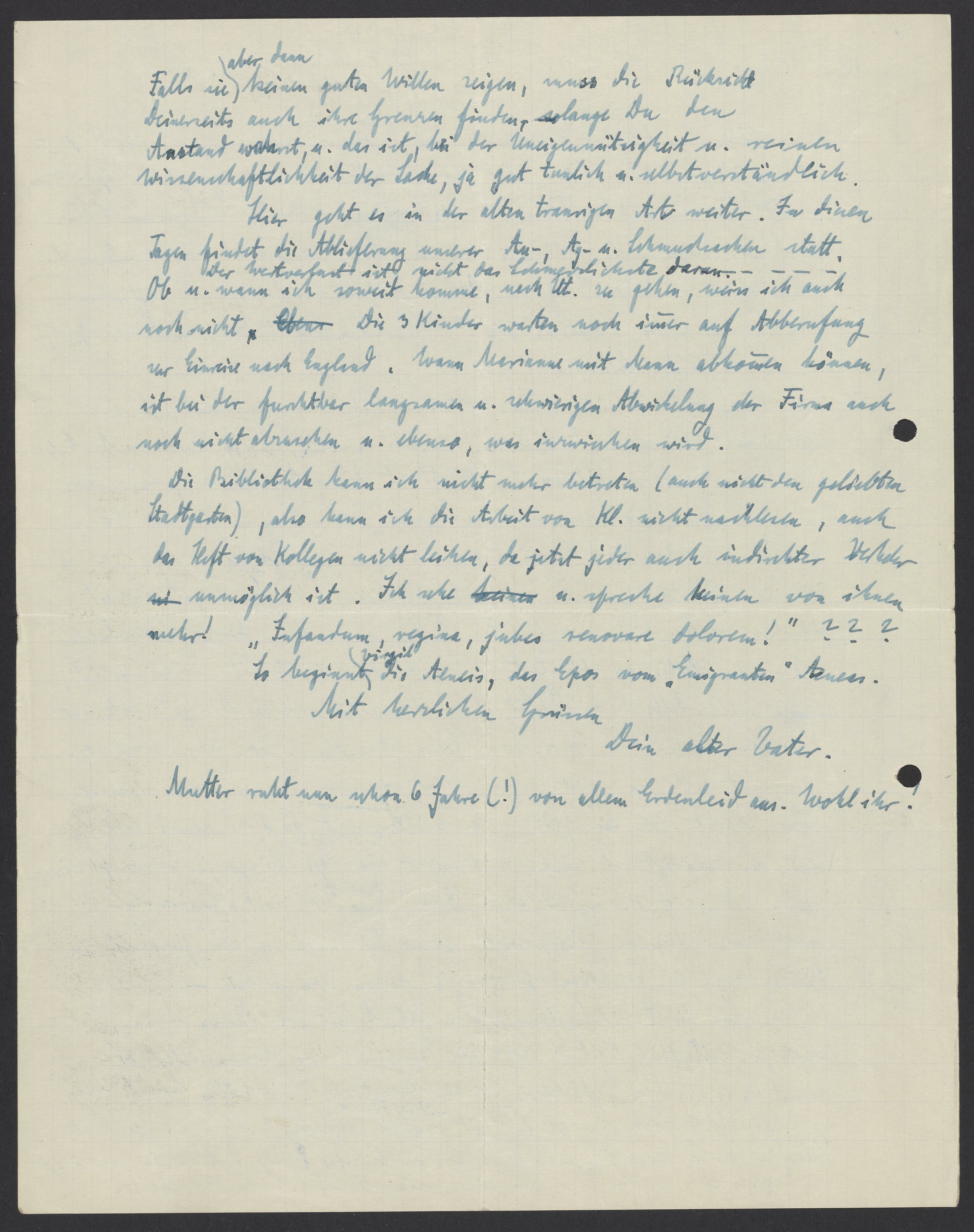Die Bibliothek kann ich nicht mehr betreten (auch nicht den geliebten Stadtgarten), also kann ich die Arbeit von Kl. nicht nachlesen, auch das Heft von Kollegen nicht leihen, da jetzt jeder auch indirekter Verkehr unmöglich ist. Ich sehe u. spreche keinen von ihnen mehr!