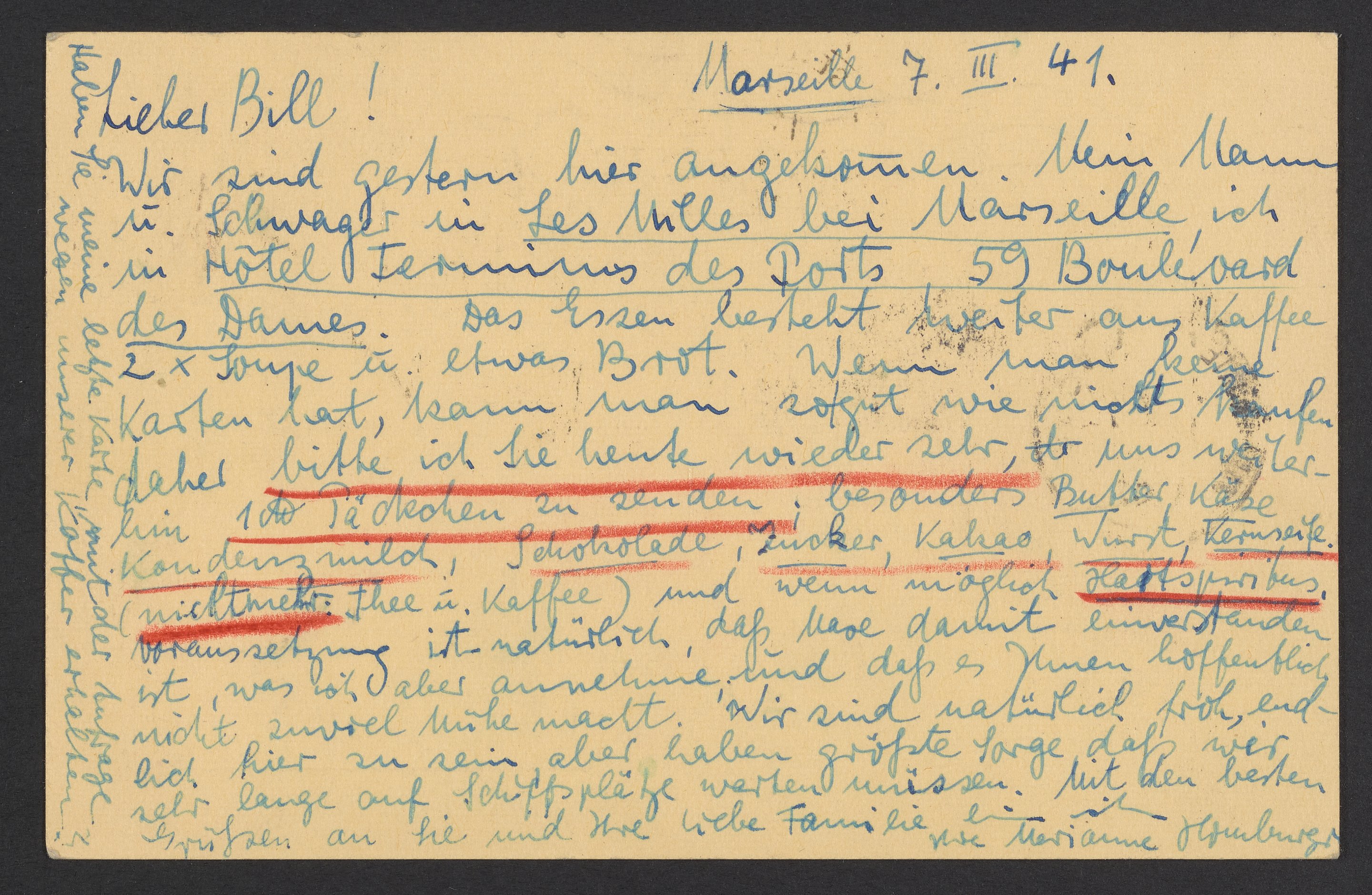 Wir sind gestern hier angekommen. Mein Mann u. Schwager in Les Milles bei Marseille, ich in in Hotel Terminus des Ports 59 Boulevard des Dames. Das Essen besteht weiter aus Kaffee, 2x Soupe u. etwas Brot. Wenn man keine Karten hat, kann man so gut wie nichts kaufen, daher bitte ich Sie heute wieder sehr, uns weiter ein 1 lb. Päckchen zu senden, besonders Butter, Käse, Kondenzmilch, Schokolade, Zucker, Kakao, Wurst, Kernseife (nicht mehr: Thee u. Kaffee) und wenn möglich, Hartspiritus. Voraussetzung ist natürlich, daß Max damit einverstanden ist, was ich aber annehme, und daß es Ihnen nicht zu viel Mühe macht. Wir sind natuerlich froh, endlich hier zu sein, aber haben größte Sorge, daß wer sehr lange auf Schiffsplätze warten müssen. Mit den besten Grüßen an Sie und Ihre liebe Familie bin ich