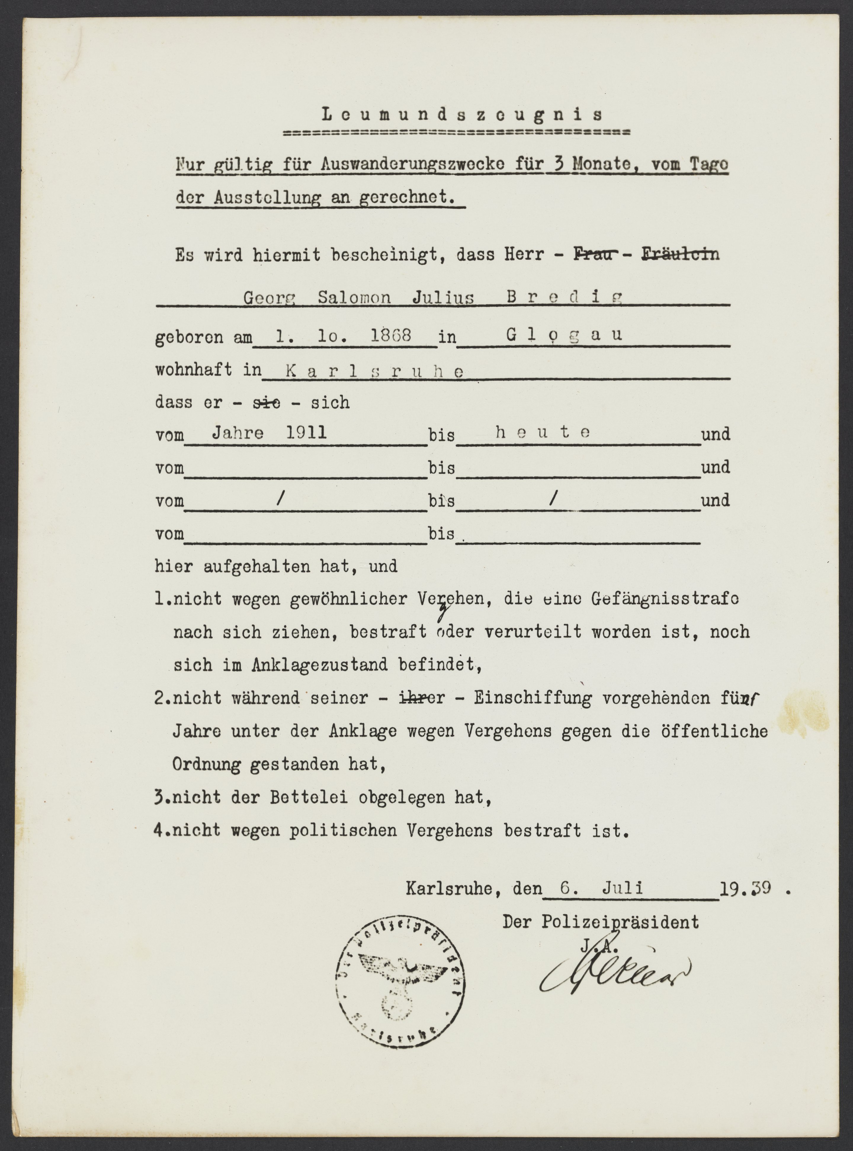 Copy of Georg Bredig's (1868-1944) Leumundszeugnis (certification of good character) issued to him in 1939. These documents were required for emigrating from Germany.