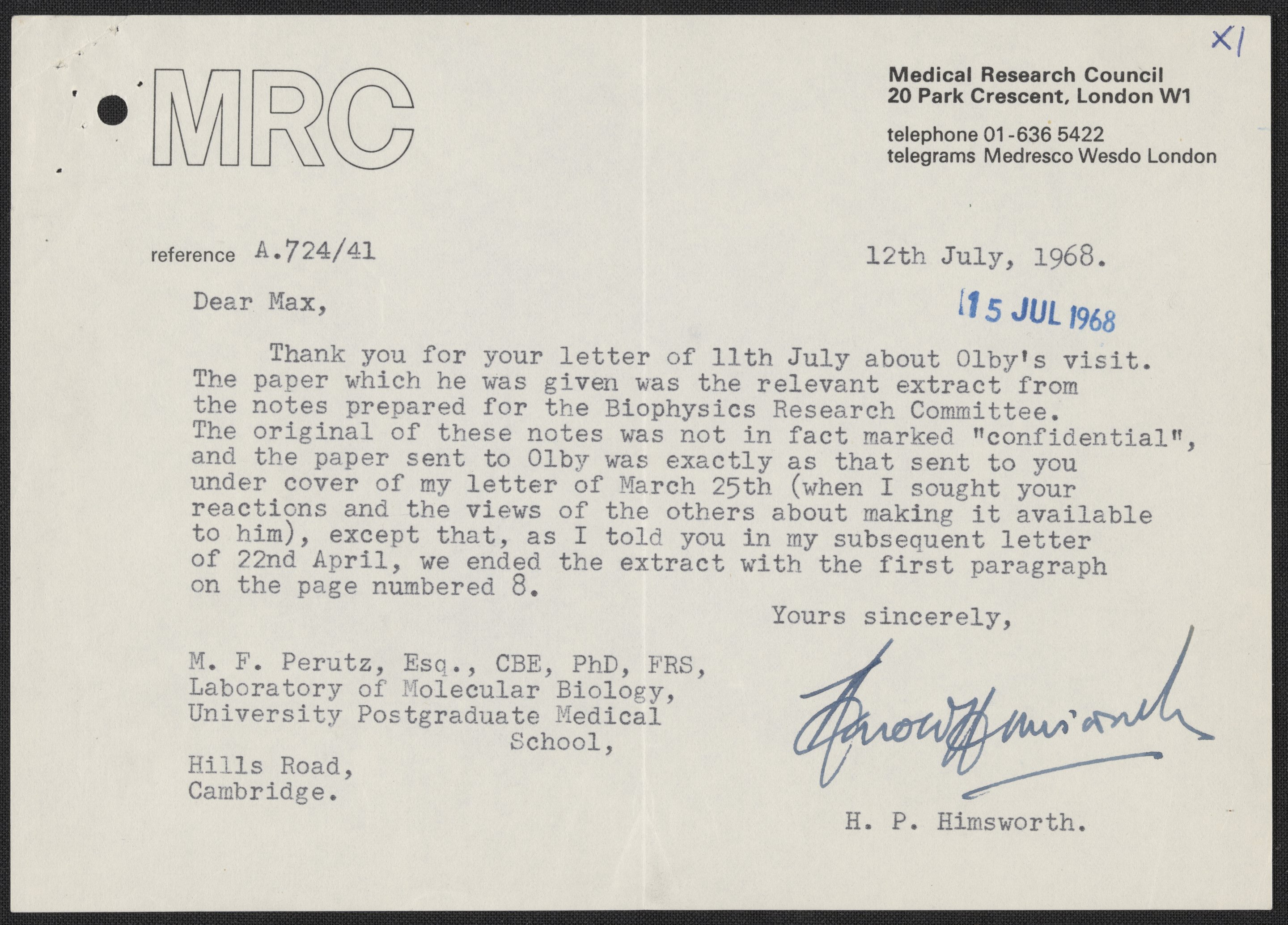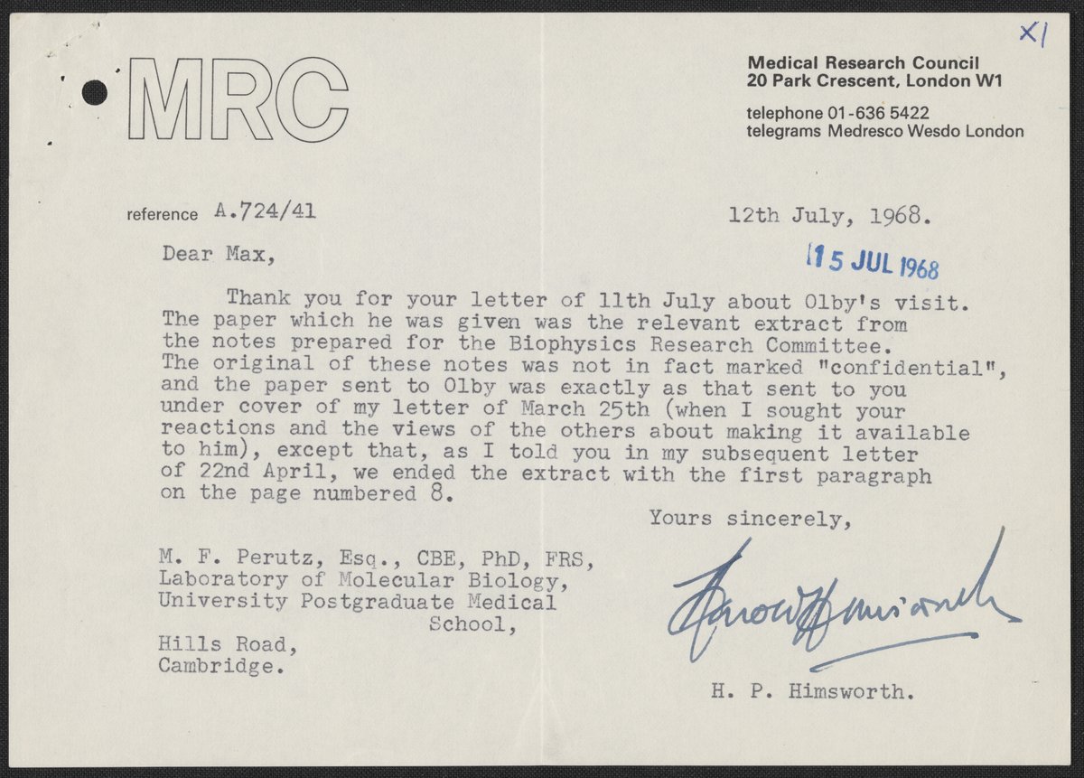 Letter from Harold Himsworth to Max Perutz, July 12, 1968