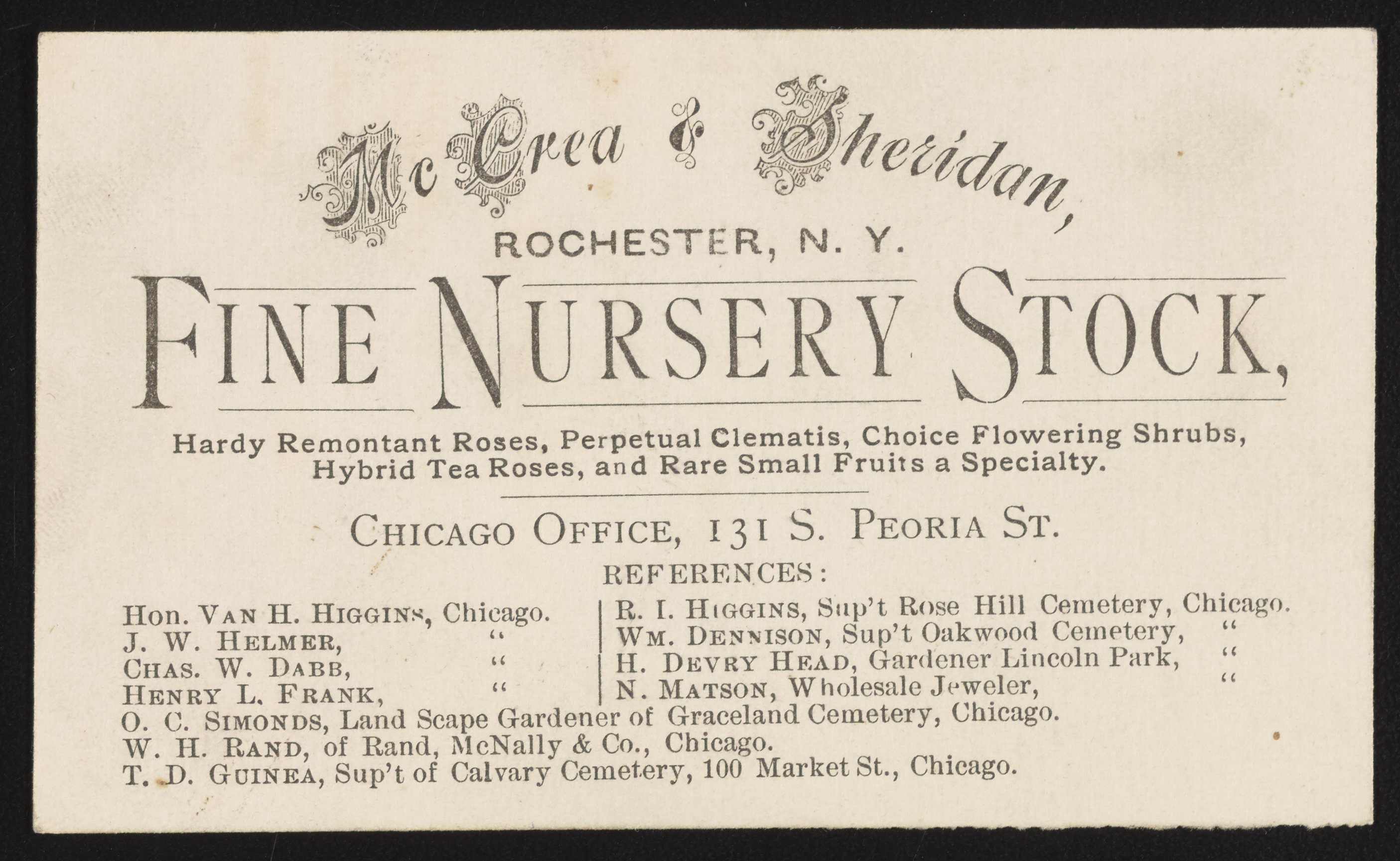 McCrea & Sheridan. “Business Card of McCrea & Sheridan, Fine Nursery Stock,” circa 1883. Papers of James Curtis Booth, Box 2, Folder 10. Science History Institute. Philadelphia. https://digital.sciencehistory.org/works/er64yll.