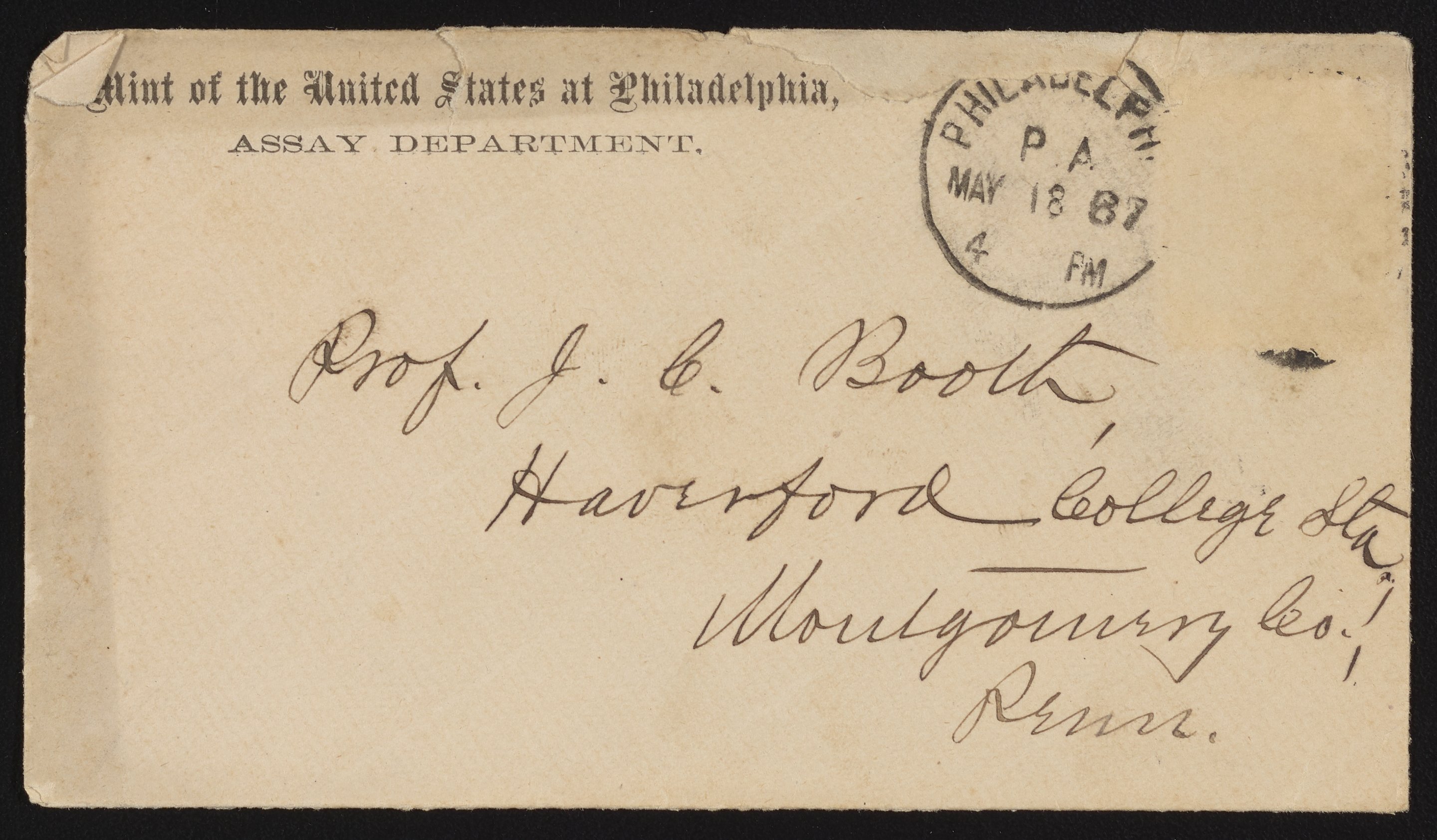 Envelope addressed to James Curtis Booth from the Assay Department, Mint of the United States at Philadelphia
