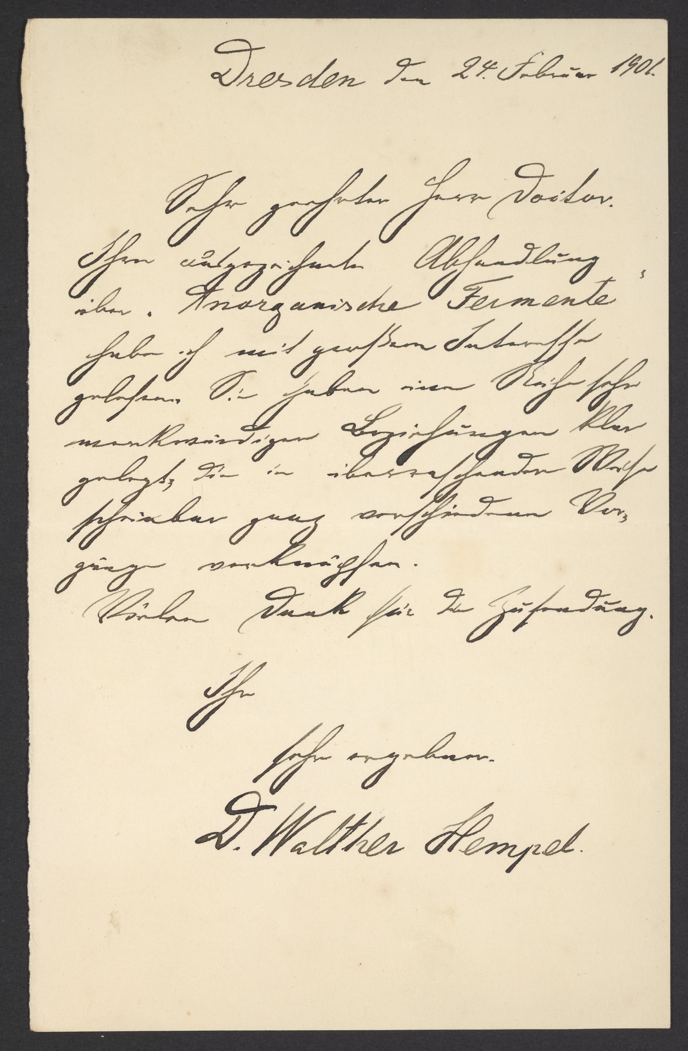 Hempel, Walther. “Letter from Walther Hempel to Georg Bredig,” February 24, 1901. Papers of Georg and Max Bredig, Box 1, Folder 57. Science History Institute. Philadelphia. https://digital.sciencehistory.org/works/ethe99f.