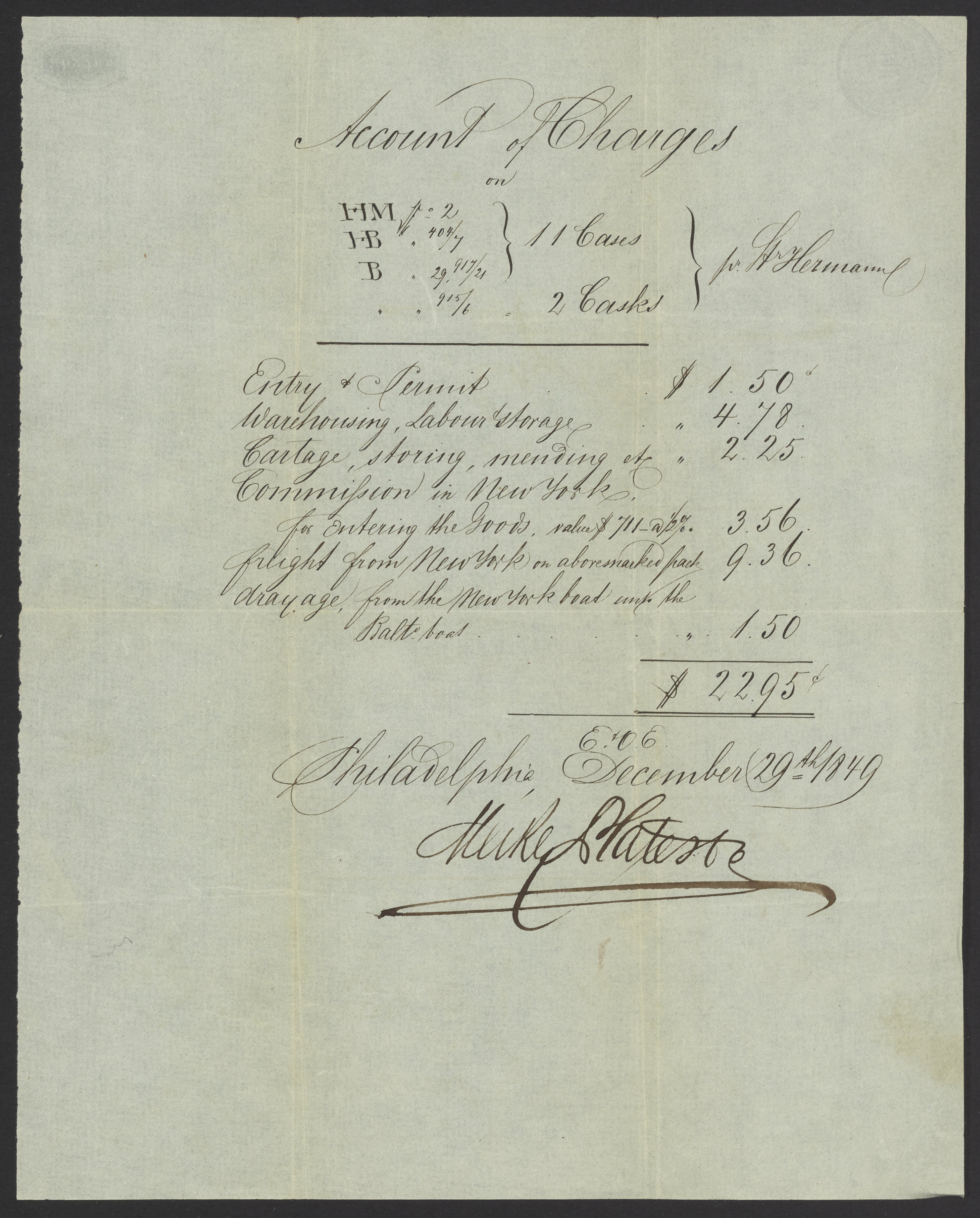 Morfit, Campbell. “List of Account Charges, December 29, 1849,” December 29, 1849. Papers of James Curtis Booth, Box 1, Folder 10. Science History Institute. Philadelphia. https://digital.sciencehistory.org/works/ex345s5.
