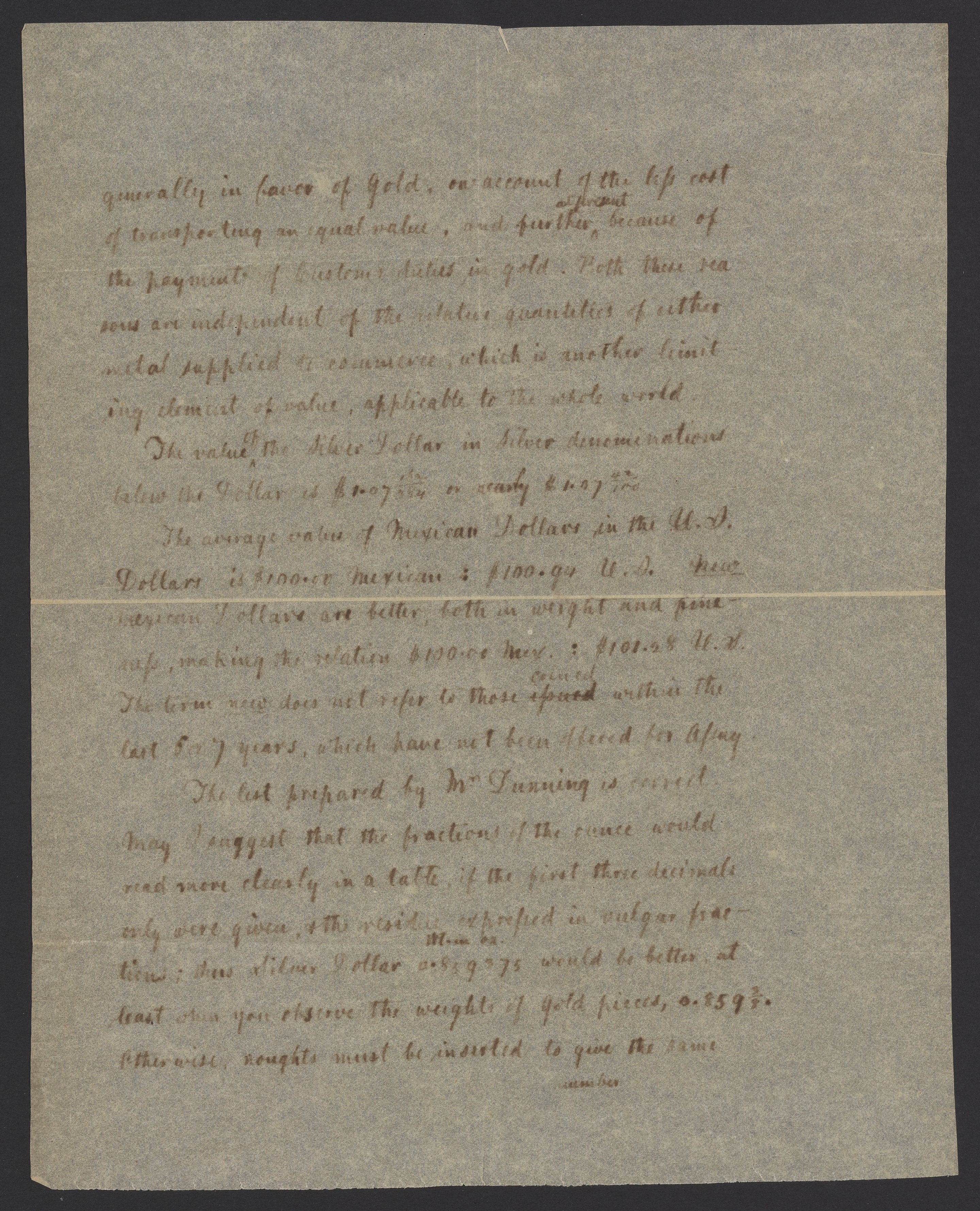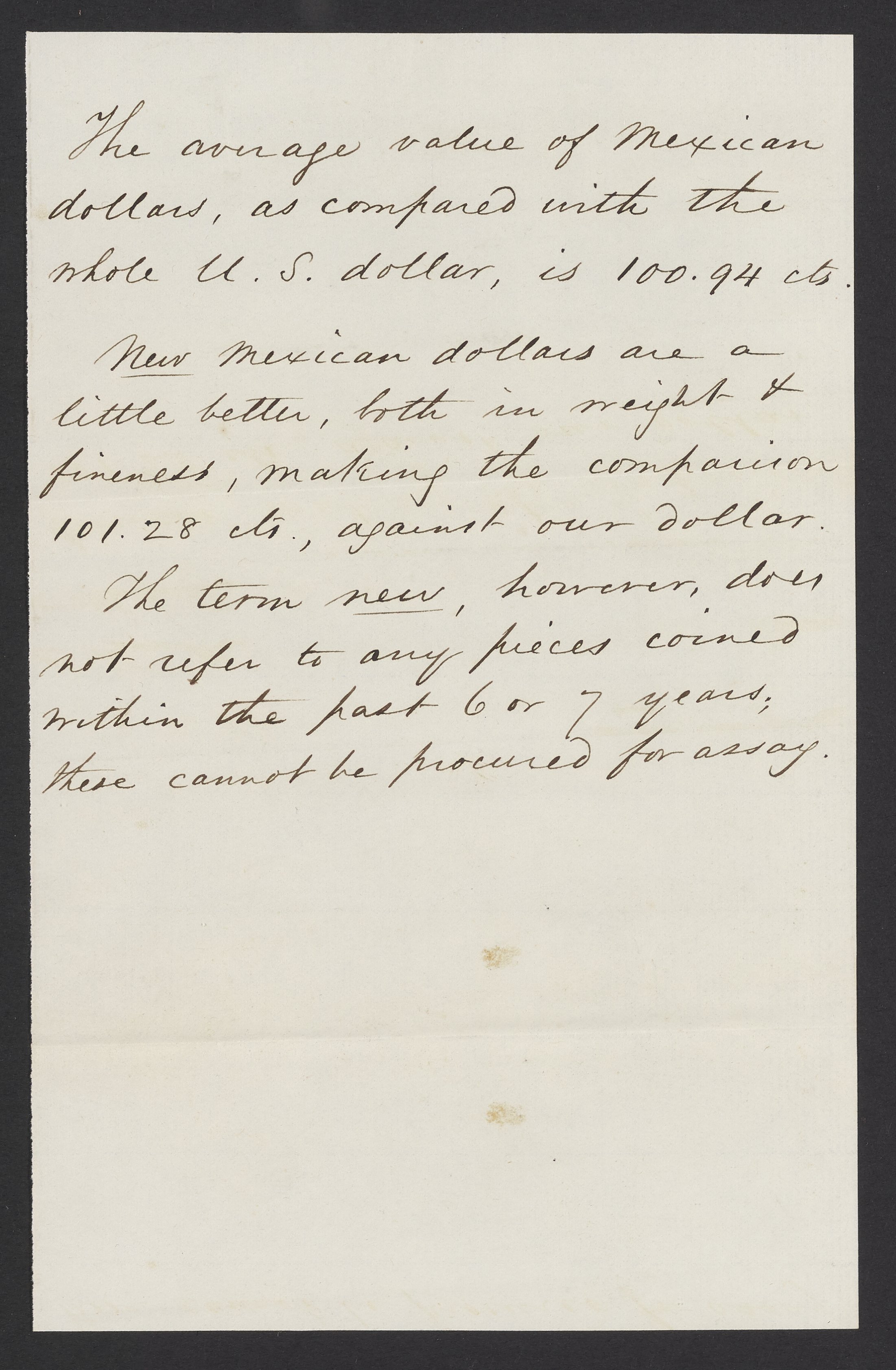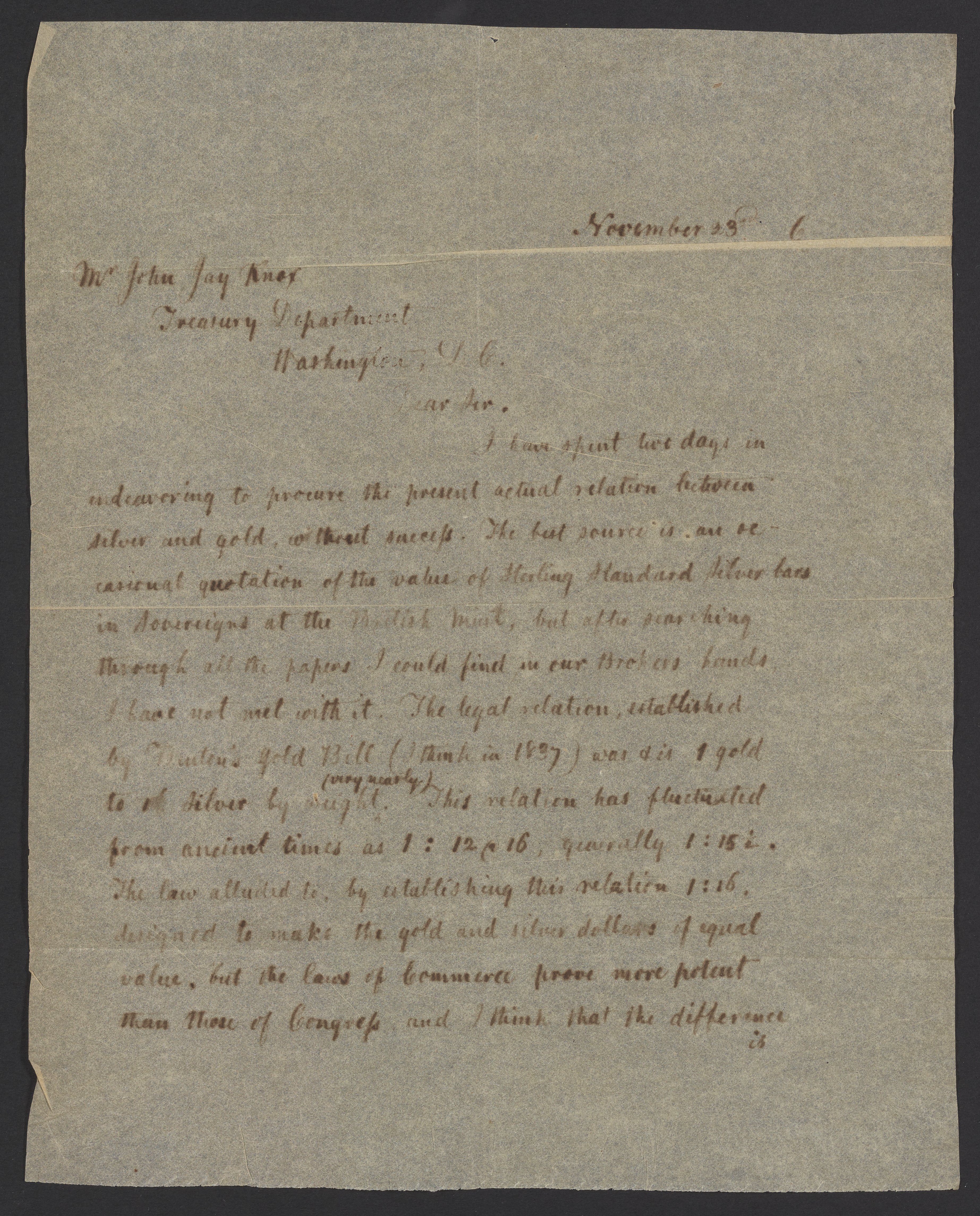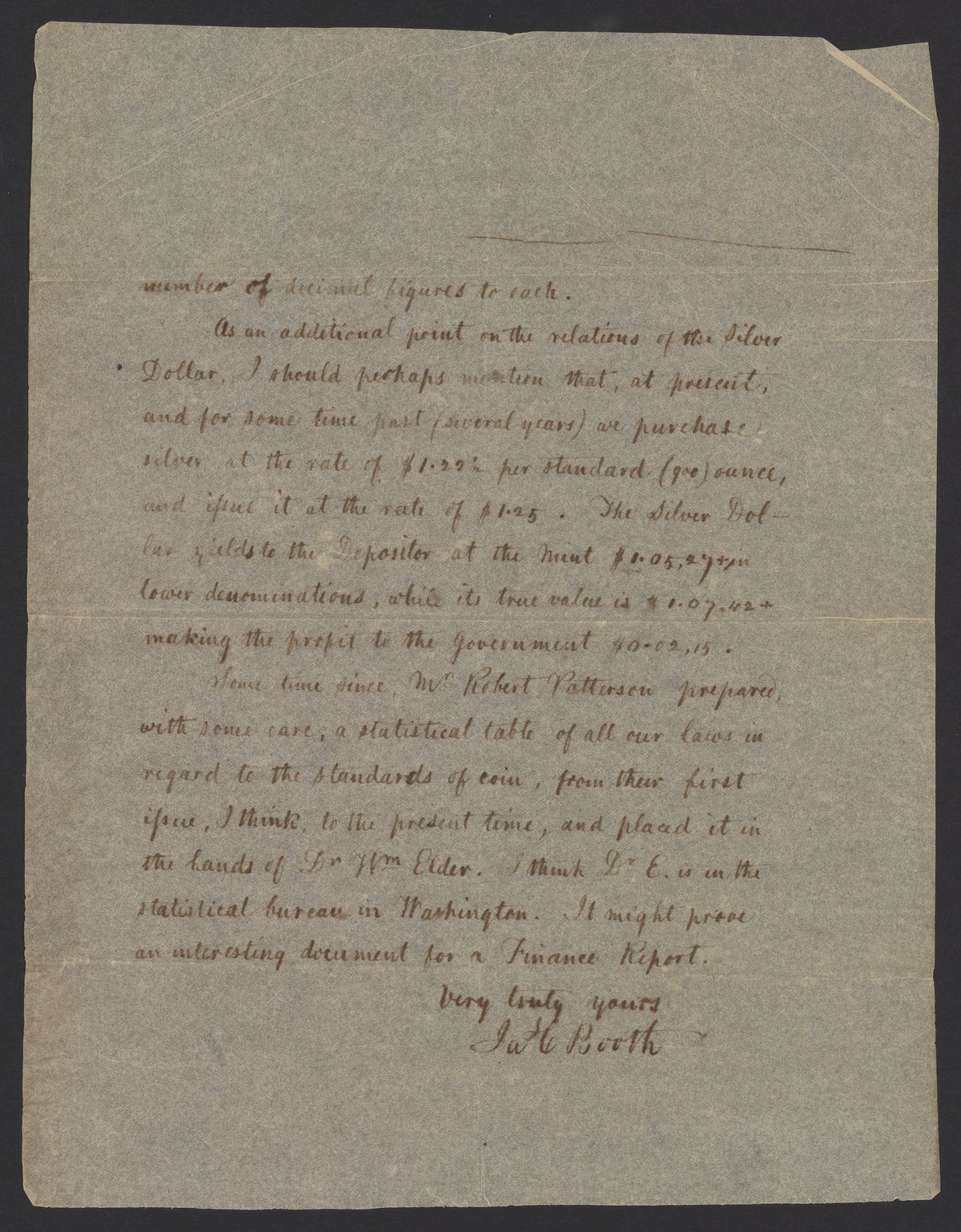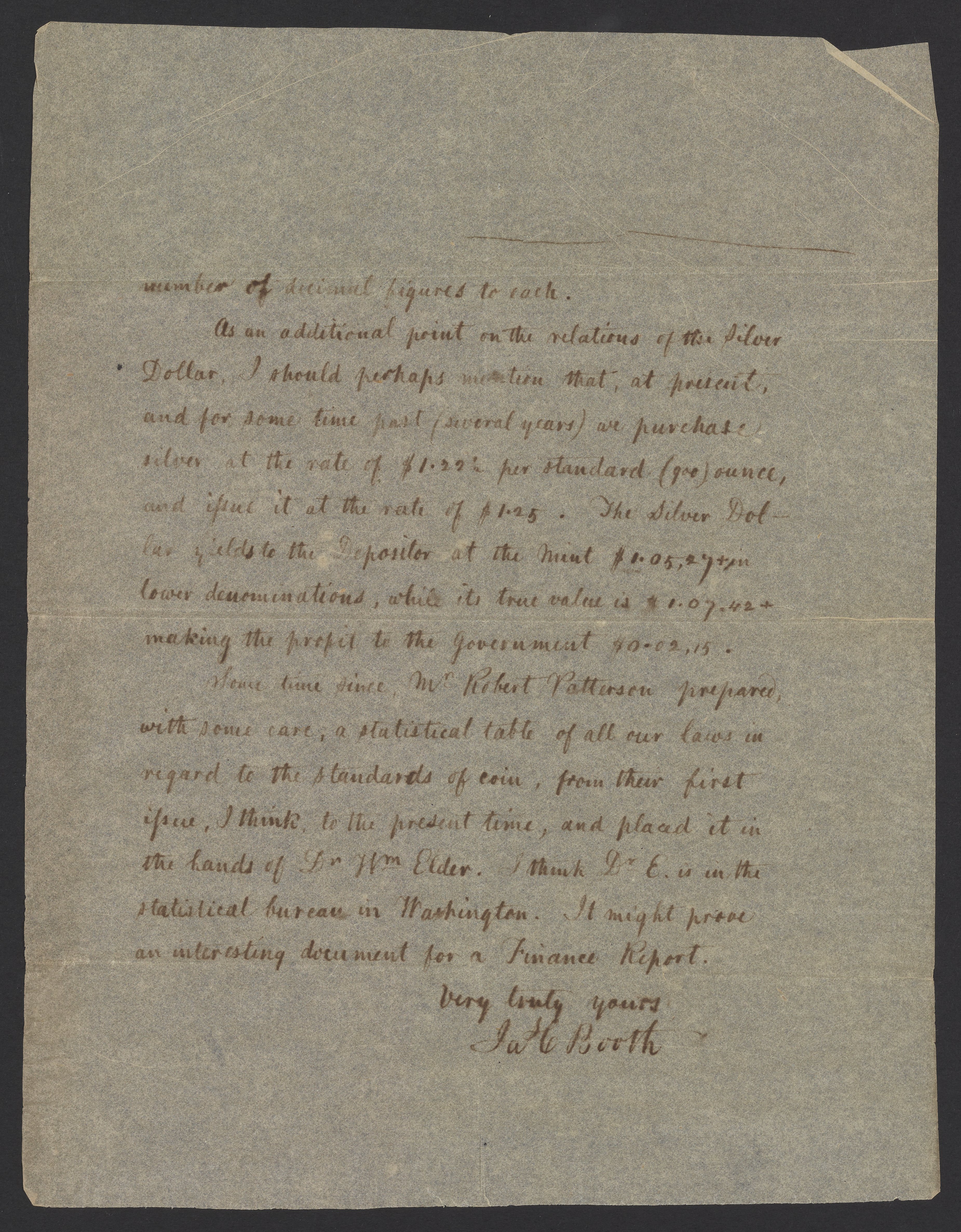 Small JPG1200 x 1489px — 398 KBLarge JPG2880 x 3573px — 2.5 MBFull-sized JPG3690 x 4578px — 3.9 MBOriginal fileTIFF — 3690 x 4578px — 48.4 MBJames Curtis Booth (1810-1888) responds to an inquiry from John Jay Knox Jr. (1828-1892), an American financier, government official, and primary author of the Coinage Act of 1873, which discontinued the use of the silver dollar. Booth describes the relative values of the United States silver dollar, half dollar, and Mexican pesos.