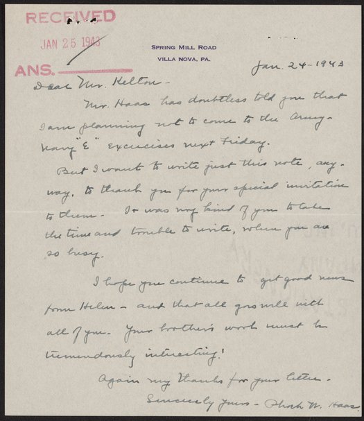 Phoebe Waterman Haas (1882–1967) thanks Stanton C. Kelton for inviting her to the Army–Navy ‘E’ Award ceremony. The Army–Navy "E" Award was given to companies whose production facilities achieved "Excellence in Production" of war materials. The award was scheduled to be presented to the employees of the Rohm and Haas Company on January 29, 1943.