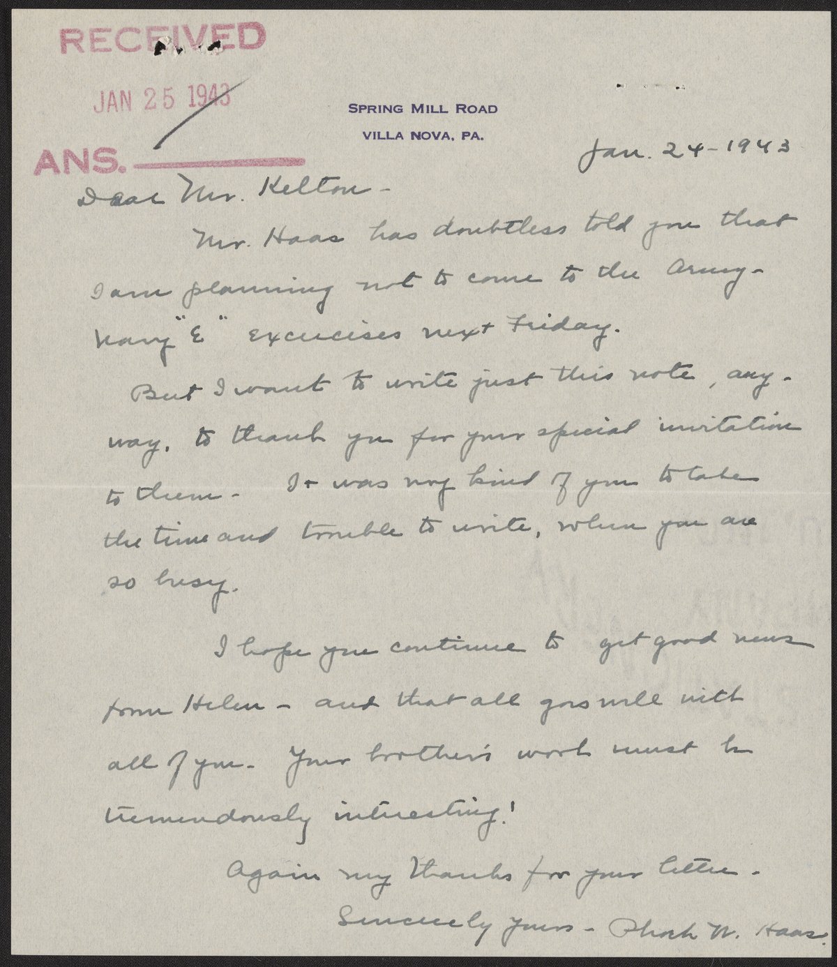 Letter from Phoebe Haas to Stanton C. Kelton, January 24, 1943