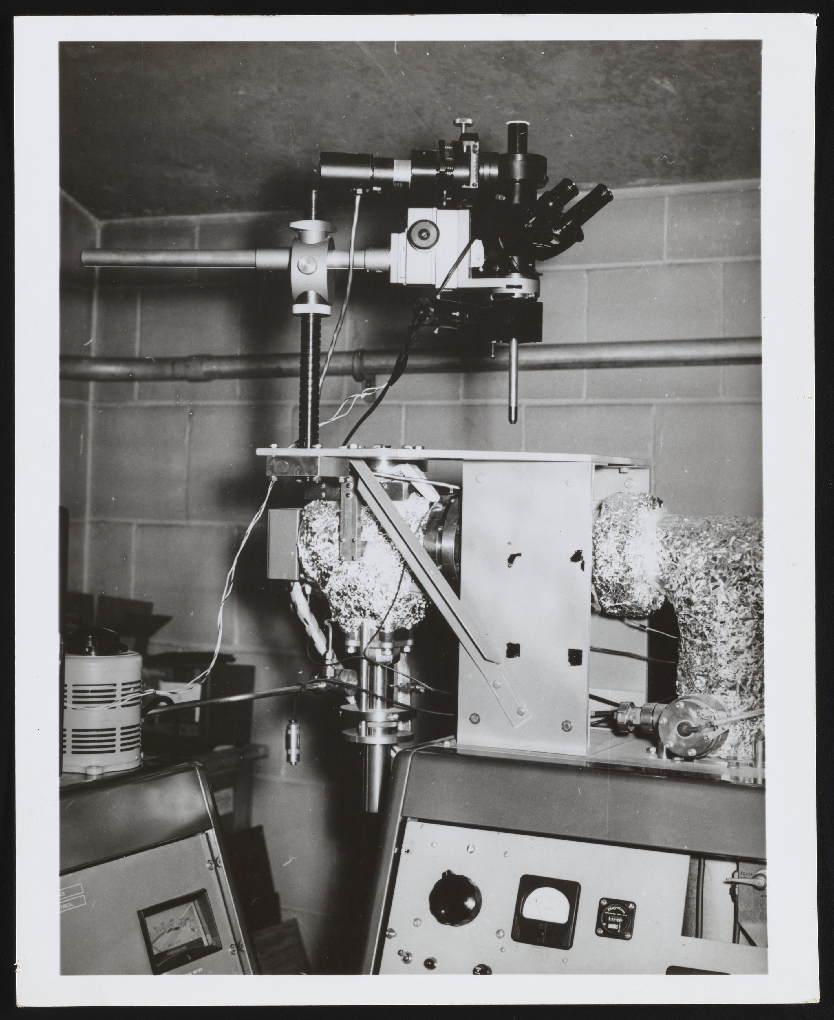 General view of unidentified accessories designed for use with a Bendix Time-of-Flight Mass Spectrometer. Several of the accessories appear to be wrapped in foil. The Time-of-Flight Mass Spectrometer (TOFMS) was the flagship analytical instrument of the Bendix Corporation.