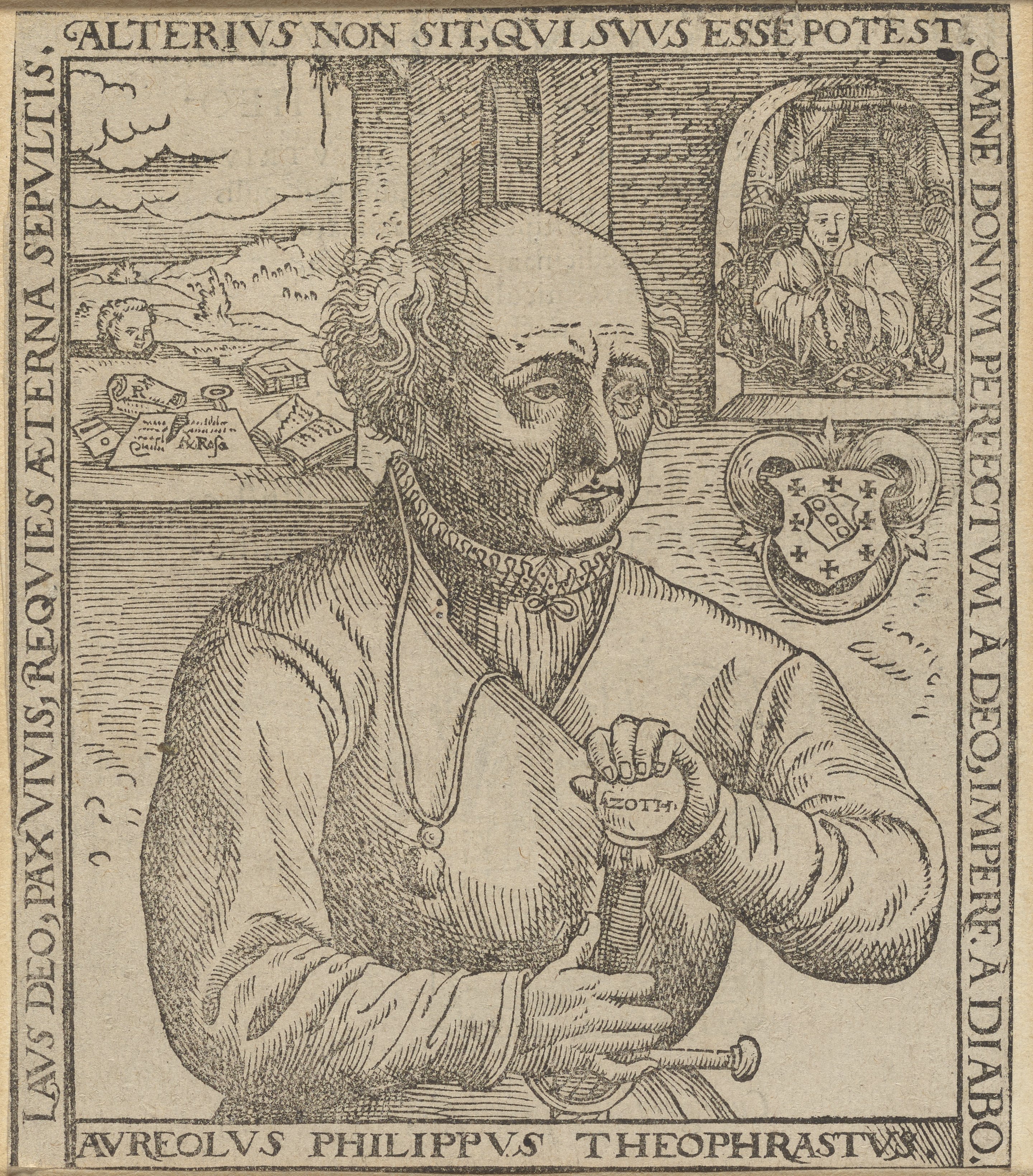 Paracelsus is shown as a man of advanced years with a balding head and a thoughtful, lined face. He grasps the pommel of a sword bearing the inscription "Azoth" in his hand and stands before a shield bearing his family crest. Believed to be the universal solvent, universal cure, and elixir of life (elixir vitae), the Azoth is said to embody all medicines, as well as the first principles of all other substances, and Paracelsus was said to have achieved the Azoth. The Latin motto surrounding this portrait praises "every perfect thing" as belonging to God, while "unfinished" things are relegated to the devil: "Laus Deo, Pax Vivis, Requies Aeterna Sepultis. Alterius Non Sit, Qui Suus Esse Potest. Omne Donum Perfectum A Deo, Imperf. A Diabo."