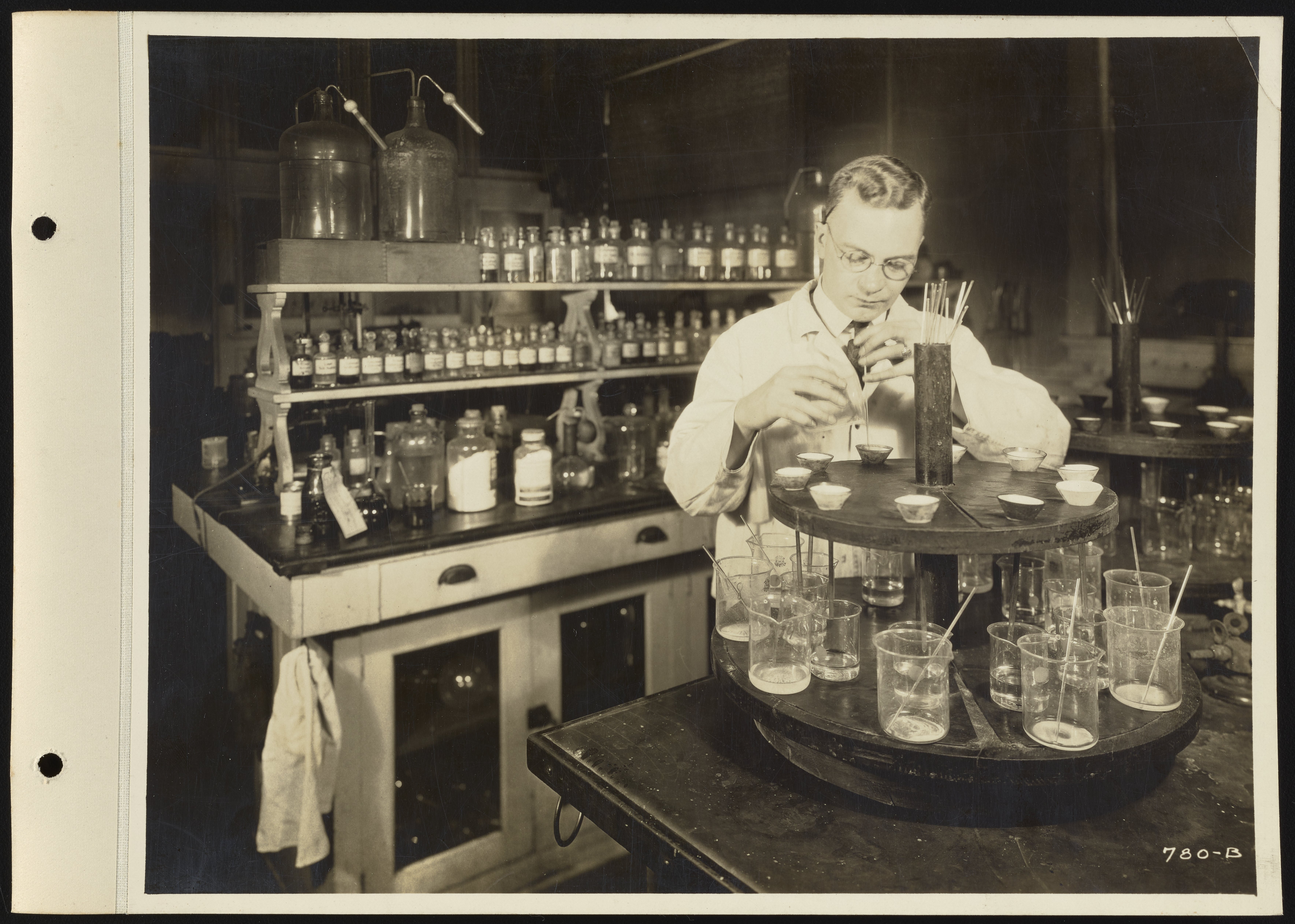 General view of employee Anton H.R. Noreen preparing samples for testing at the Dearborn Chemical Company's 35th Street laboratory and manufacturing facility located in Chicago, Illinois. Founded in 1887, the Dearborn Chemical Company was a corporate ancestor of BetzDearborn, Incorporated best known for manufacturing water treatment chemicals for use in boilers, cooling towers, and locomotives.