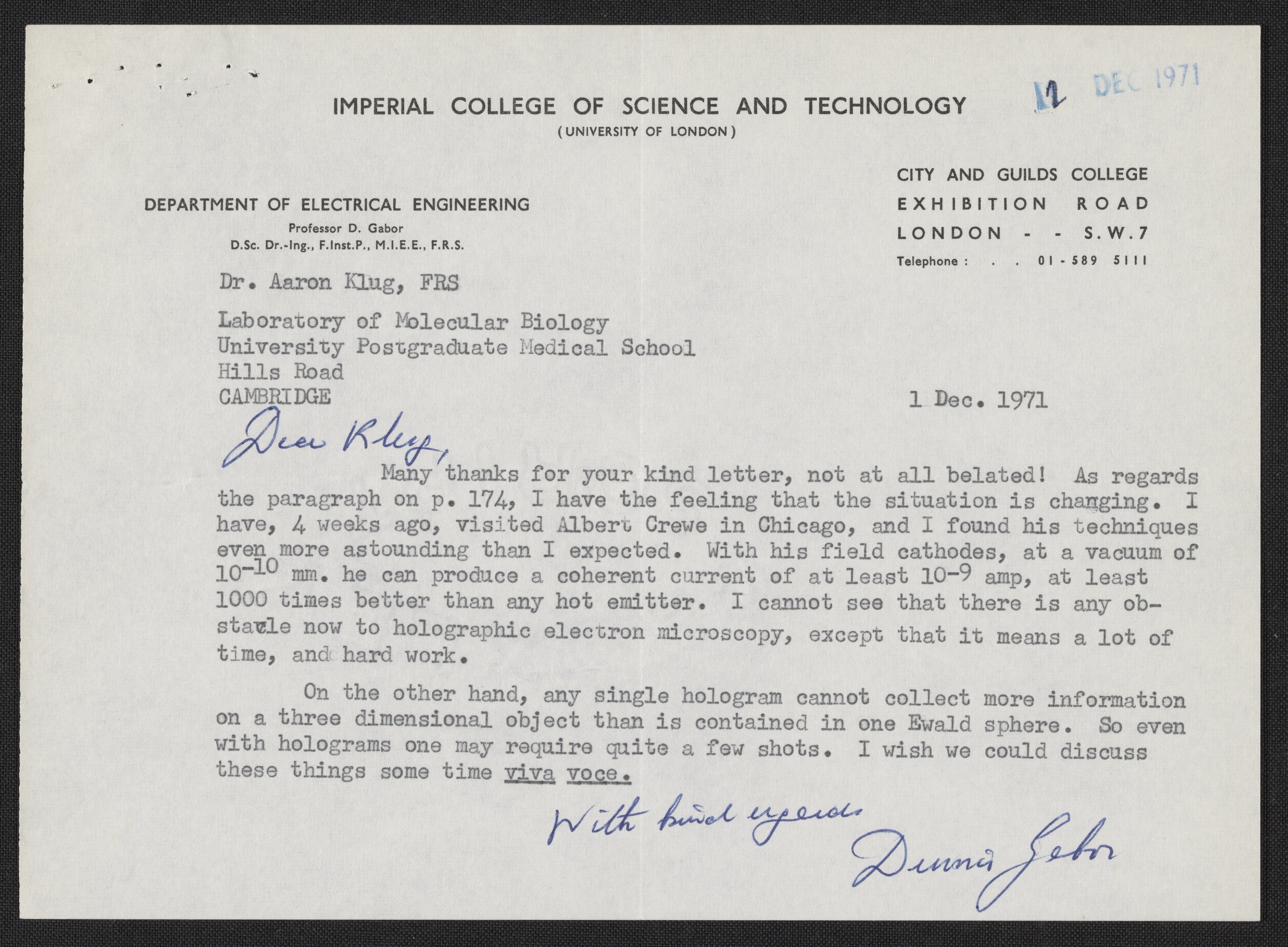 Letter from Dennis Gabor to Aaron Klug, December 1, 1971
