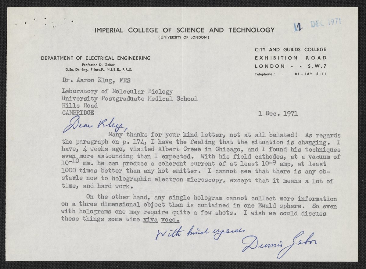 Gabor, Dennis. “Letter from Dennis Gabor to Aaron Klug, December 1, 1971,” December 1, 1971. History of Molecular Biology Collection, Box 25, Folder 18. Science History Institute. Philadelphia. https://digital.sciencehistory.org/works/f1tcxmg.