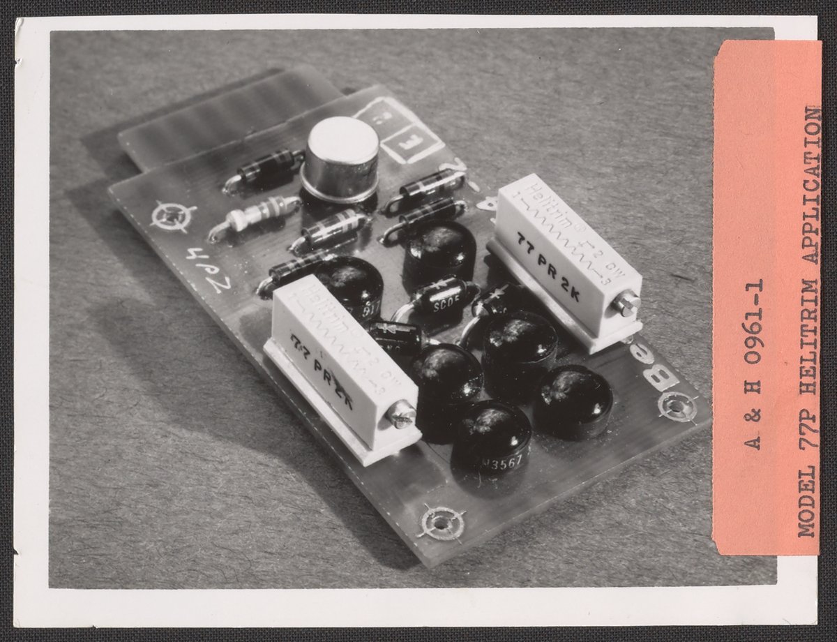 Armstrong & Hess. “Helitrim Model 77P Trimming Potentiometer on a Circuit Board,” July 1967. Beckman Historical Collection, Box 85. Science History Institute. Philadelphia. https://digital.sciencehistory.org/works/f4752h07h.