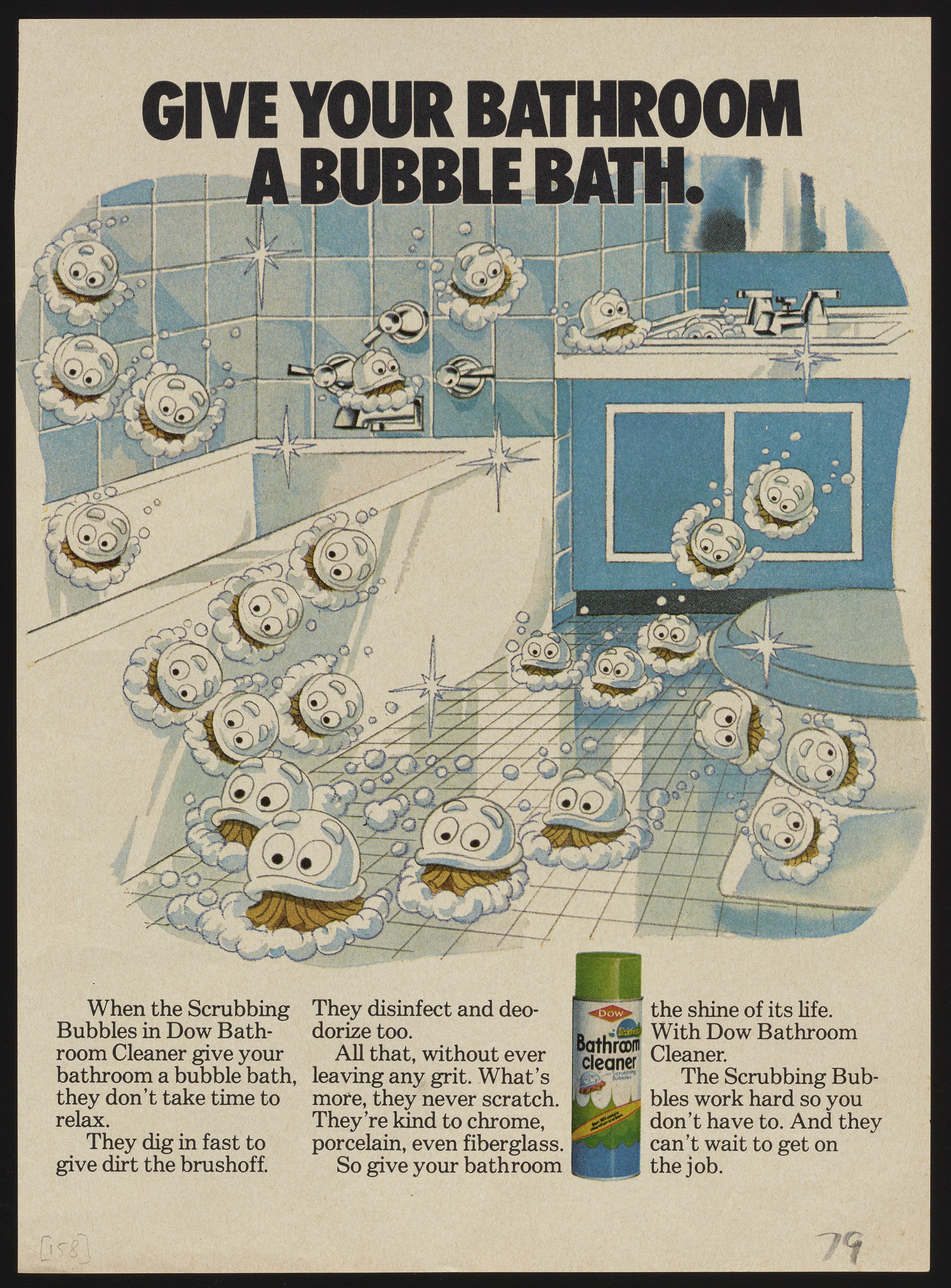 Dow Chemical Company. “Give Your Bathroom a Bubble Bath,” November 1, 1979. Advertisements from the Dow Chemical Historical Collection, Box 7. Science History Institute. Philadelphia. https://digital.sciencehistory.org/works/f4752h41t.