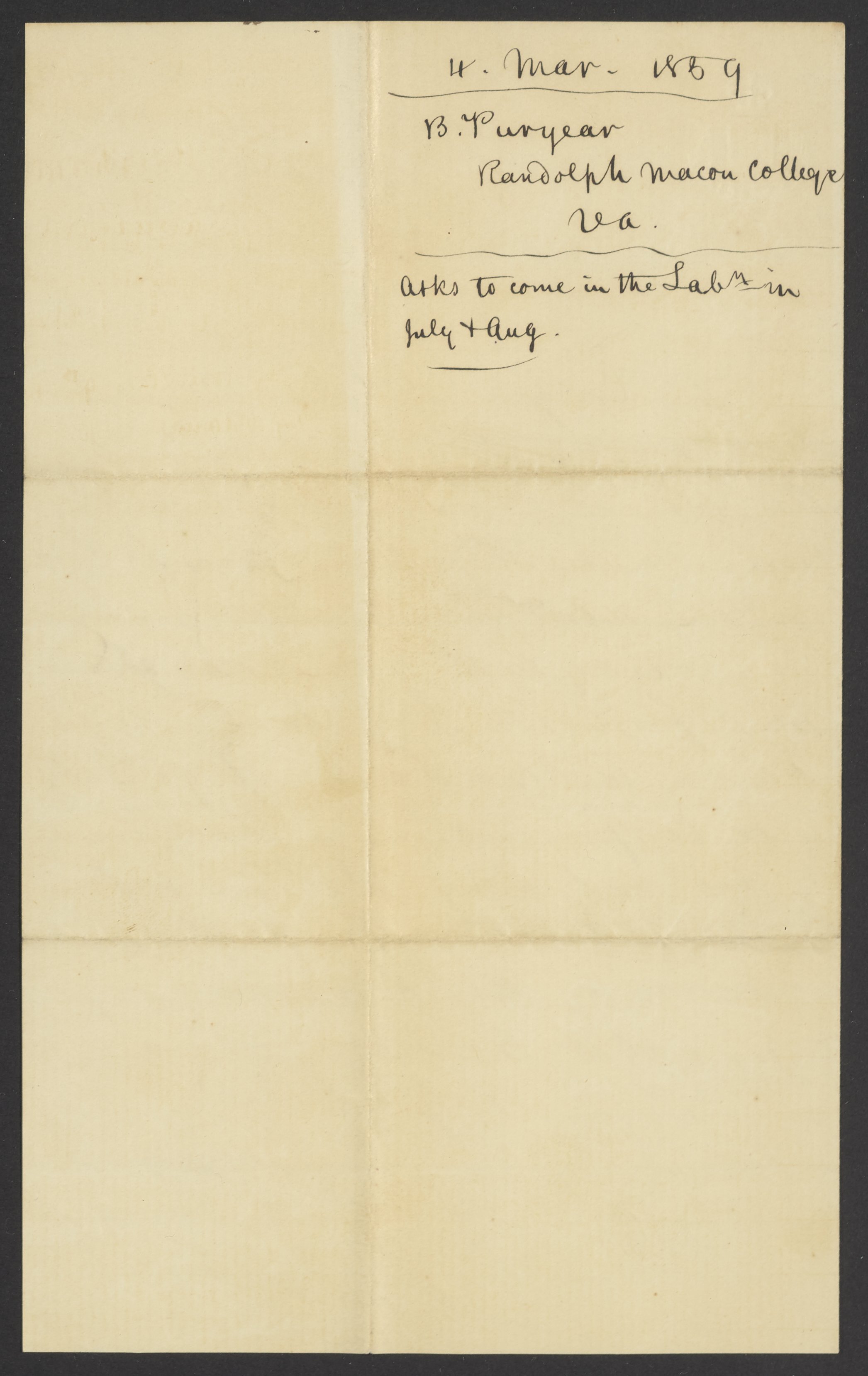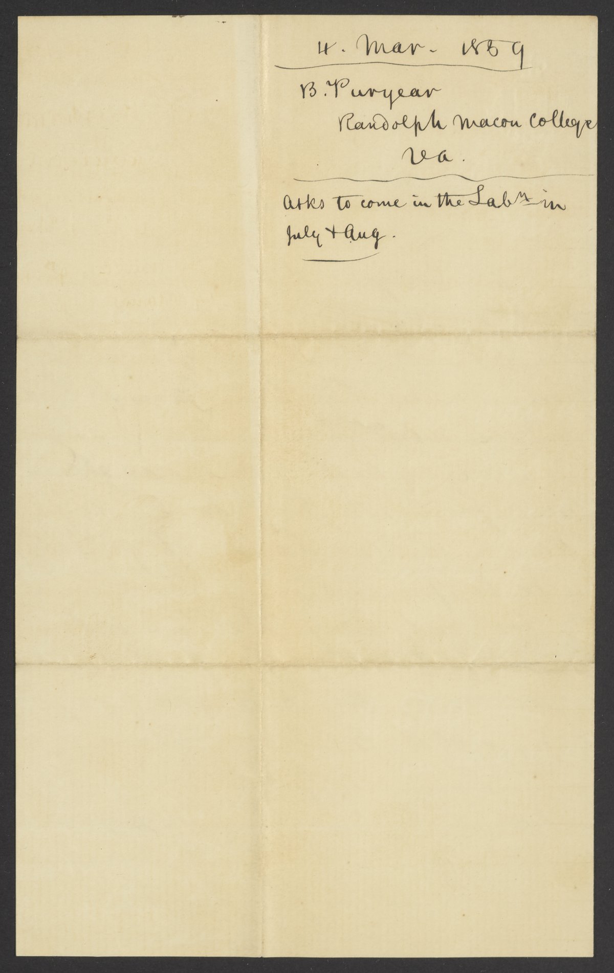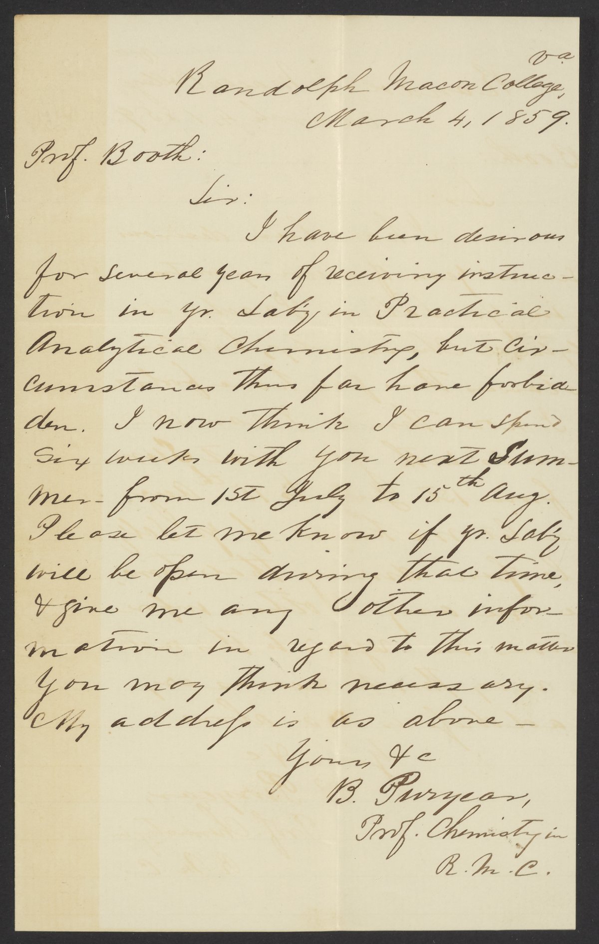 Letter from B. Puryear to James Curtis Booth, March 4, 1859