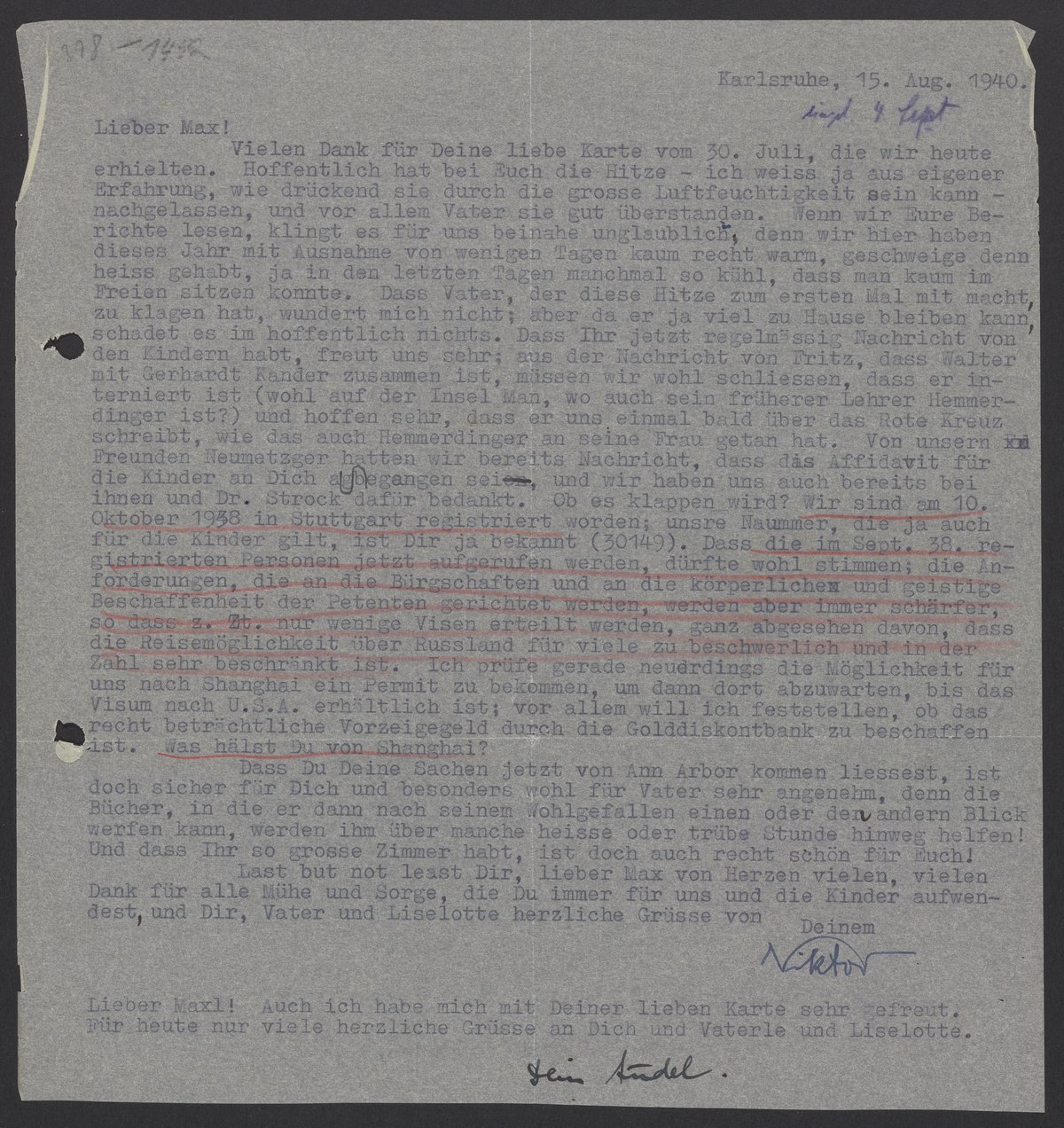 Vielen Dank für Deine liebe Karte vom 30. Juli, die wir heute erhielten. Hoffentlich hat bei Euch die Hitze – ich weiss ja aus einiger Erfahrung , wie drückend sie durch die grosse Luftfeuchtigkeit sein – nachgelassen, und vor allem Vater sie gut überstanden. Wenn wir Eure Berichte lesen, klingt es für uns beinahe unglaublich, denn wir hier haben dieses Jahr mit Ausnahme von wenigen Tagen kaum recht warm, geschweige denn heiss gehabt, ja in de letzten Tagen manchmal so kühl, dass man kaum im Freien sitzen konnte. Dass Vater, der diese Hitze zum ersten Mal mit macht, zu klagen hat, wundert mich nicht; aber da er ja viel zu Hause bleiben kann, schadet es im hoffentlich nichts. Dass Ihr jetzt regelmassig Nachricht von den Kindern habt, freut uns sehr; aus der Nachricht von Fritz, dass Walter mit Gerhard Kander zusammen ist, müssen wir wohl schliessen, dass er interniert ist (wohl auf der Insel Man, wo auch sein früherer Lehrer Hemmerdingner ist?) und hoffen sehr, dass er uns einmal bald über das Rote Kreuz schreibt, wie das auch Hemmerdinger an seine Frau getan hat. Von unsern Freunden Neumetzger hatten wir bereits Nachricht, dass das Affidavit für die Kinder an Dich abgegangen sei, und wir haben uns auch bereits bei ihnen und Dr. Strock dafür bedankt. Ob es klappen wird? Wir sind am 10. Oktober 1938 in Stuttgart registriert worden; unsere Nummer die ja auch für die Kinder gilt, ist Dir ja bekannt (30149). Dass die im Sept. 38 registrierten Personen jetzt aufgerufen werden, dürfte wohl stimmen; die Anforderungen, die an die Bürgschaften und an die körperliche und geistige Beschaffenheit der Petenten gerichtet werden, werden aber immer schärfer, so dass z.Zt. nur wenige Visen erteilt werden, ganz abgesehen davon, dass die Reisemöglichkeit über Russland für viele zu beschwerlich und in der Zahl sehr beschränkt ist. Ich prüfe gerade neuerdings die Möglichkeit für uns nach Shanghai ein Permit zu bekommen, um dann dort abzuwarten, bis das Visum nach U.S.A. erhältlich ist; vor allem will ich feststellen, ob das recht beträchtliche Vorzeigegeld durch die Golddiskontbank zu beschaffen ist. Was hälst Du von Shanghai?