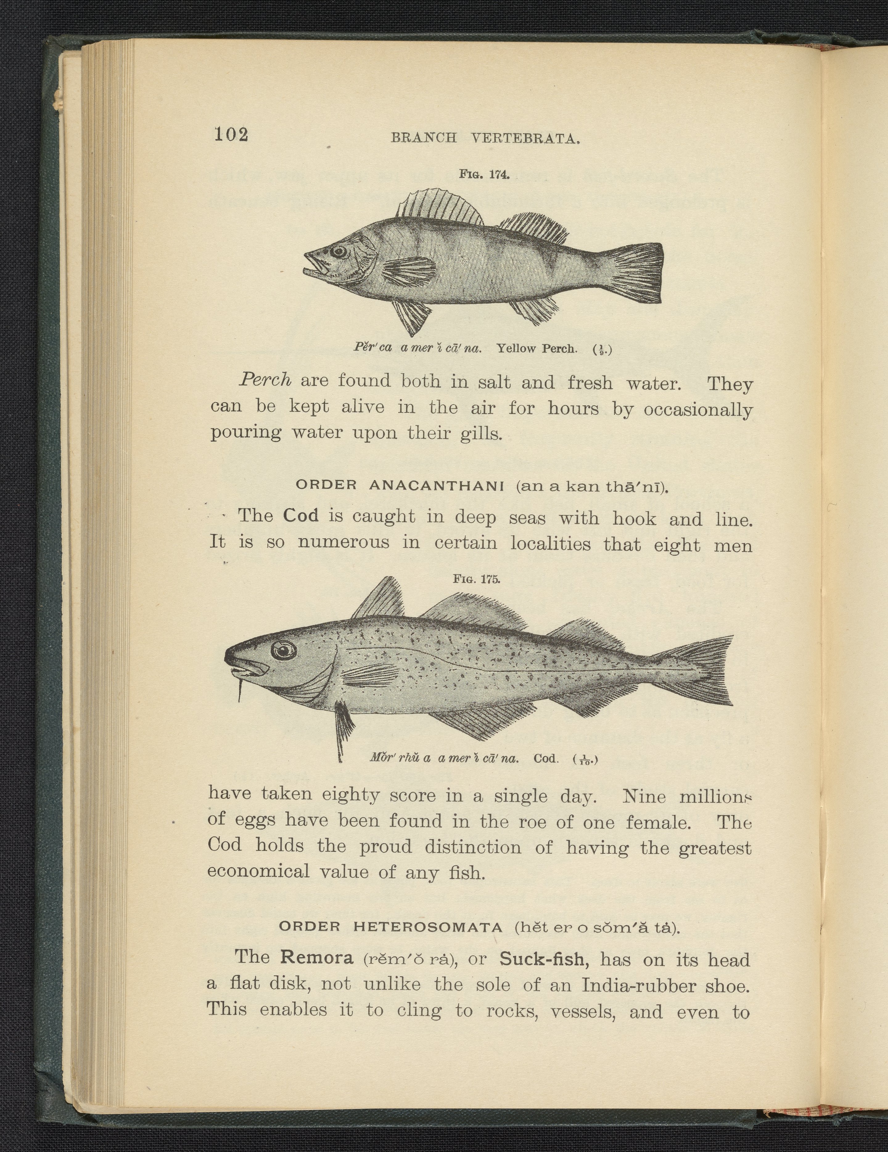Steele, Joel Dorman, and Jenks, J. W. P. (John Whipple Potter). “Figure 174. Yellow Perch. Figure 175. Cod.” Popular Zoology. New York, New York: Chautauqua Press, 1887. https://digital.sciencehistory.org/works/f6qfjvd.