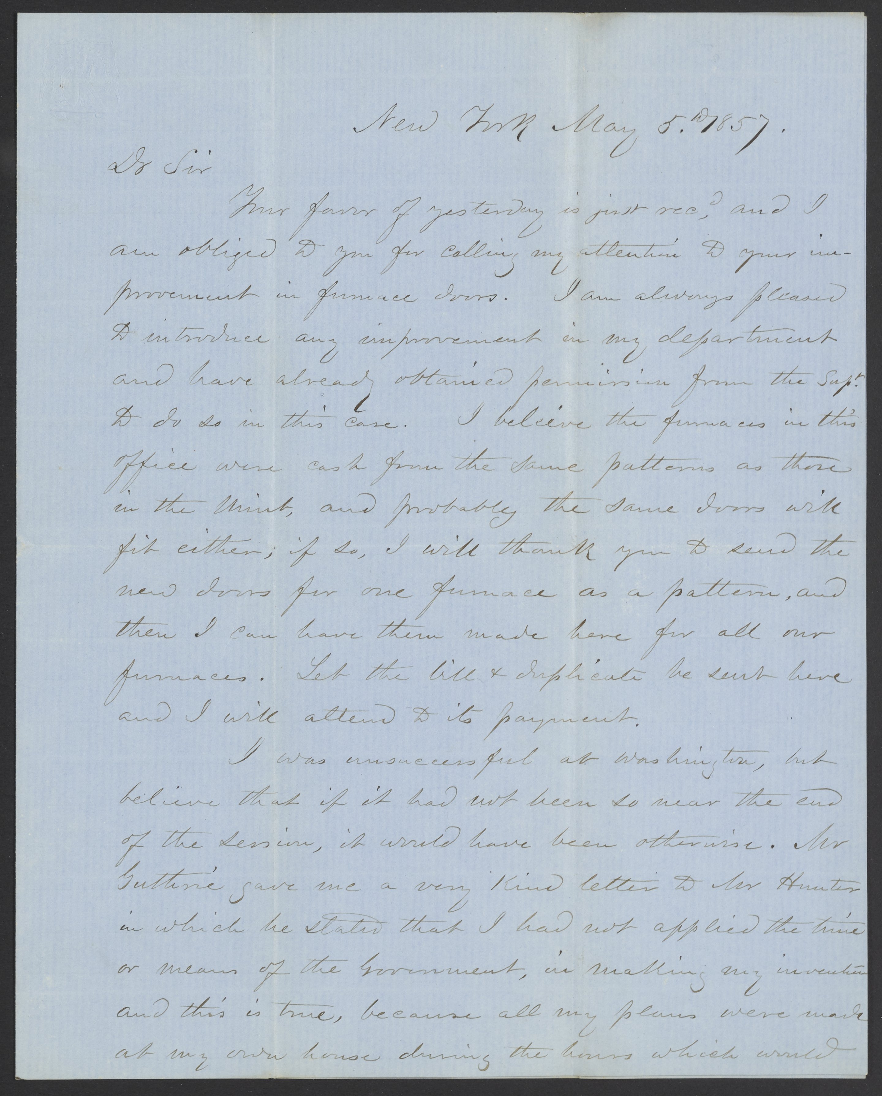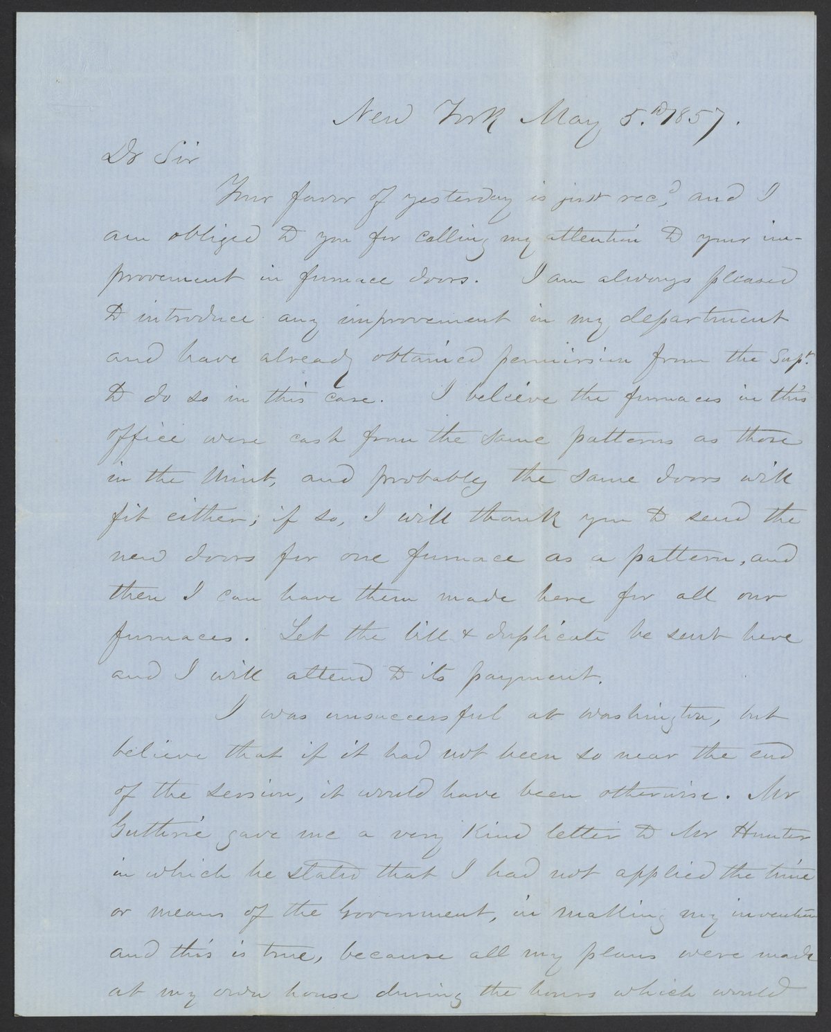 Small JPG1200 x 1491px — 232 KBLarge JPG2880 x 3578px — 1.0 MBFull-sized JPG3272 x 4065px — 1.3 MBOriginal fileTIFF — 3272 x 4065px — 38.1 MBEdward N. Kent of the United States Assay Office at New York thanks James Curtis Booth (1810-1888) for sending the description of improvements made to furnace doors.