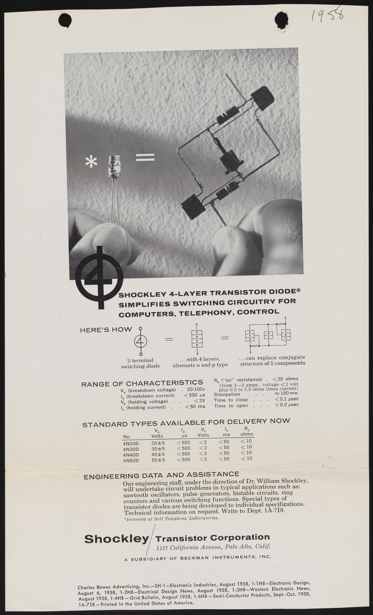 Beckman Instruments, Inc. “Shockley 4-Layer Transistor Diode Simplifies Switching Circuitry for Computers, Telephony, Control,” 1958. Beckman Historical Collection, Box 49, Folder 15. Science History Institute. Philadelphia. https://digital.sciencehistory.org/works/f7623c581.