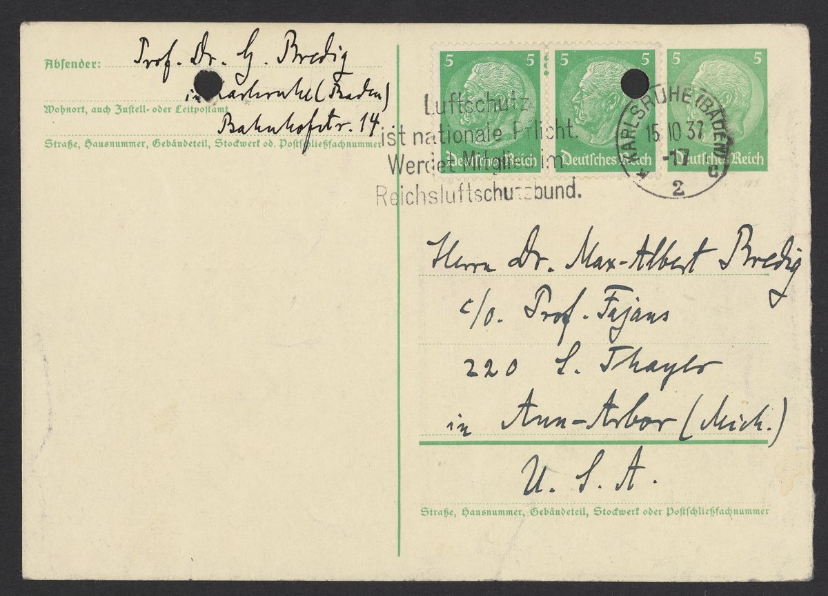 Bredig, Georg. “Postcard from Georg Bredig to Max Bredig, October 15, 1937,” October 25, 1937. Papers of Georg and Max Bredig, Box 7, Folder 13. Science History Institute. Philadelphia. https://digital.sciencehistory.org/works/f7j28ck.